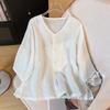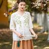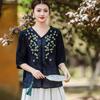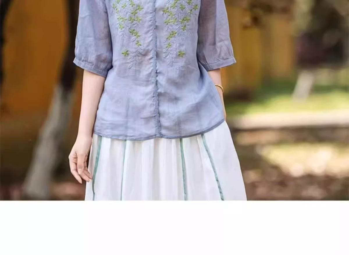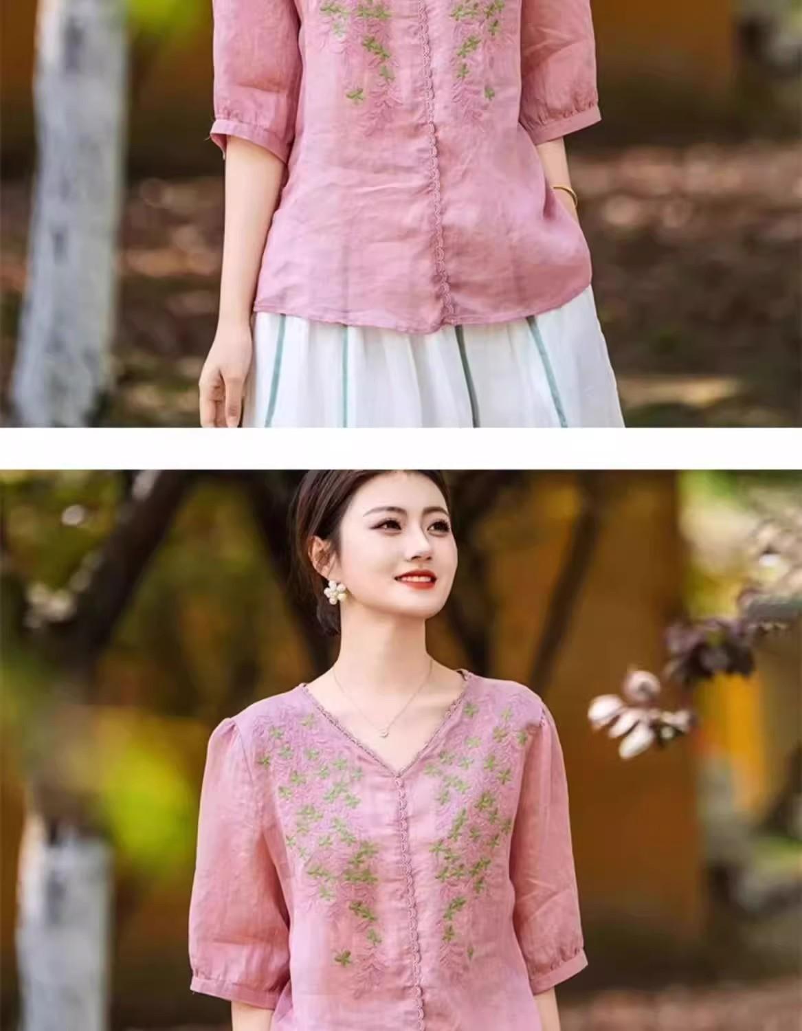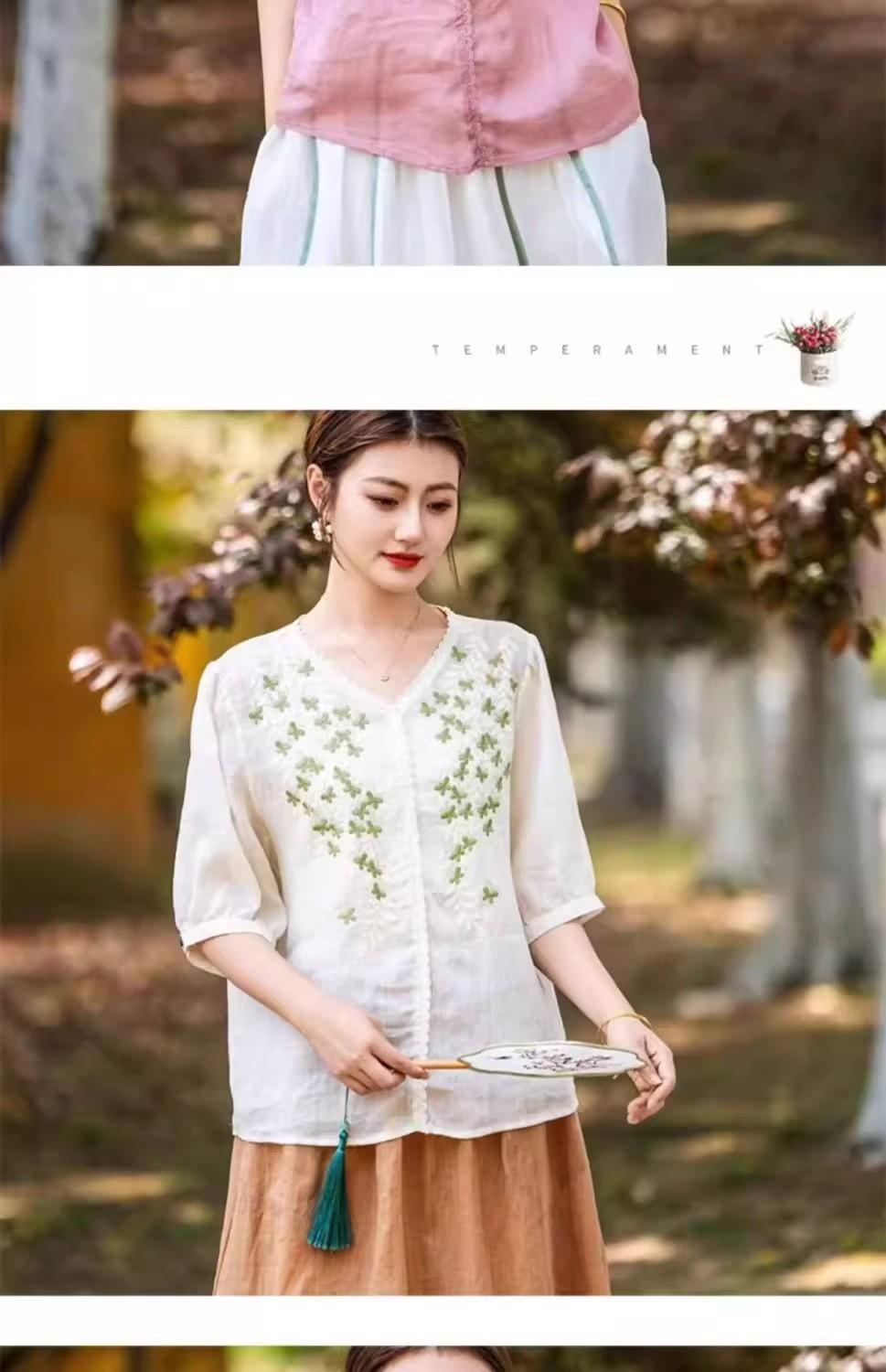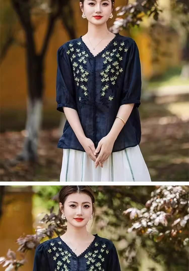 2025 Nuevas Camisas de Verano de Algodón y Lino Sueltas con Cuello en V Modernas Elegantes Camisetas Bordadas Tops Delgados Tops de Mujer