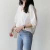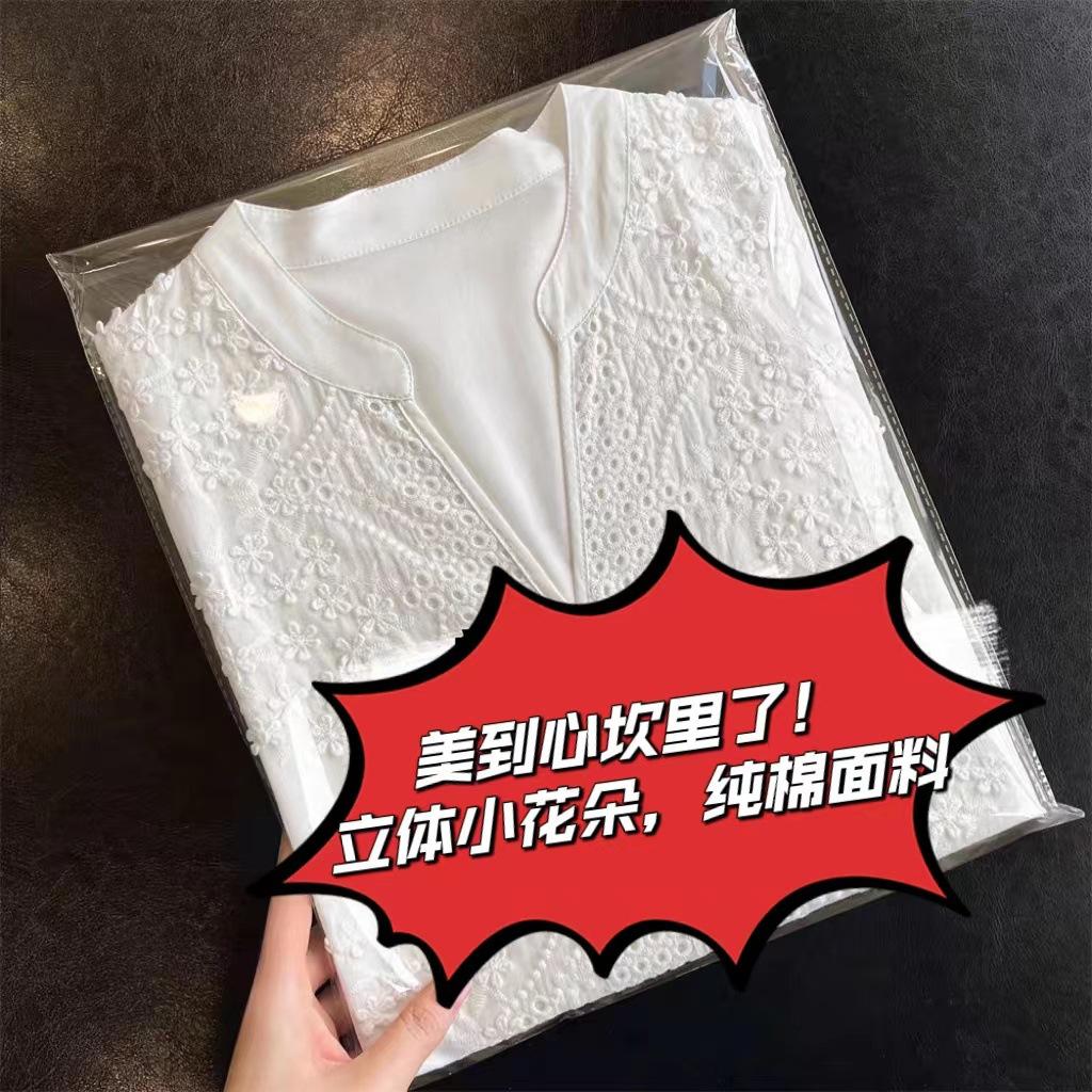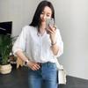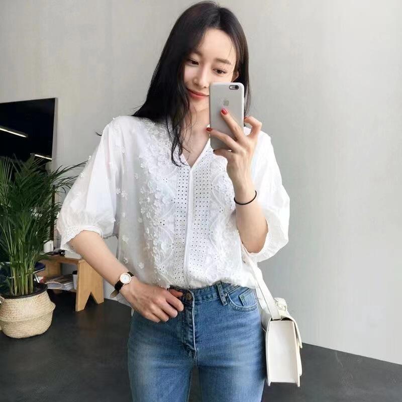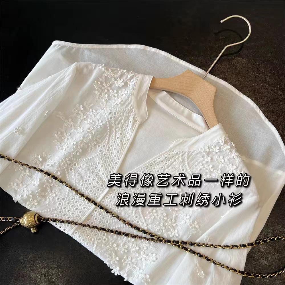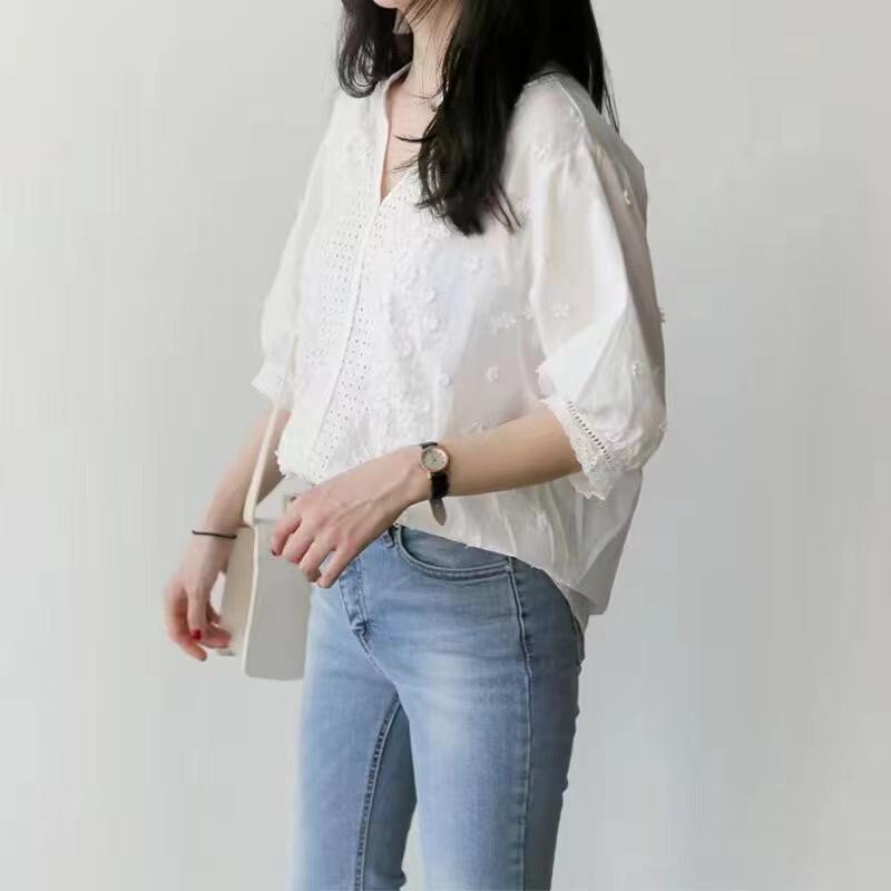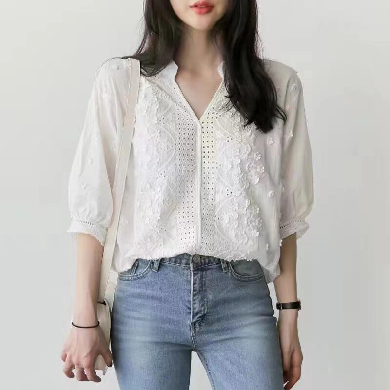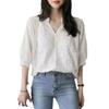 Coreano Retro 2025 Estilo Xia Hong Kong Chic Top Suelto y Versátil Camisa Pequeña Simple Bordada Recortada Camisa con Cuello en V para Mujer