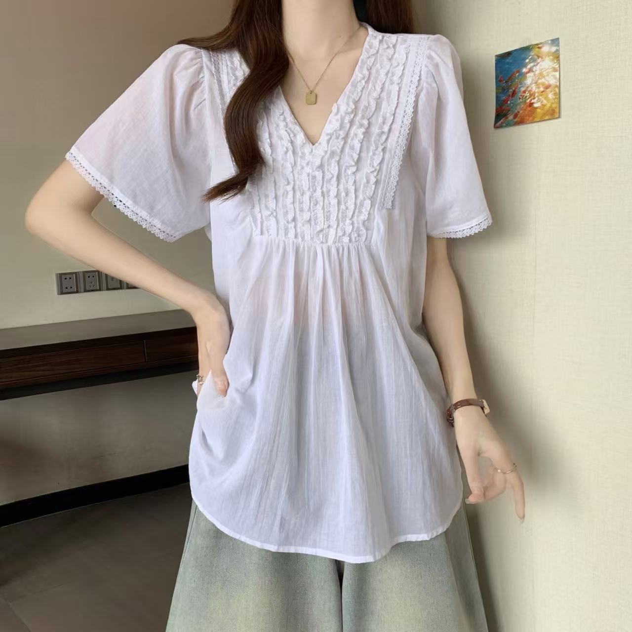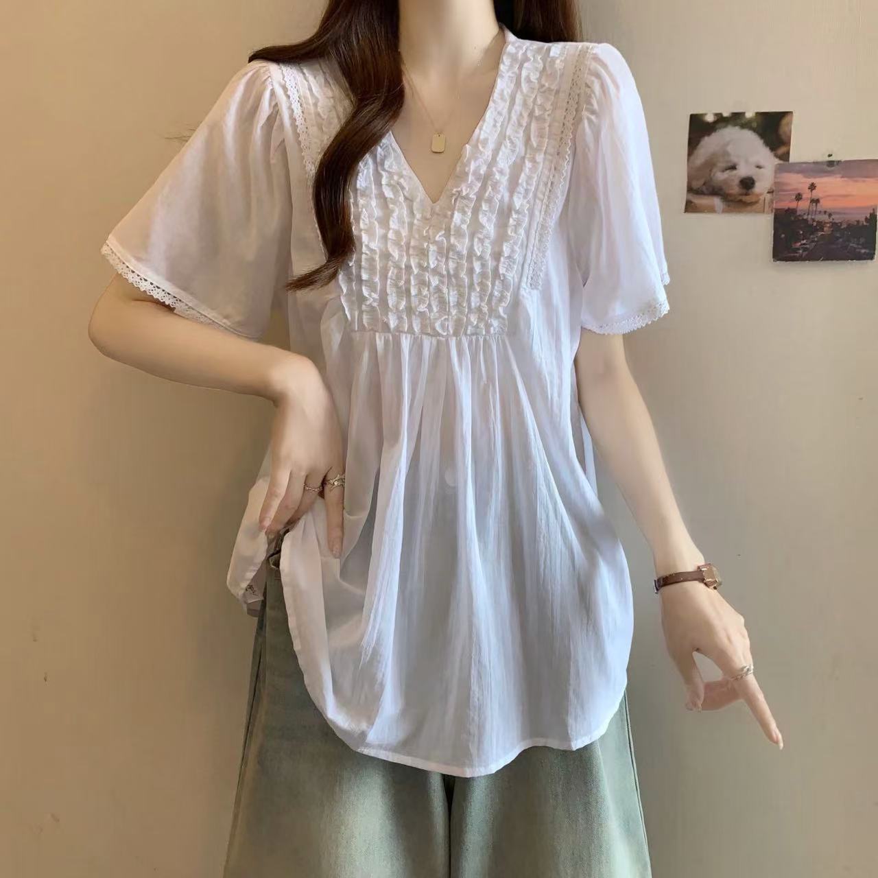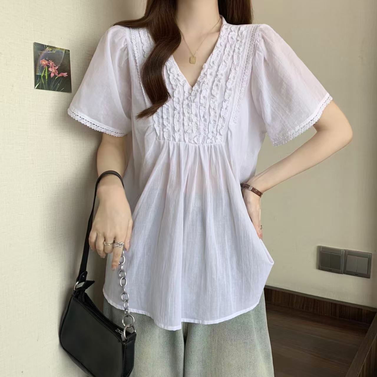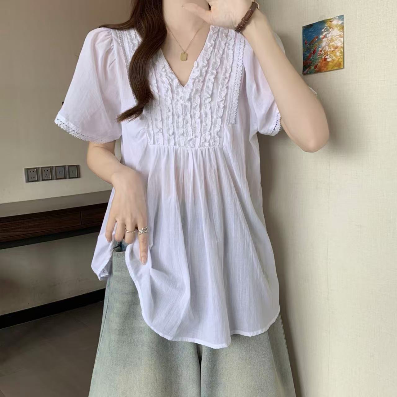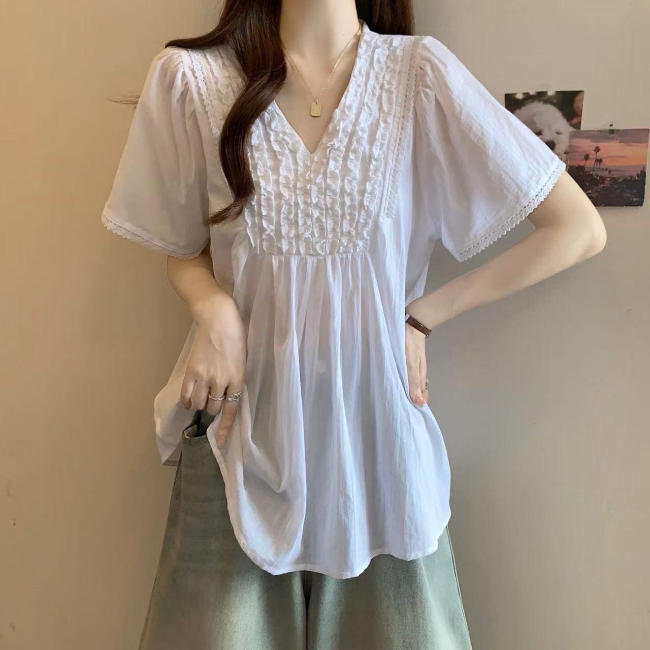 Foto Real de Cuello Gordo Nuevo de Verano, Hermosas Mangas Abullonadas, Camisa de Manga Corta de Color Sólido Talla Grande Cubre Vientre para Mujer