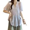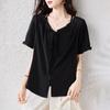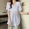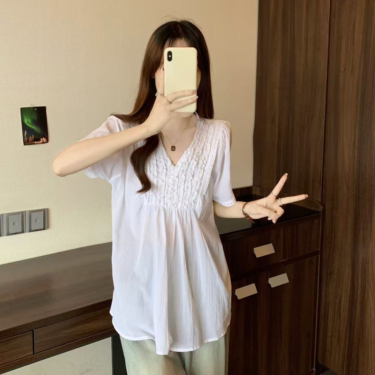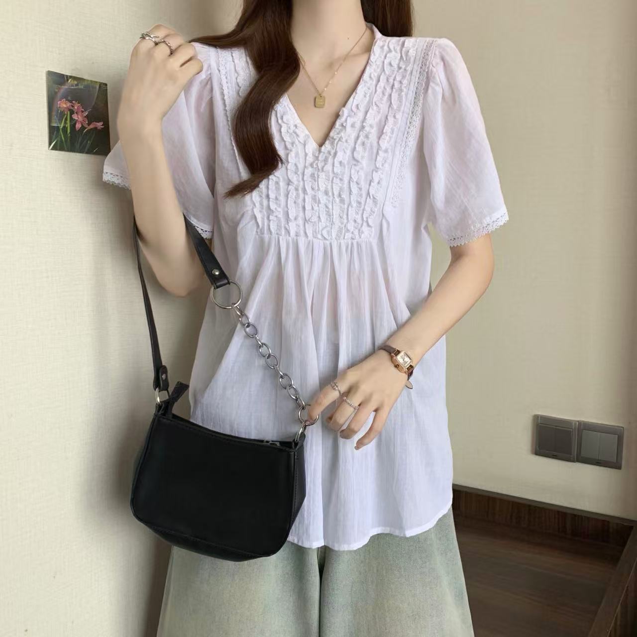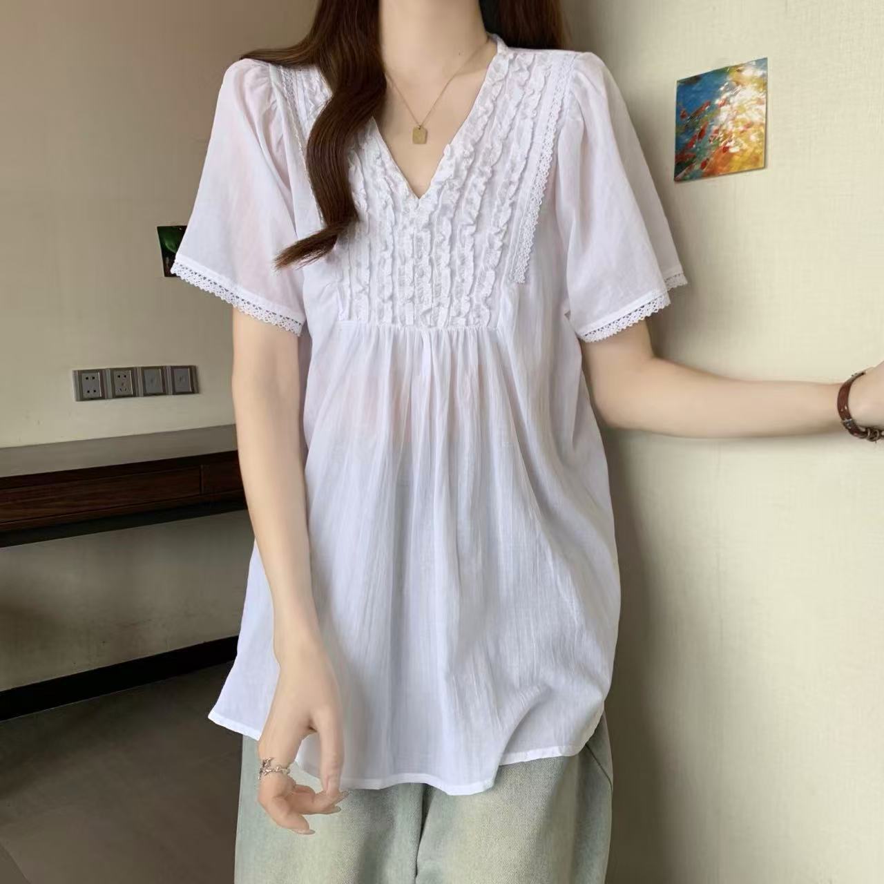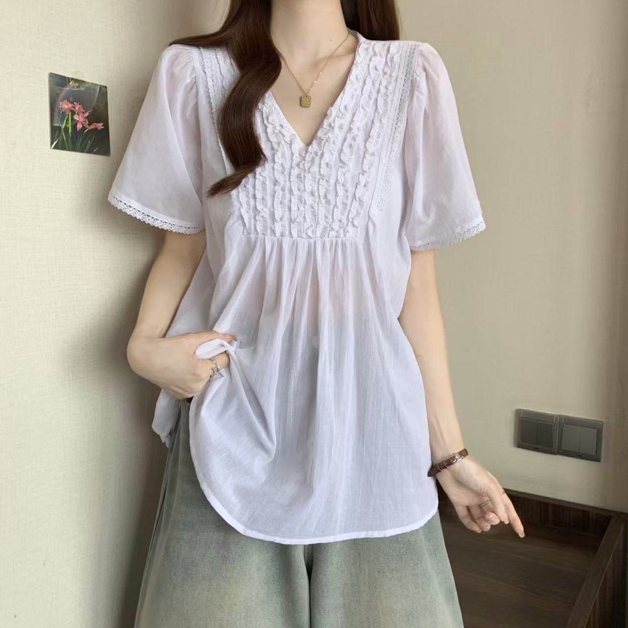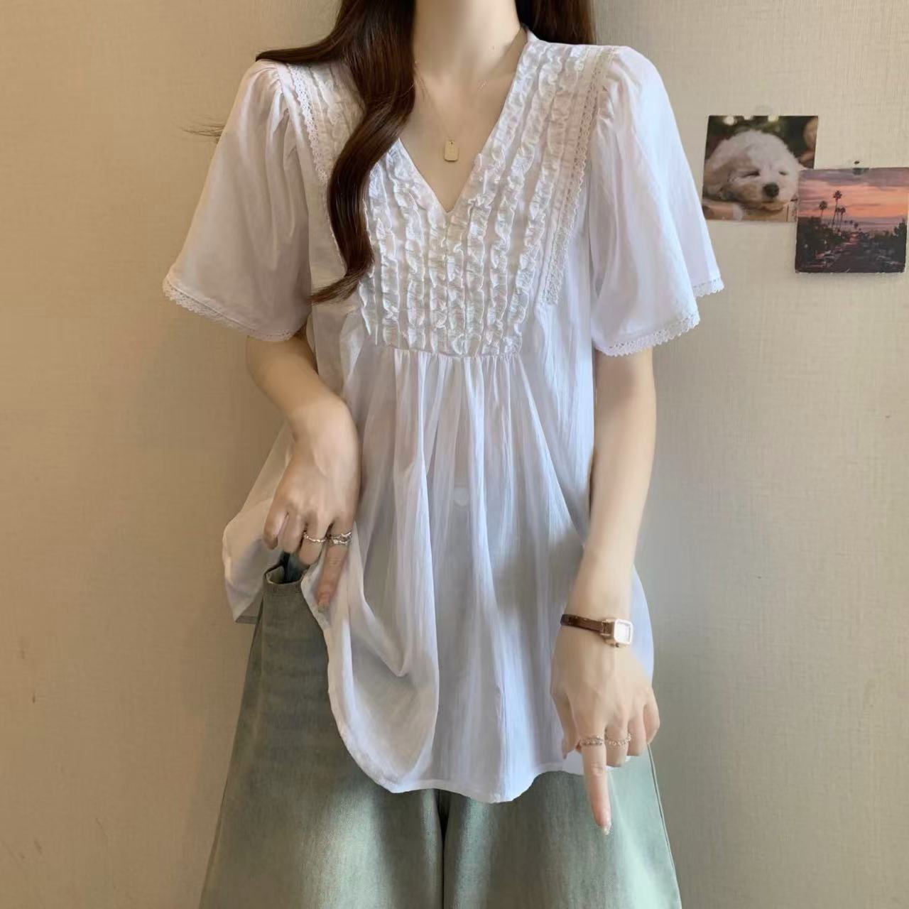 Foto Real de Cuello Gordo Nuevo de Verano, Hermosas Mangas Abullonadas, Camisa de Manga Corta de Color Sólido Talla Grande Cubre Vientre para Mujer