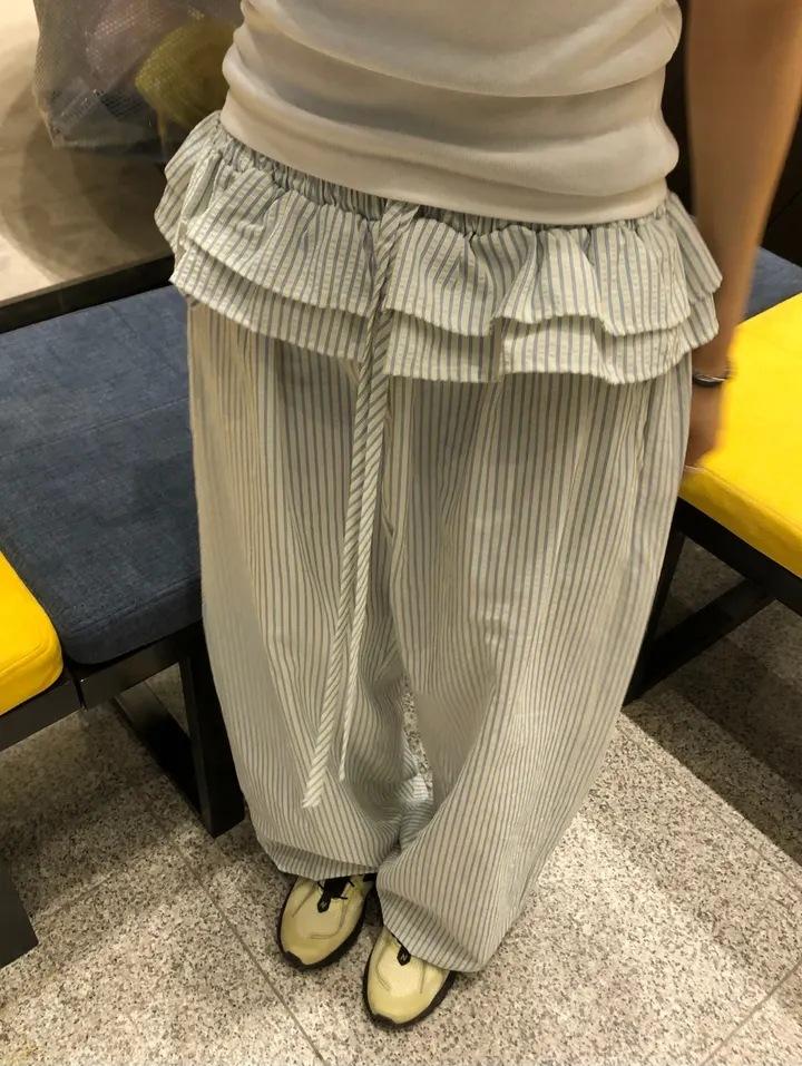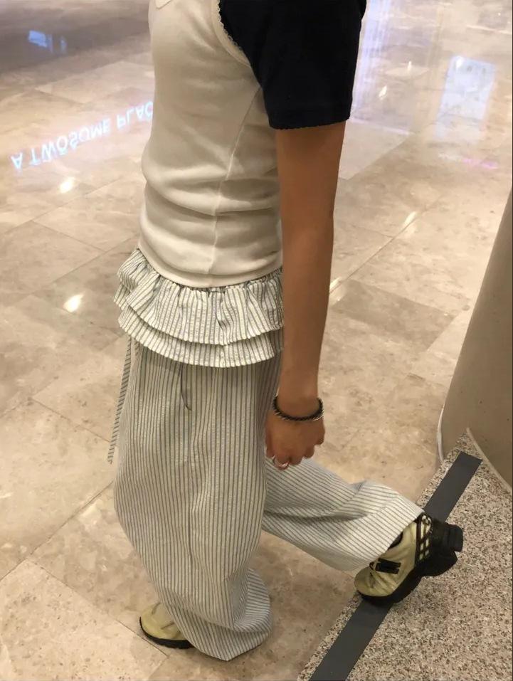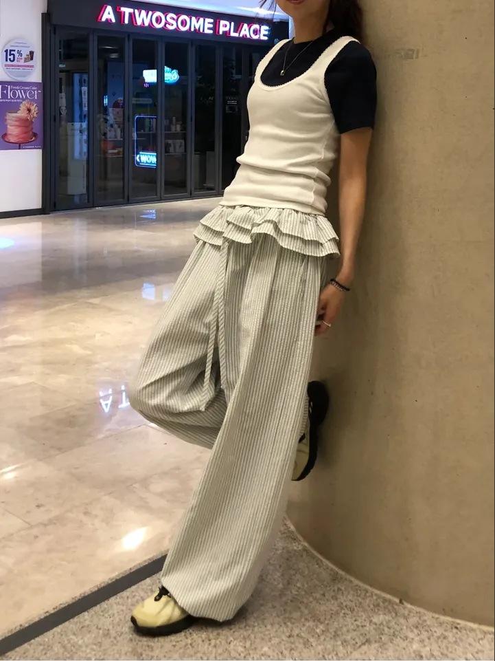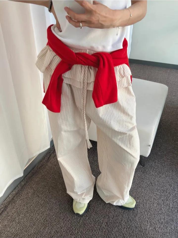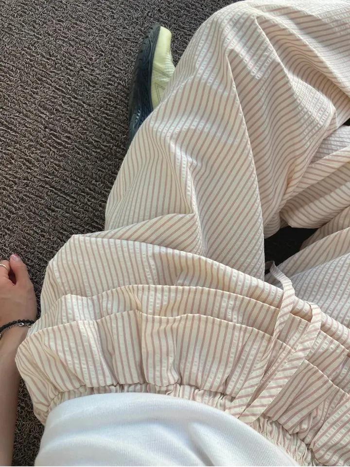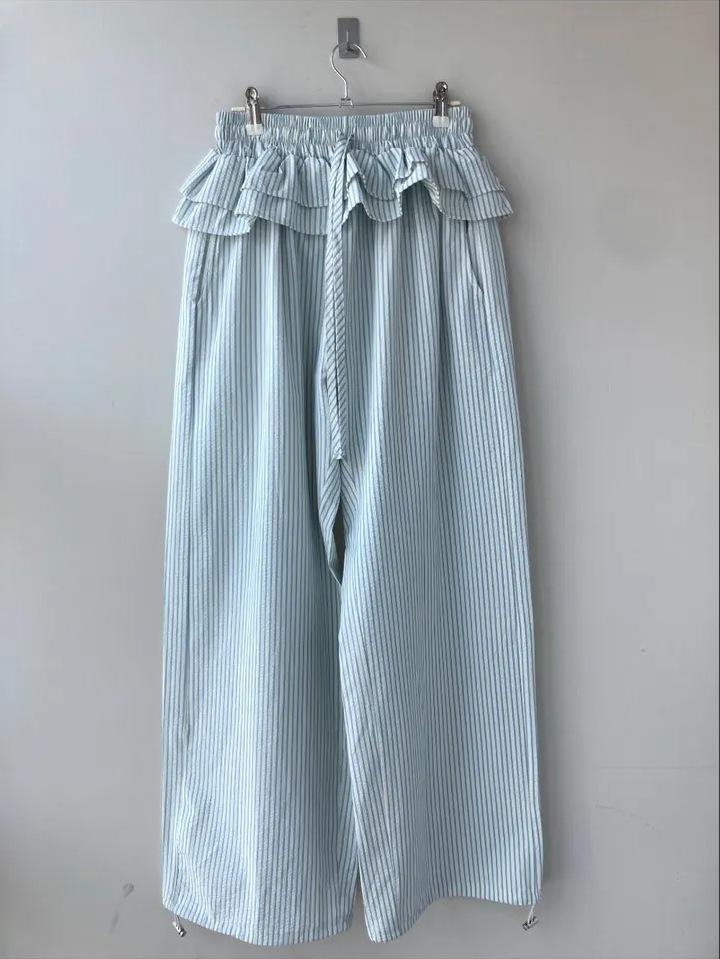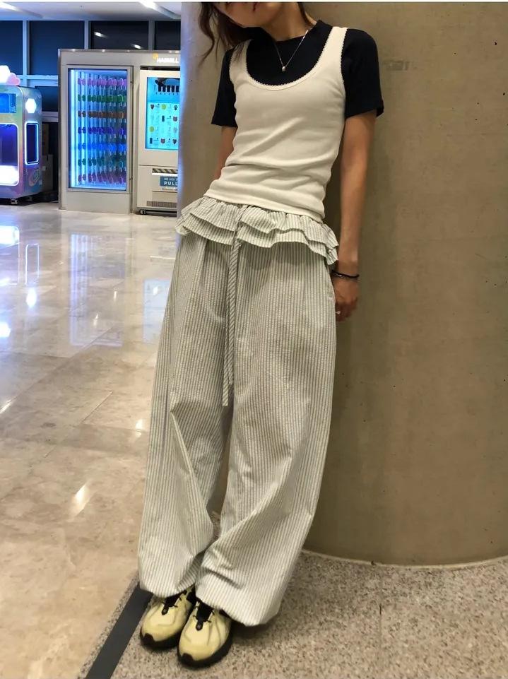 Pantalones Casuales Simples Estilo Japonés y Coreano para Chica Ins con Pliegues, Rayas Verticales, Dobladillo con Volantes y Cordón Ajustable de Pierna Ancha