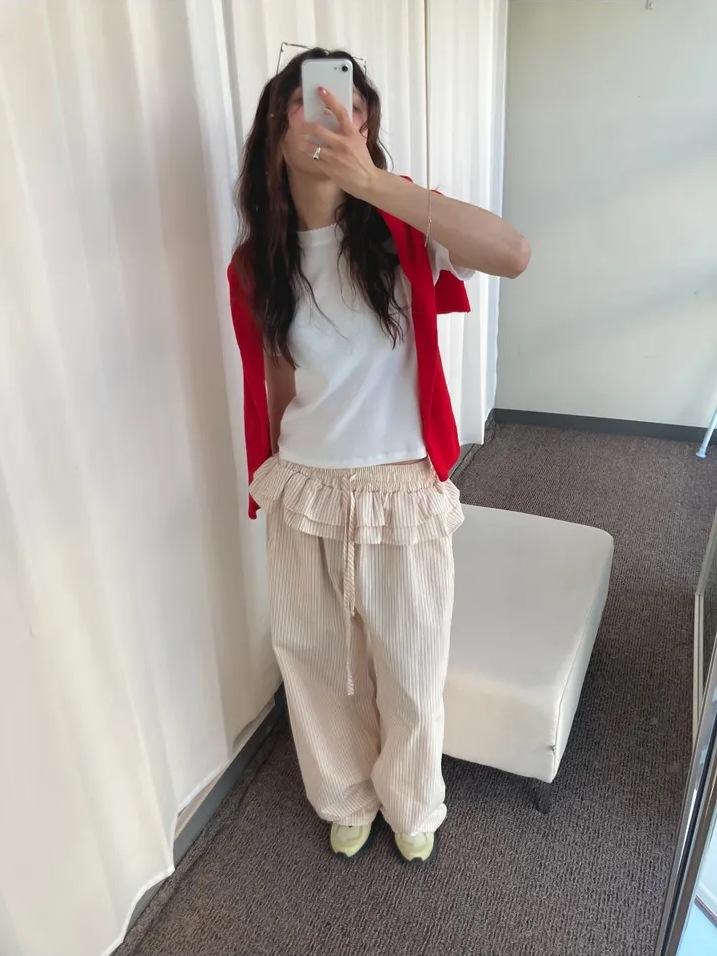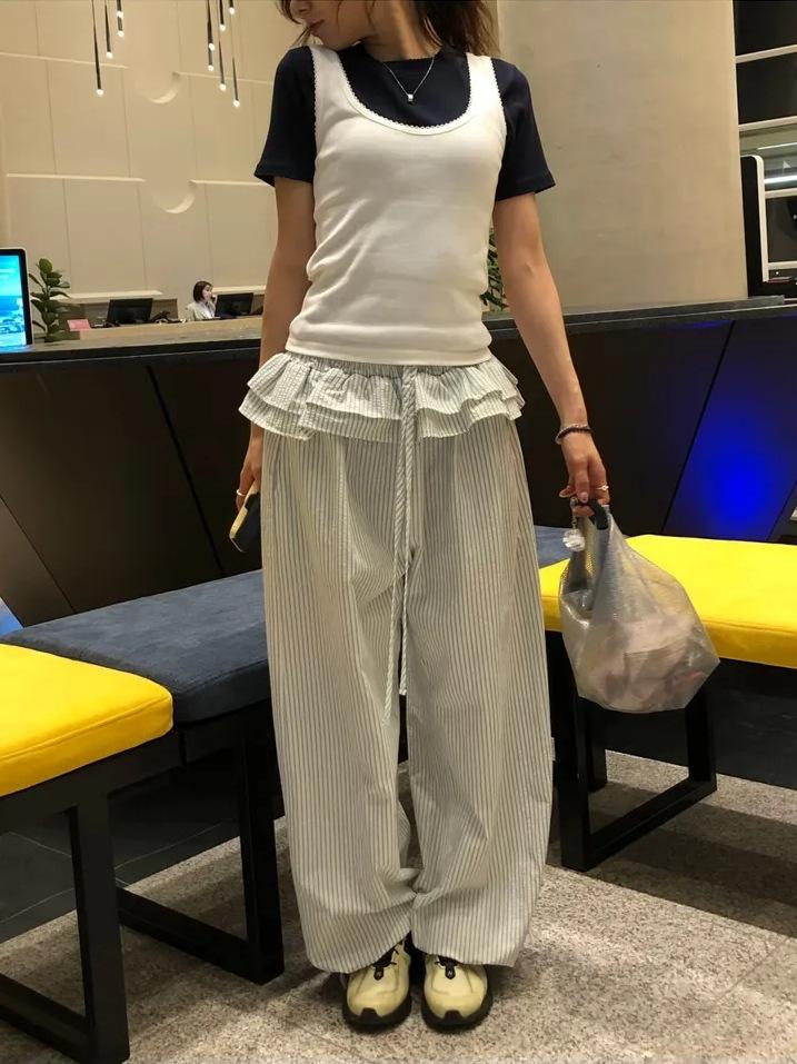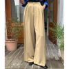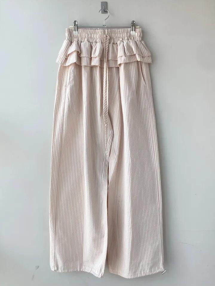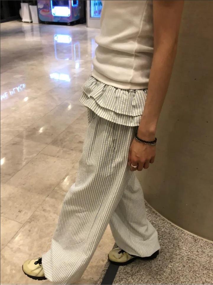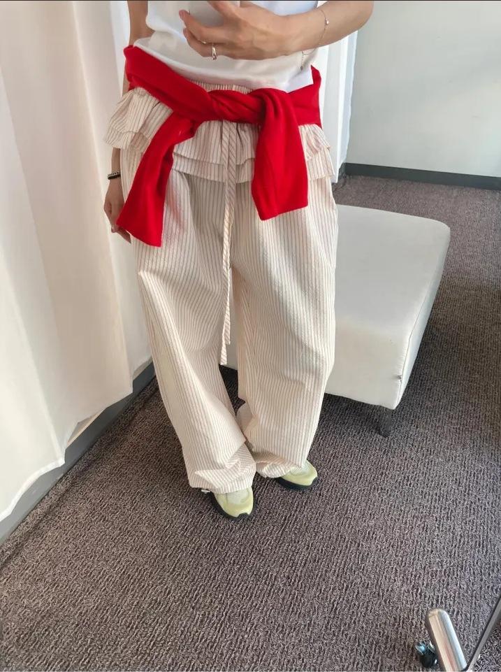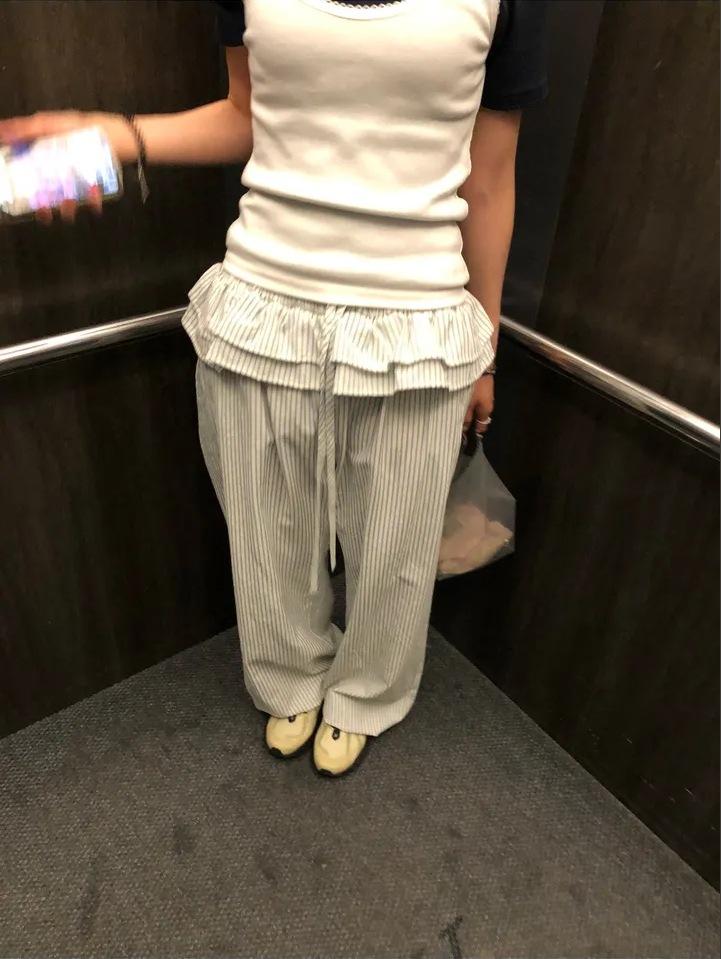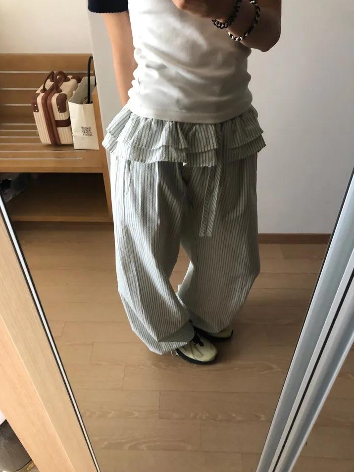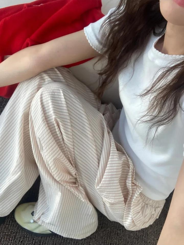 Pantalones Casuales Simples Estilo Japonés y Coreano para Chica Ins con Pliegues, Rayas Verticales, Dobladillo con Volantes y Cordón Ajustable de Pierna Ancha