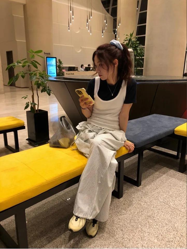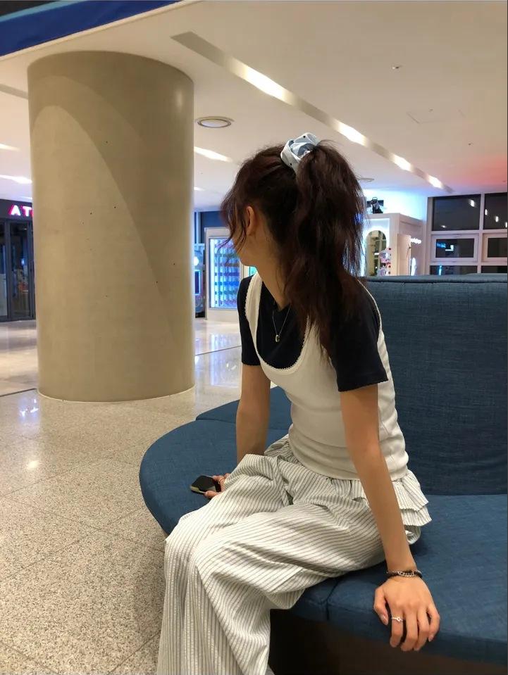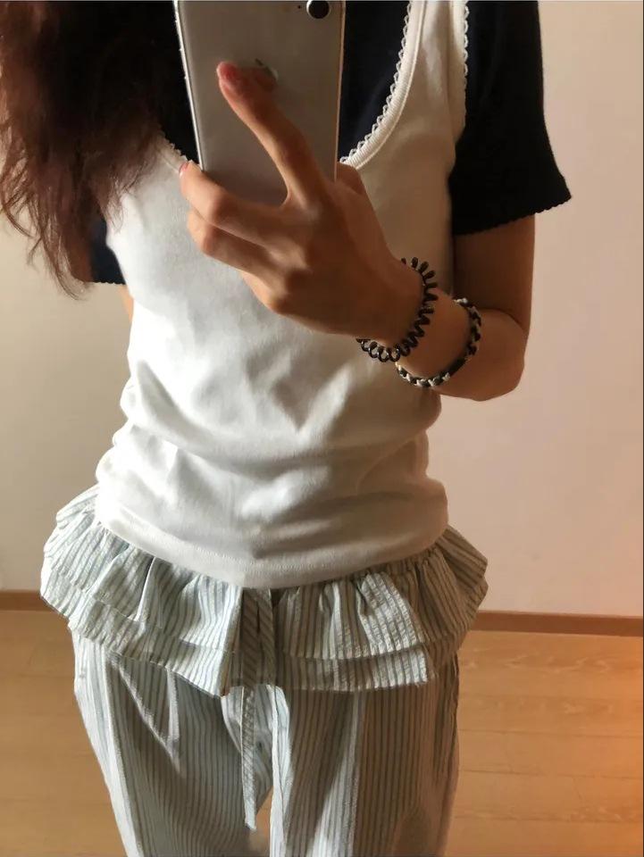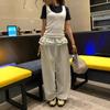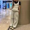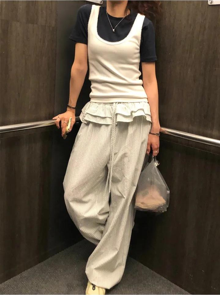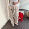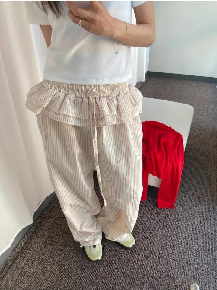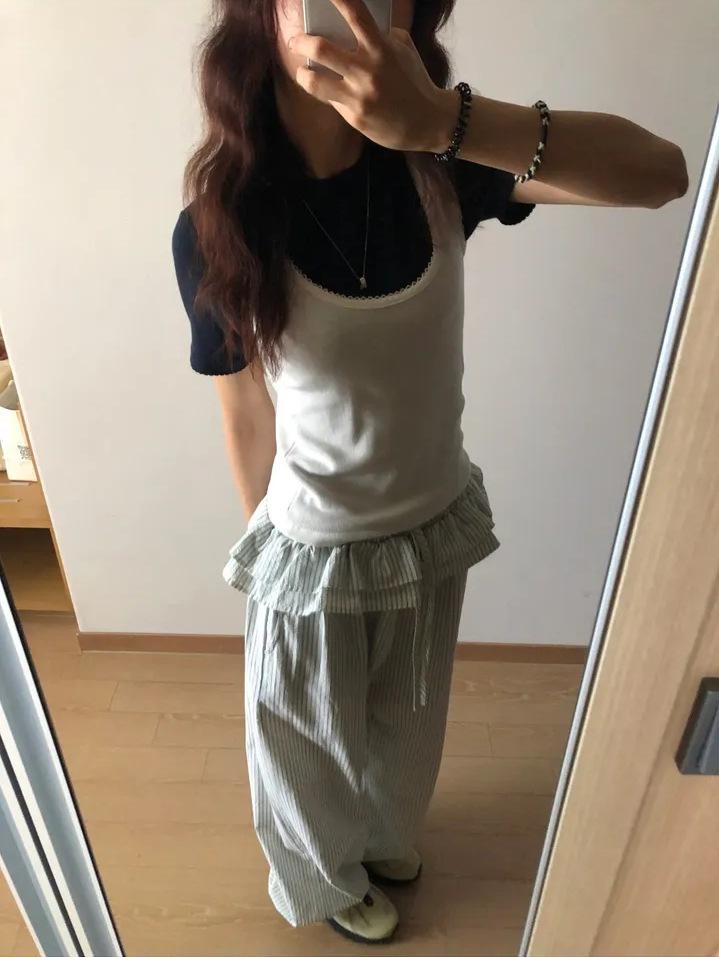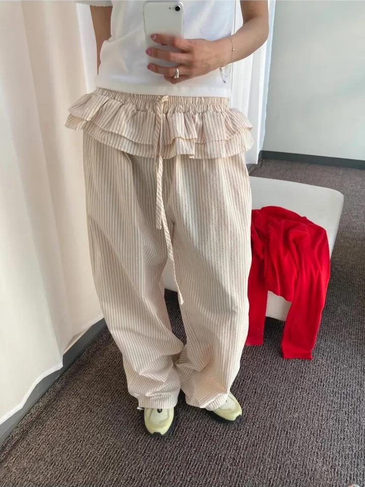 Pantalones Casuales Simples Estilo Japonés y Coreano para Chica Ins con Pliegues, Rayas Verticales, Dobladillo con Volantes y Cordón Ajustable de Pierna Ancha