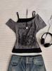 Camiseta de Diseño Falso de Dos Piezas Estilo Retro Americano 2025 Verano Nuevo Patrón de Moda Tops de Manga Corta para Mujer