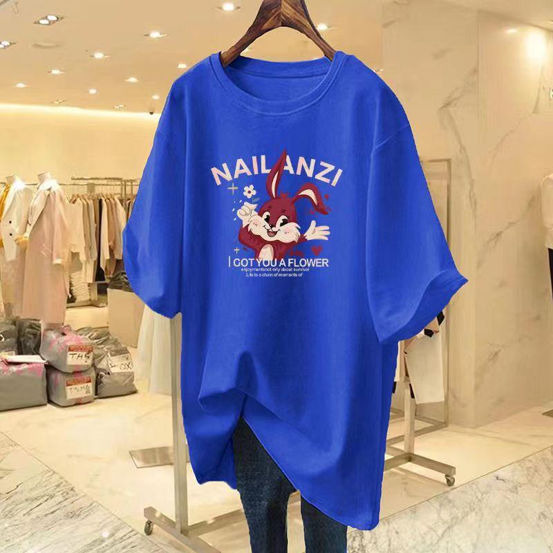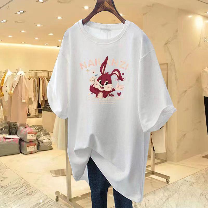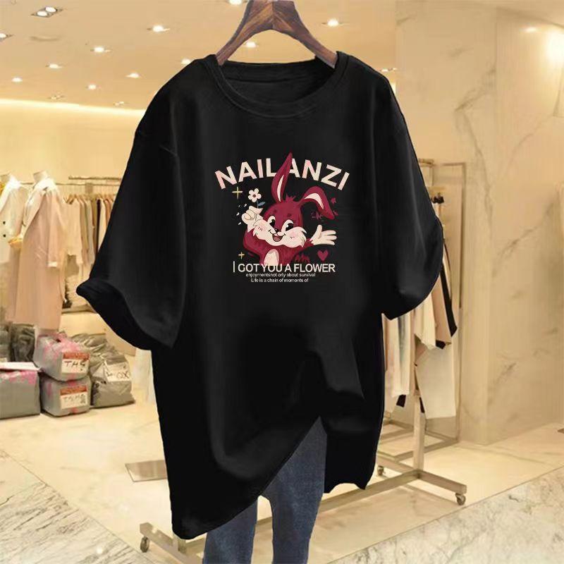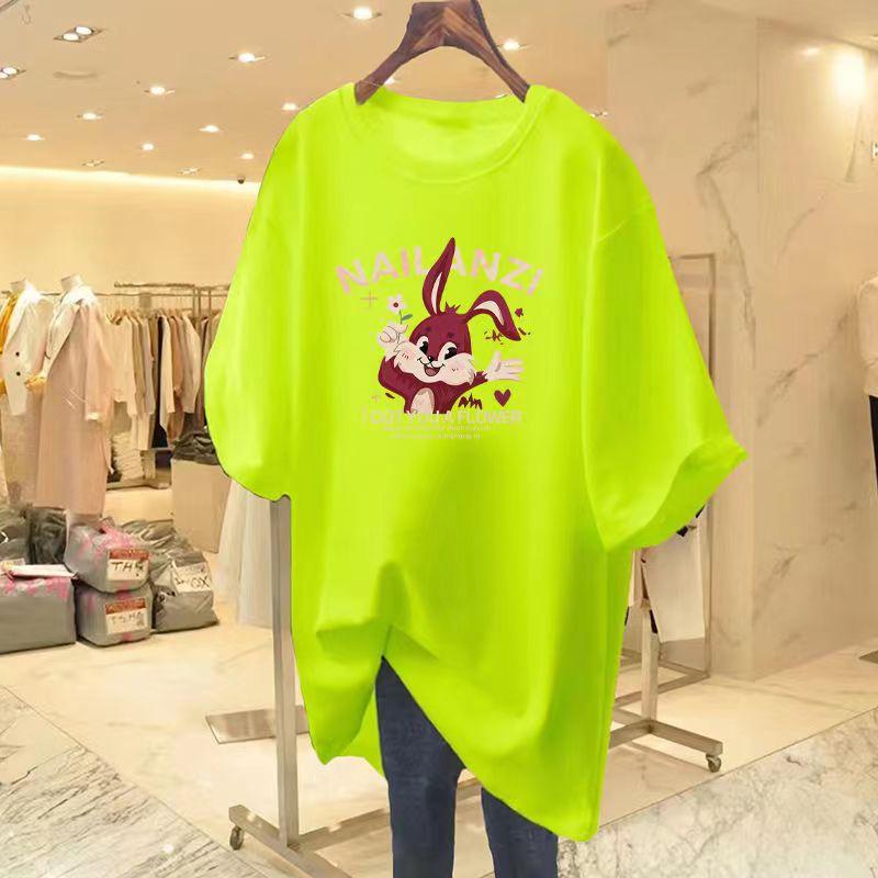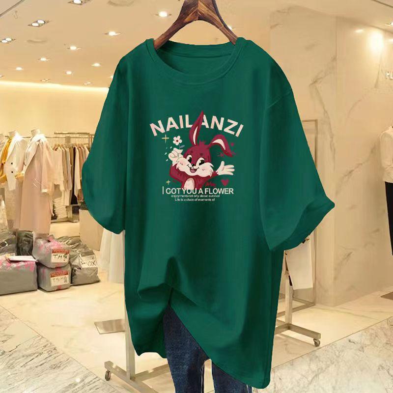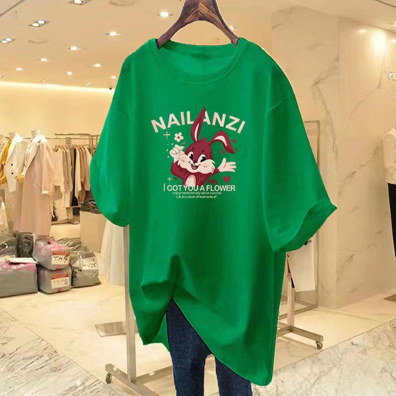 Camiseta Verde Yingguang para Mujer de Manga Corta con Estampado de Conejo Verano Nuevo Europea Talla Grande Algodón Suelta Básica Camiseta Top
