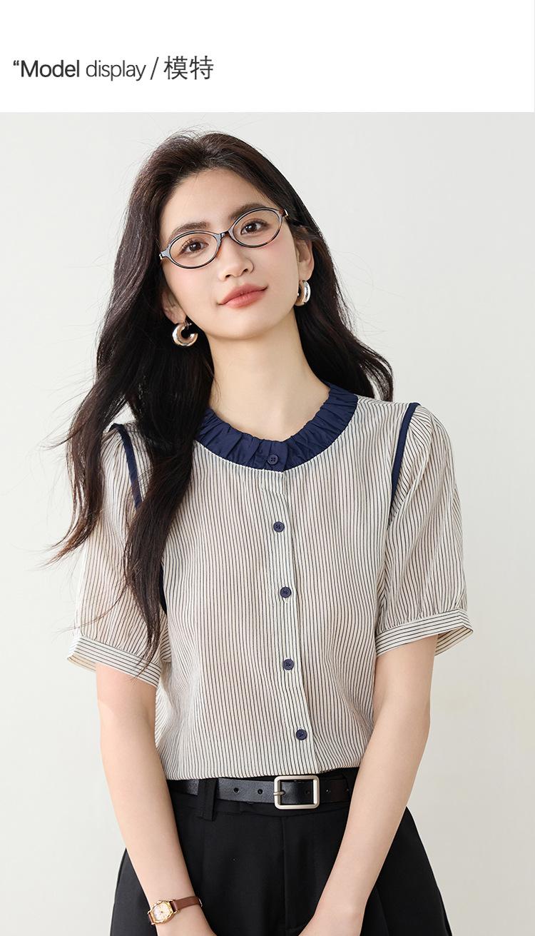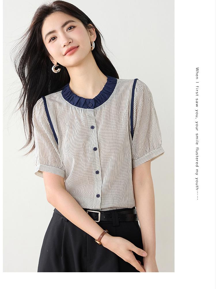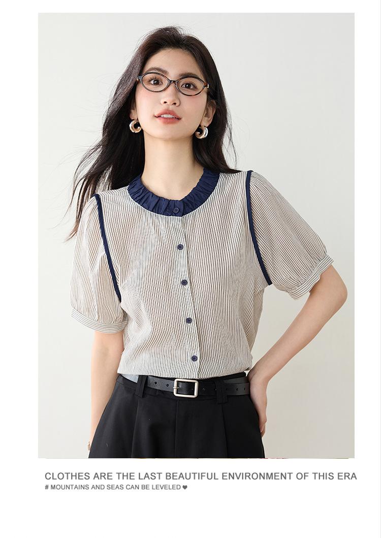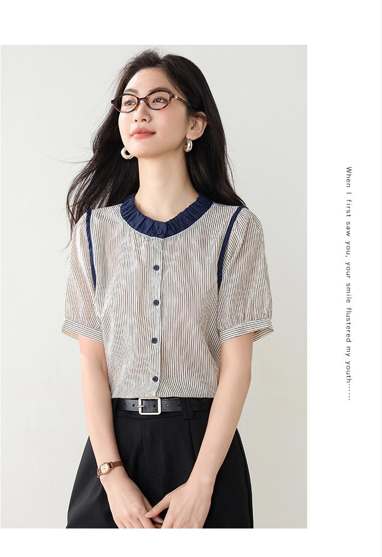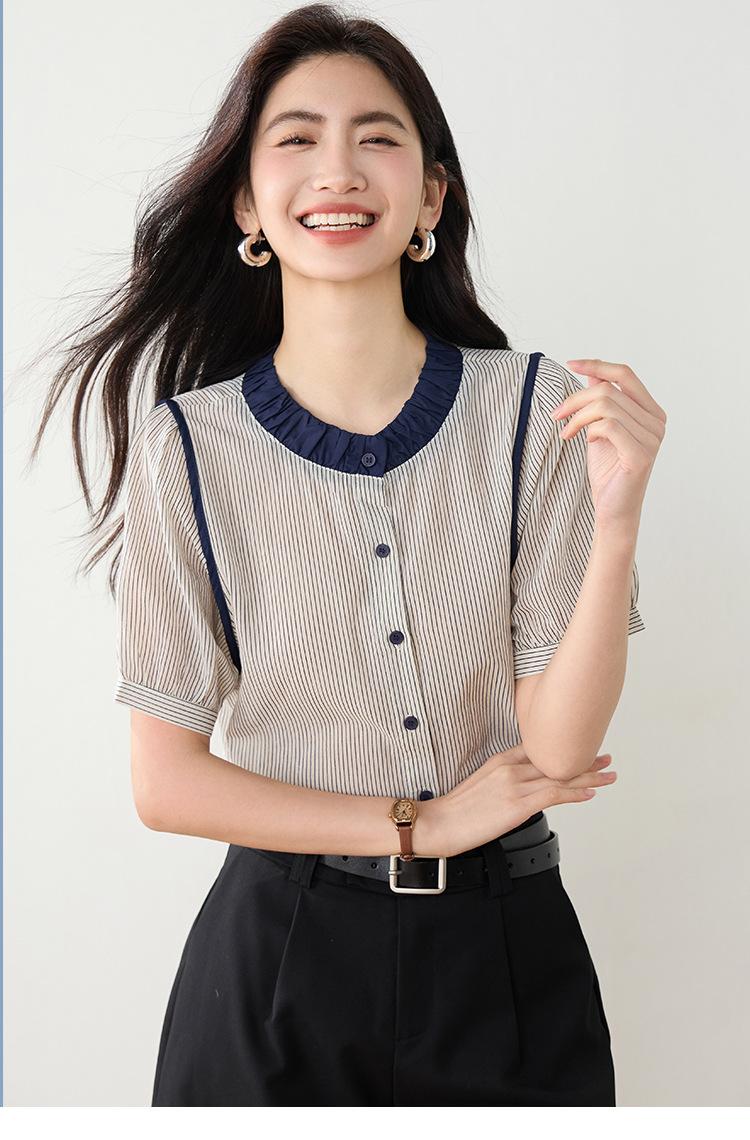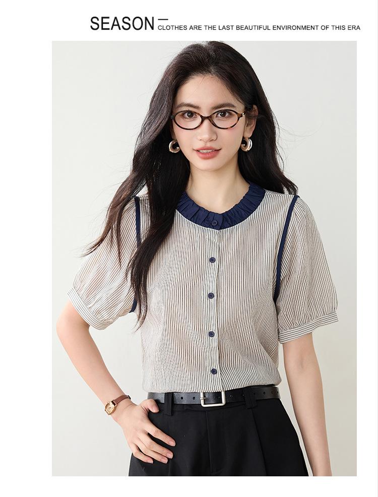 Camisa de Manga Corta a Rayas Contrastantes Estilo Verano Nuevo 2025 para Mujer con Textura Única y Cuello de Encaje, Hermosa Camisa Elegante