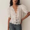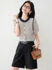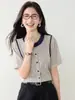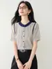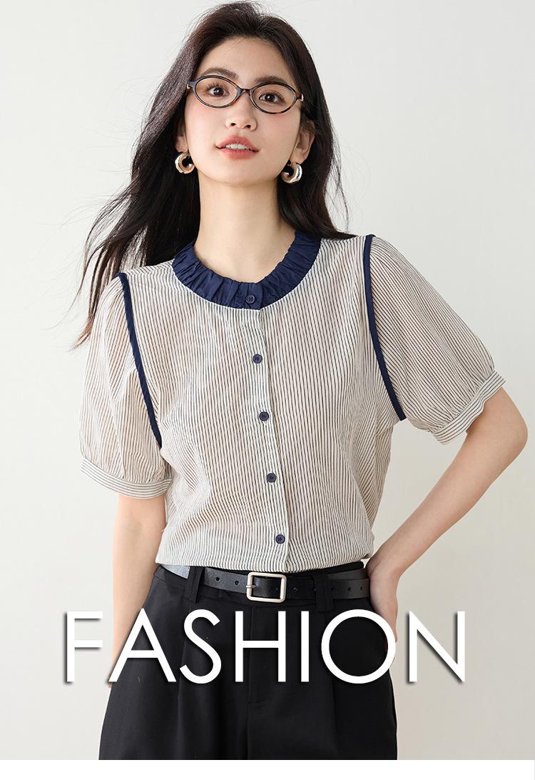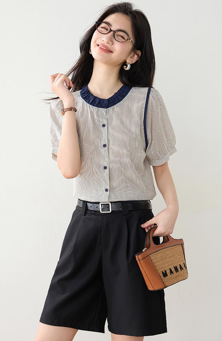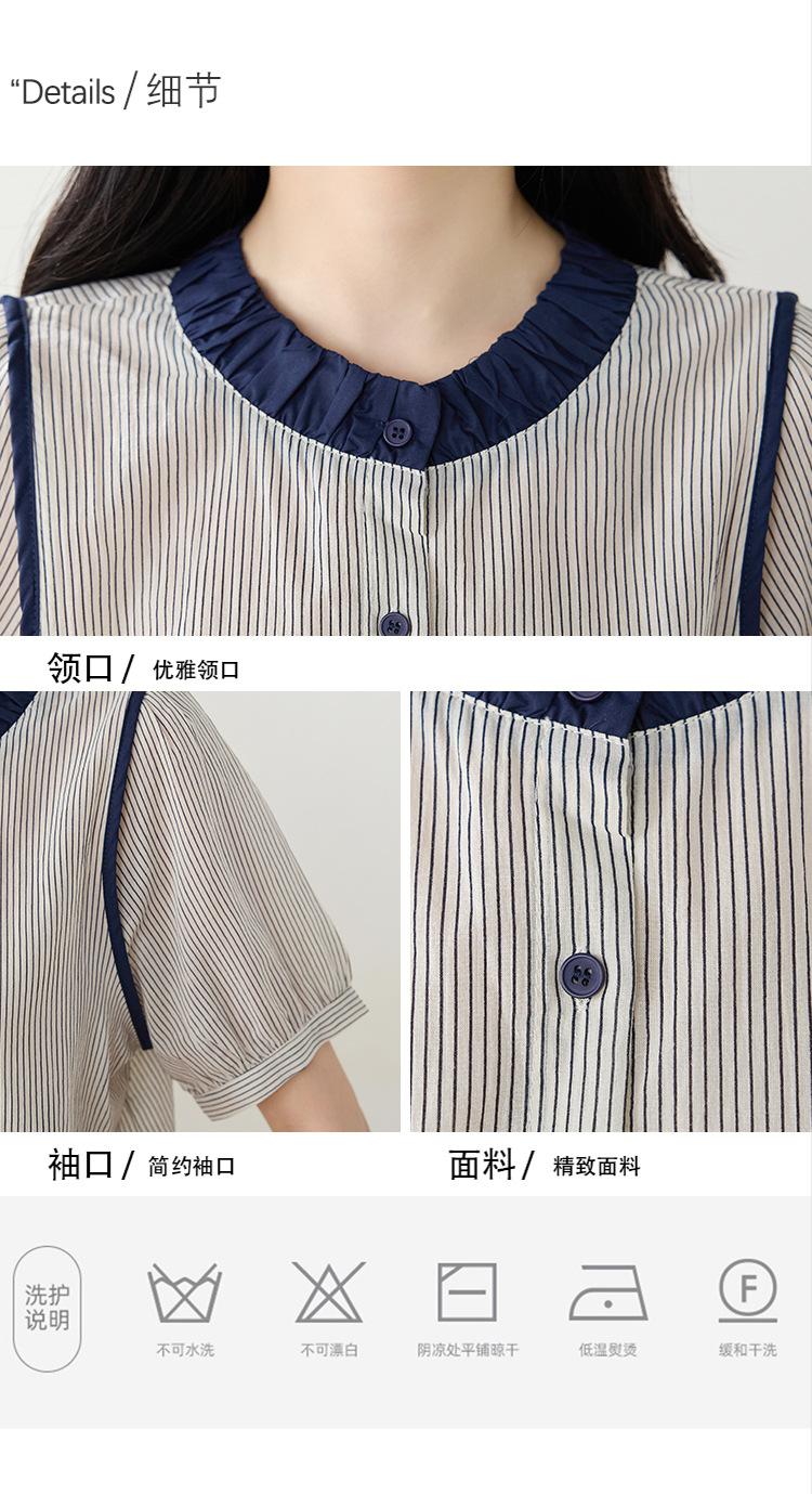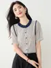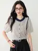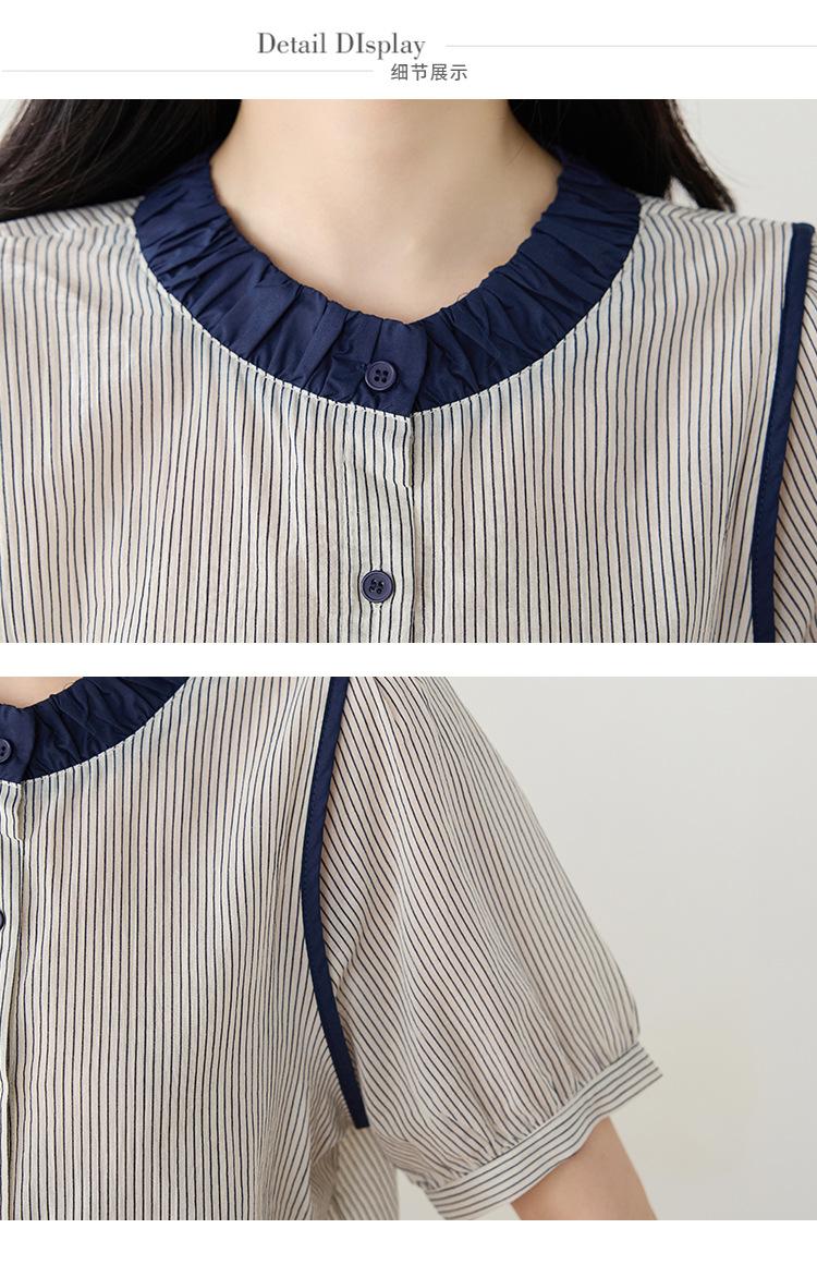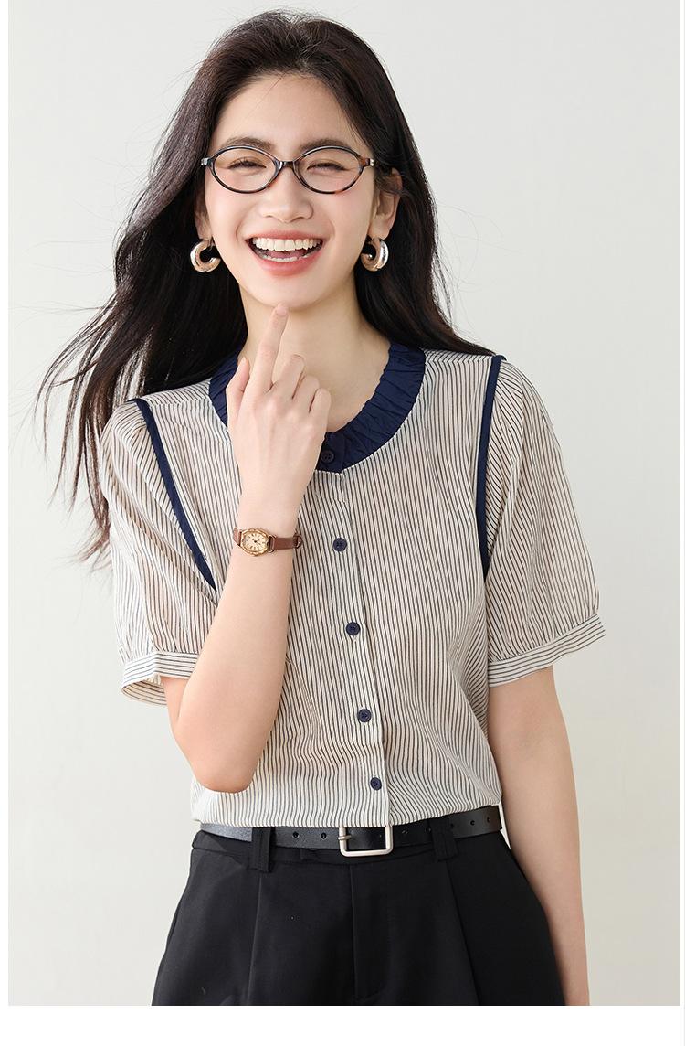 Camisa de Manga Corta a Rayas Contrastantes Estilo Verano Nuevo 2025 para Mujer con Textura Única y Cuello de Encaje, Hermosa Camisa Elegante