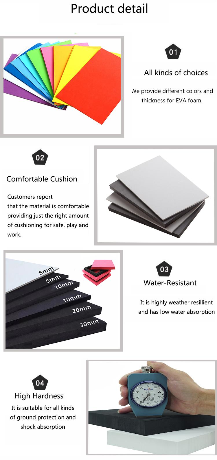 uso | Ampliamente utilizado en rompecabezas, pisos de EVA, colchonetas deportivas, colchonetas de yoga, productos educativos, juguetes para niños, materiales de bricolaje, artesanías y materias primas elásticas; zapatos de EVA, pantuflas de EVA, flores de espuma EVA, cojines, etc. | ||||||