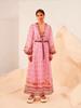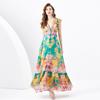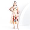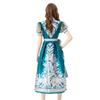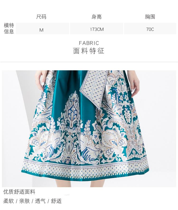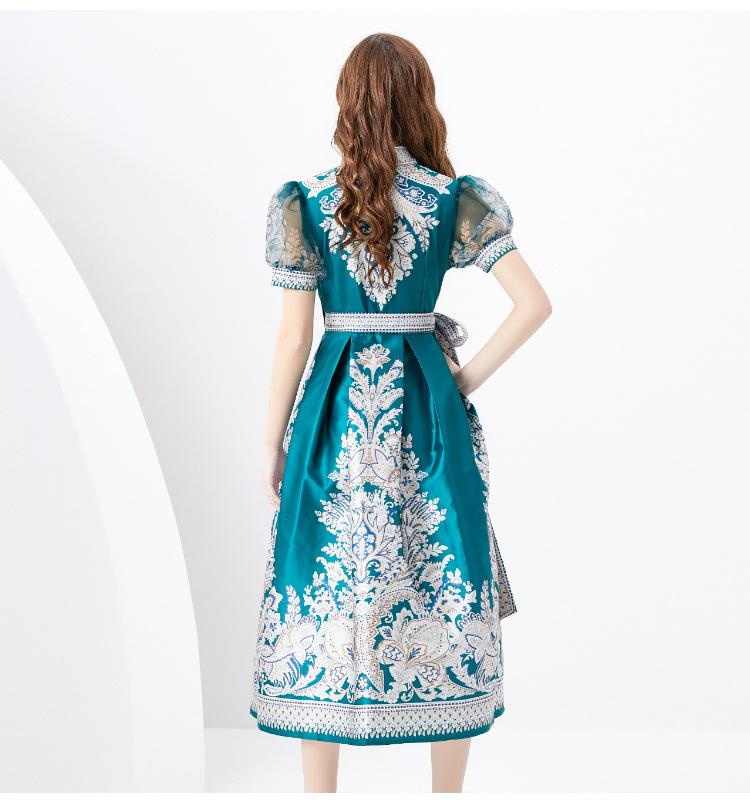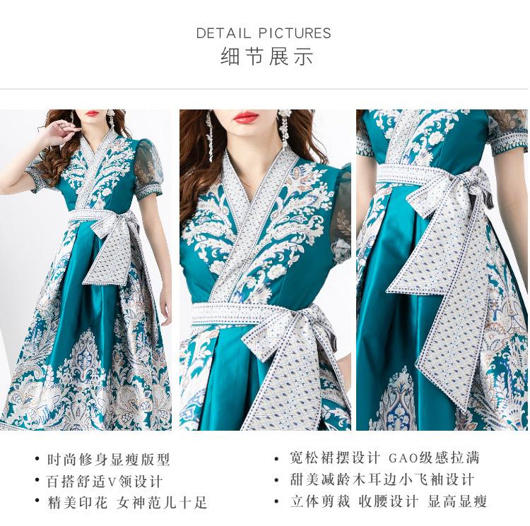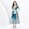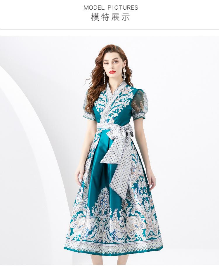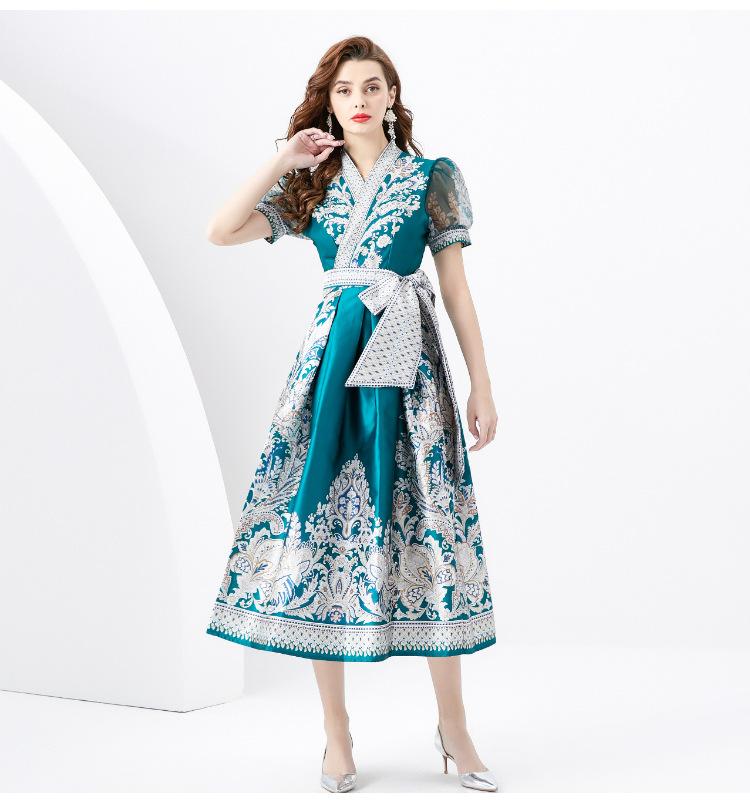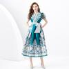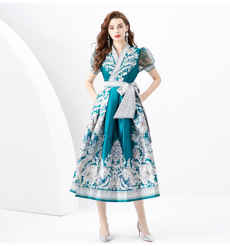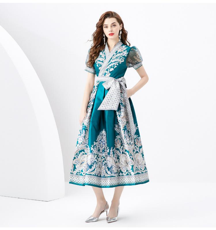 Vestido Largo Retro Estampado de Malla con Encaje Envolvente Estilo Acordonado Cuello en V Manga Larga Farol Primavera Verano 2024