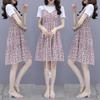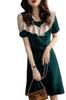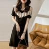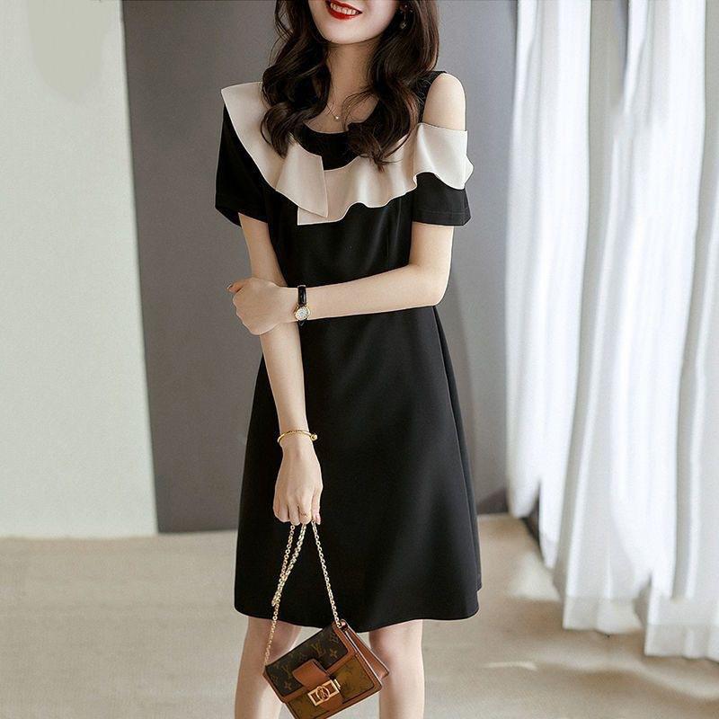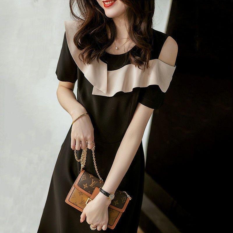 Vestido Adelgazante de Hombros para Mujer de Manga Corta Primavera Verano Nuevo Elegante Combinación de Colores Volantes Tridimensionales Vestido Negro
