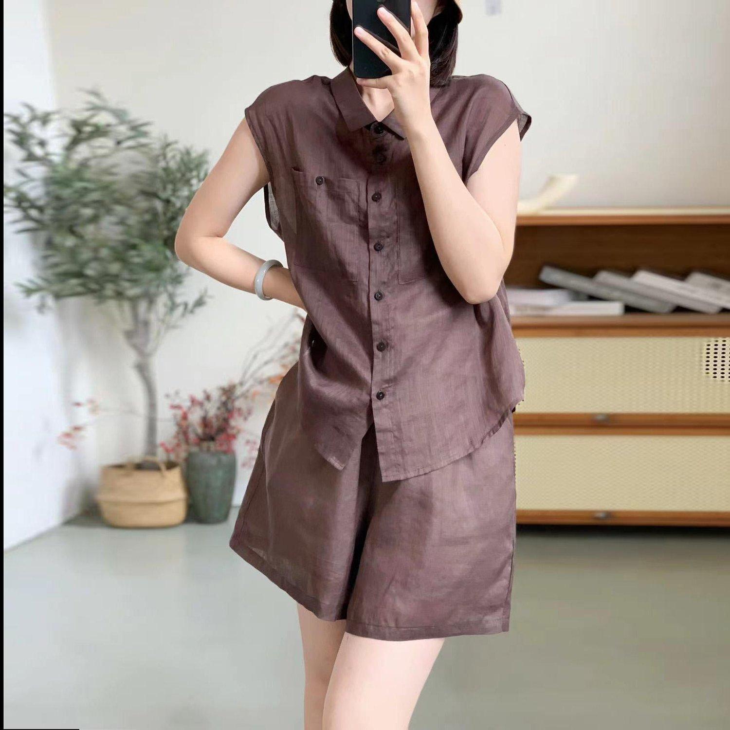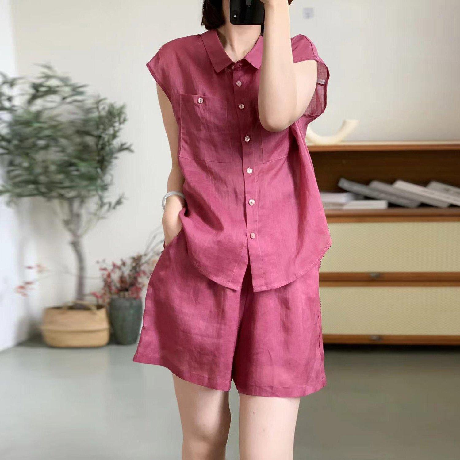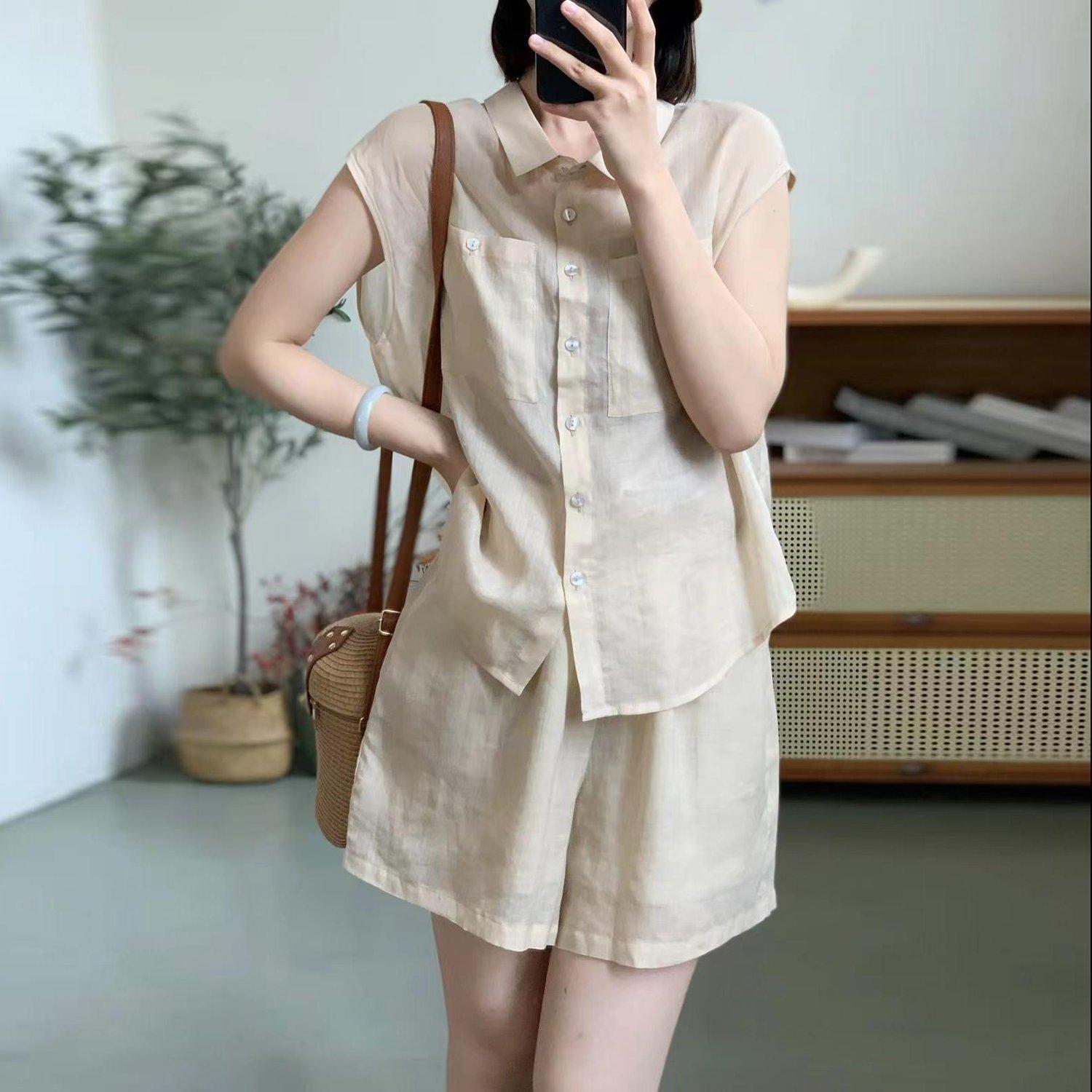 Traje Deportivo Casual Europeo de Alta Gama para Mujer 2025 Nuevo Verano Camisa de Lino de Manga Volante Shorts Conjunto de Dos Piezas