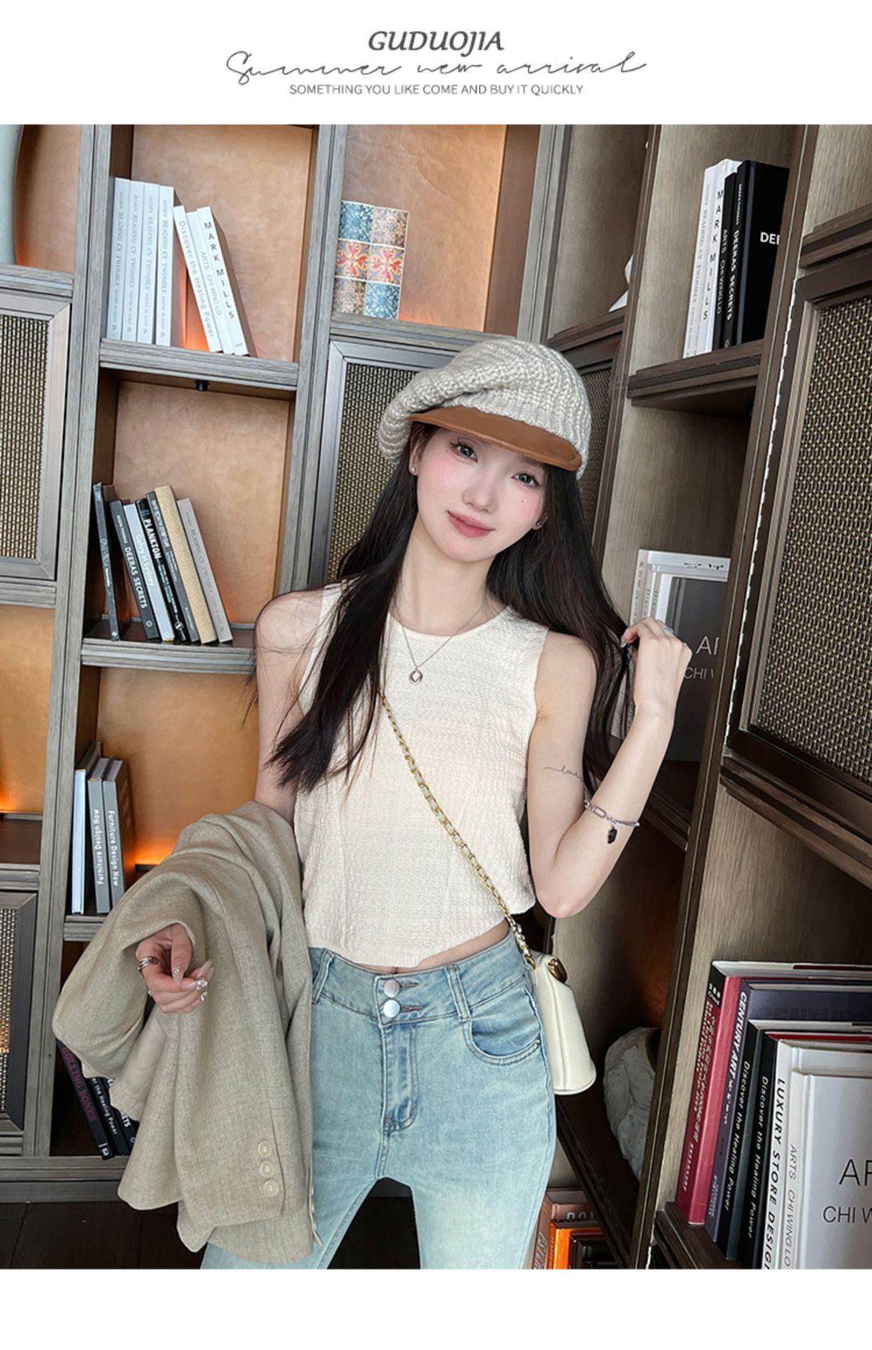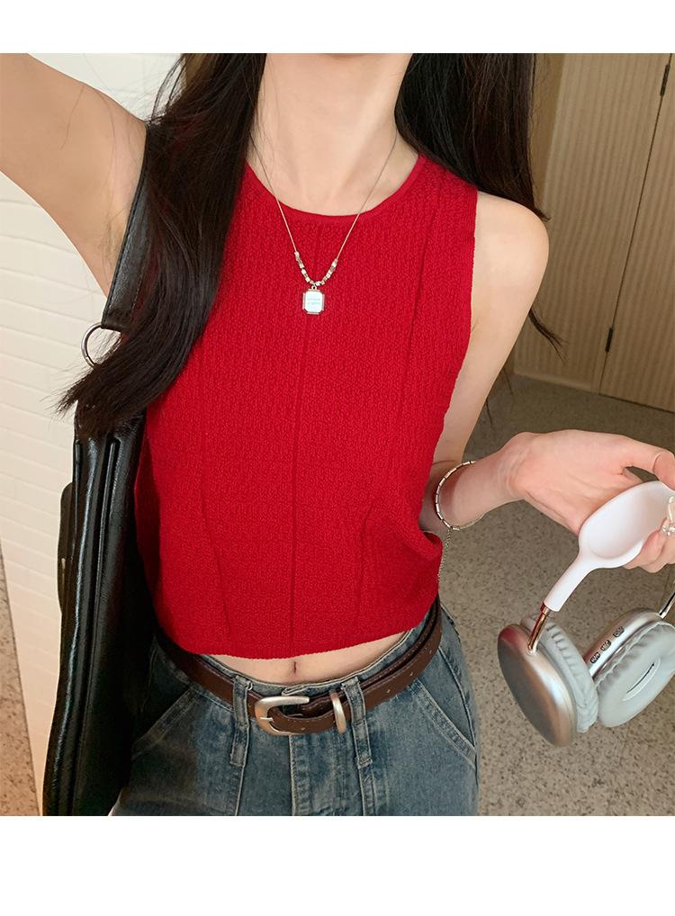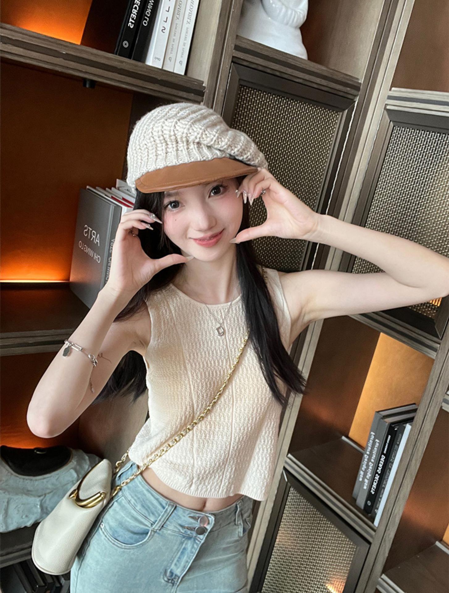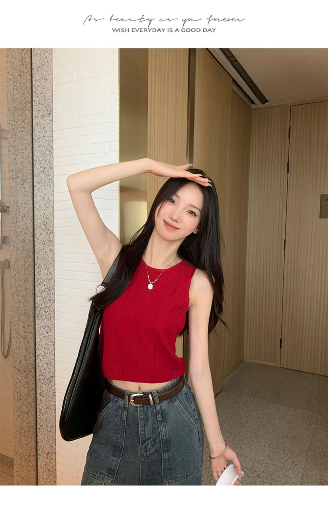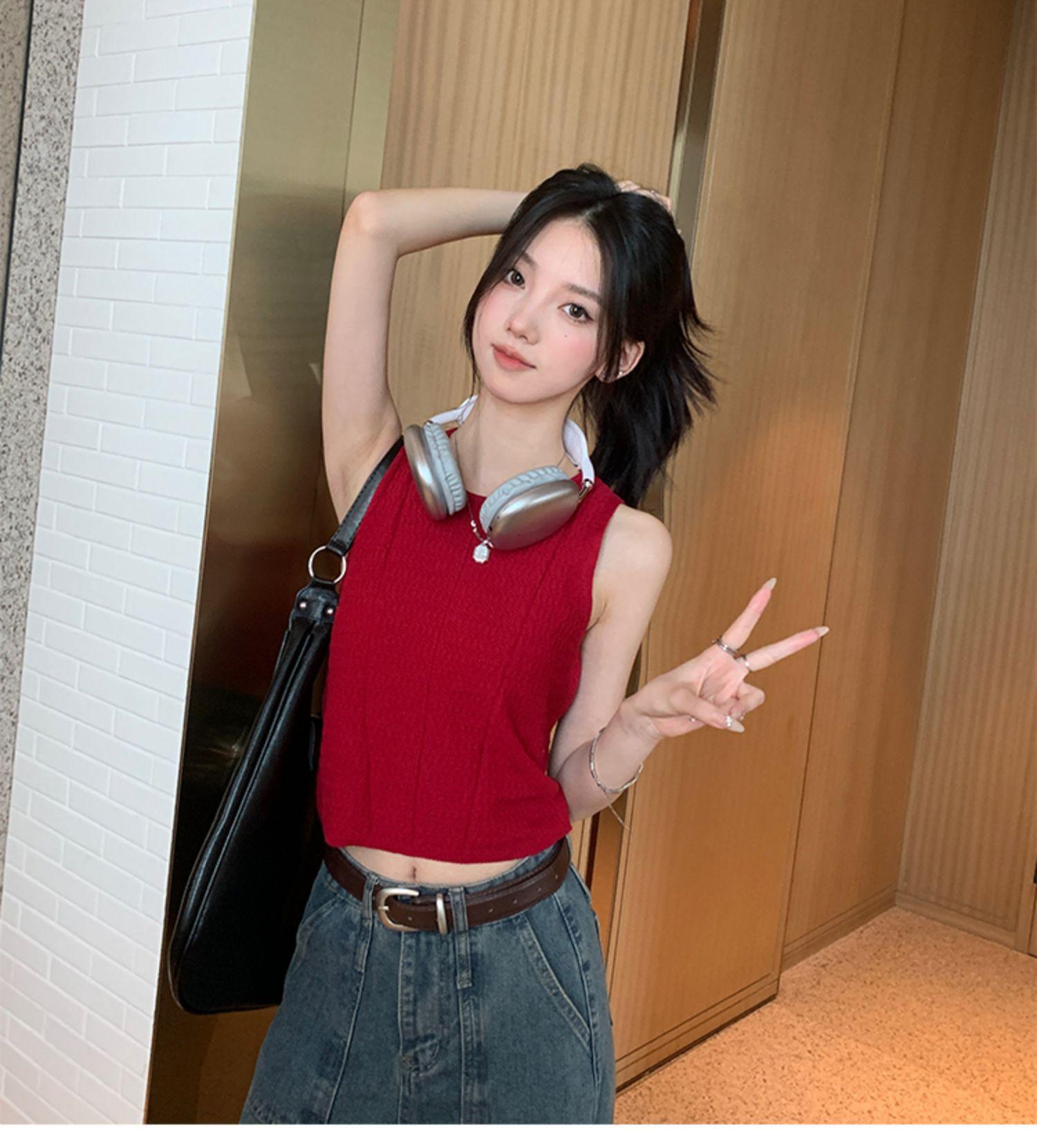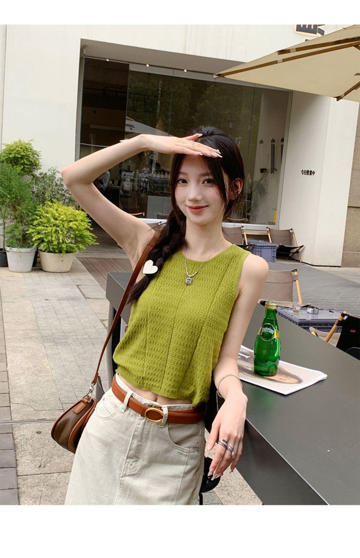 Camisola sin mangas para mujer, diseño delgado de verano, nicho, aspecto adelgazante, color puro, top corto de punto para exportación