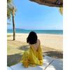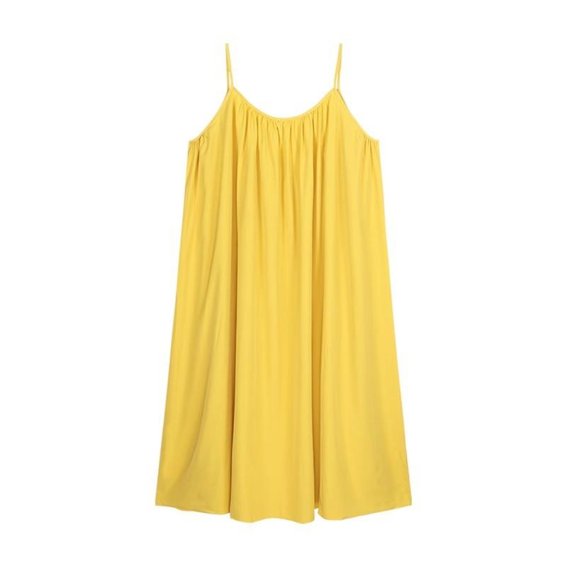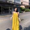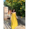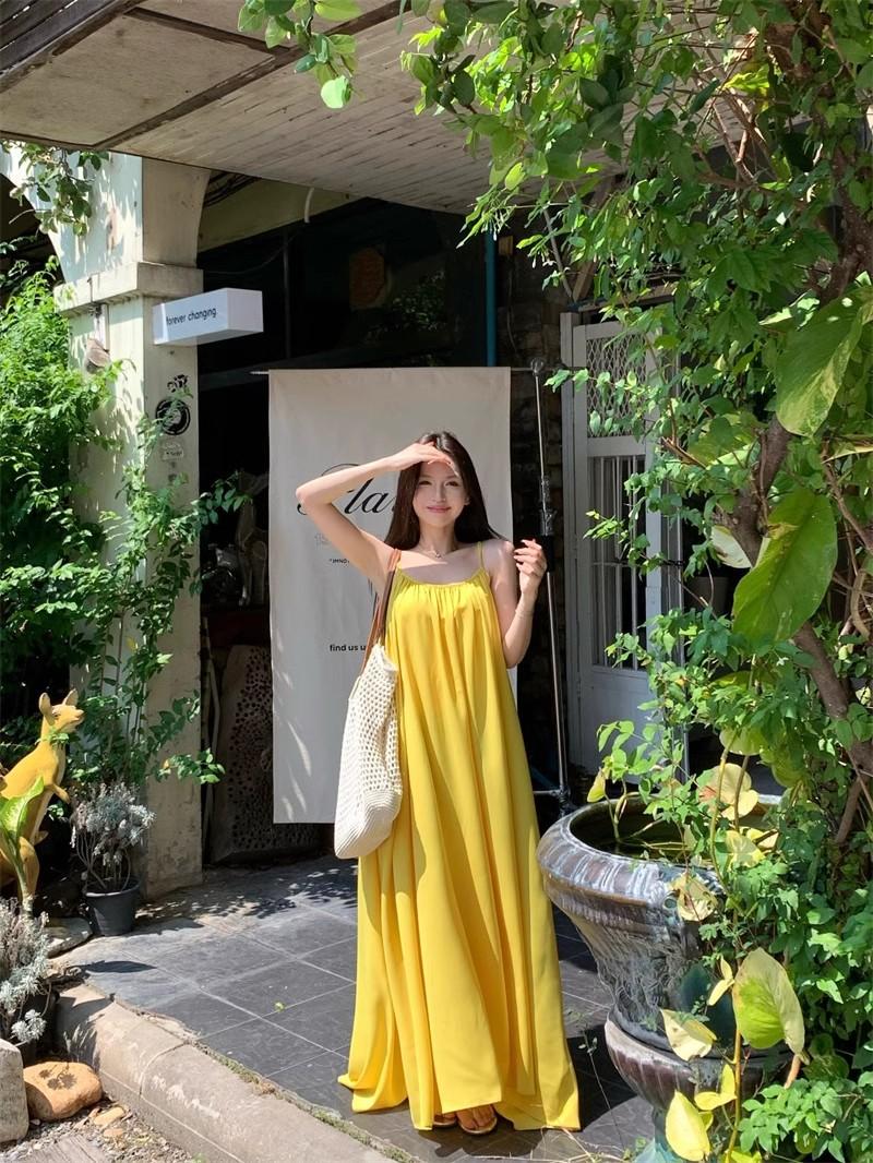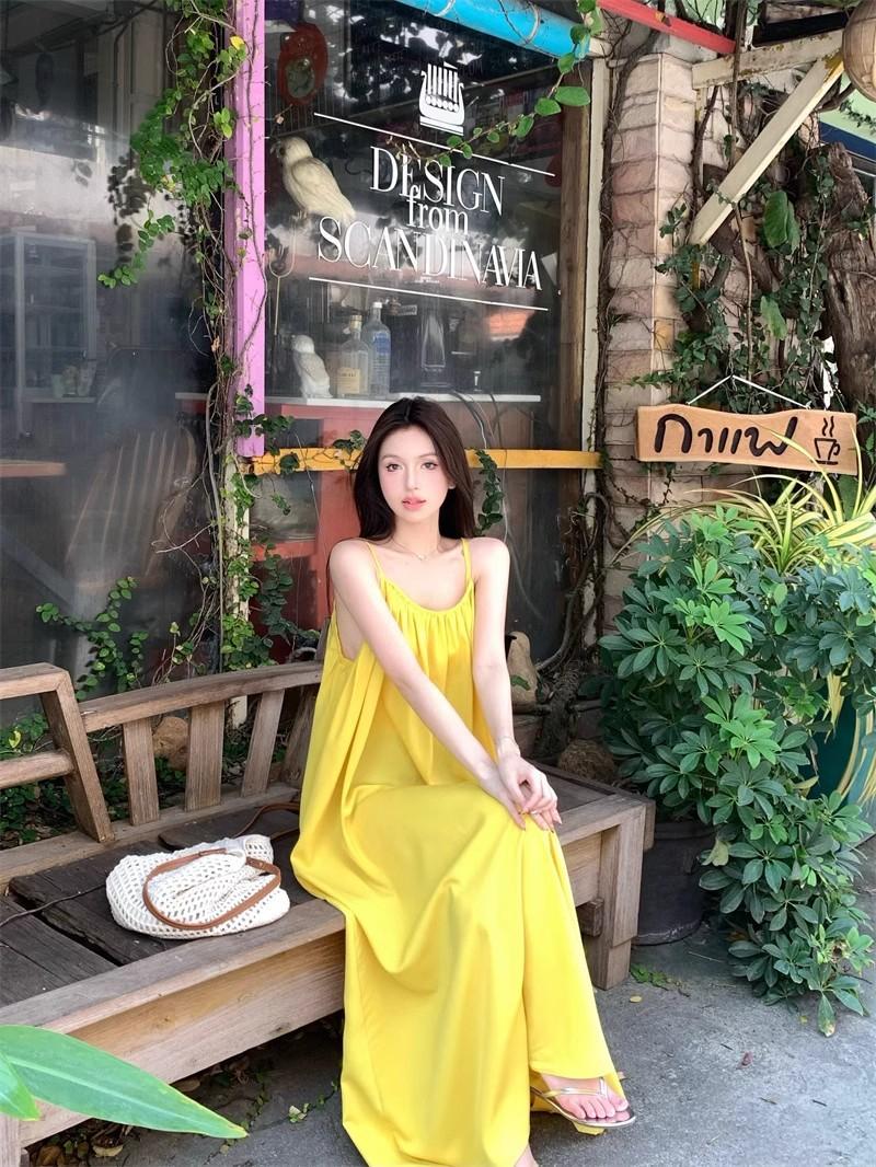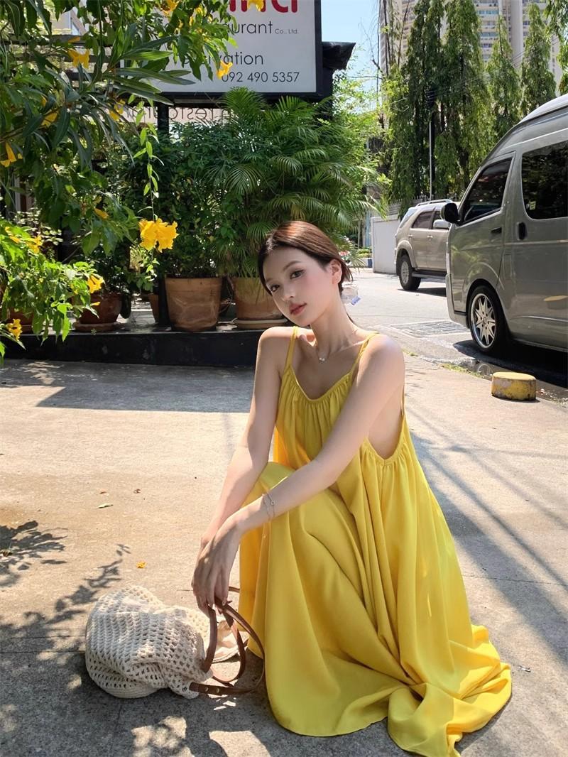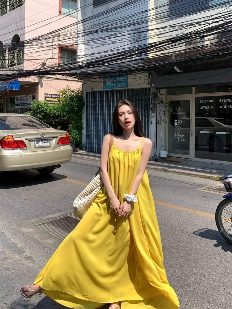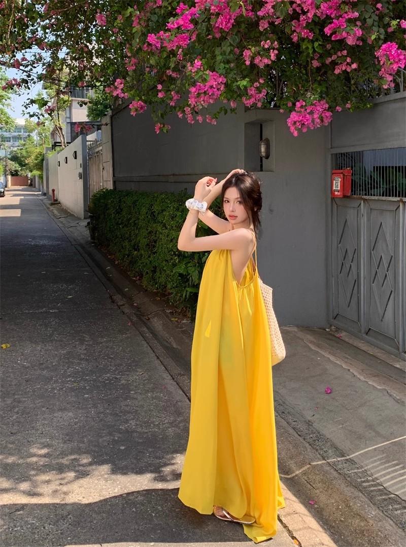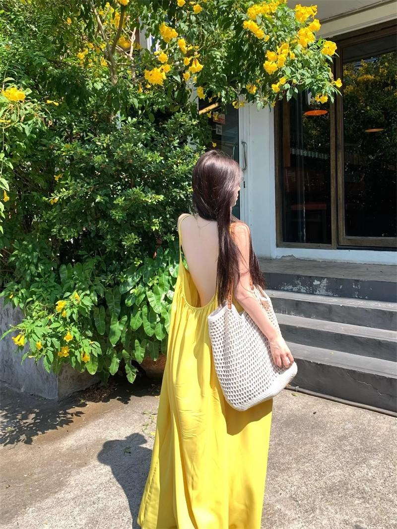Vacaciones Junto al Mar Vestido Sexy de Tirantes sin Espalda para Mujer Nuevo Verano Suelto Falda Línea A Amarillo Suave Falda Larga