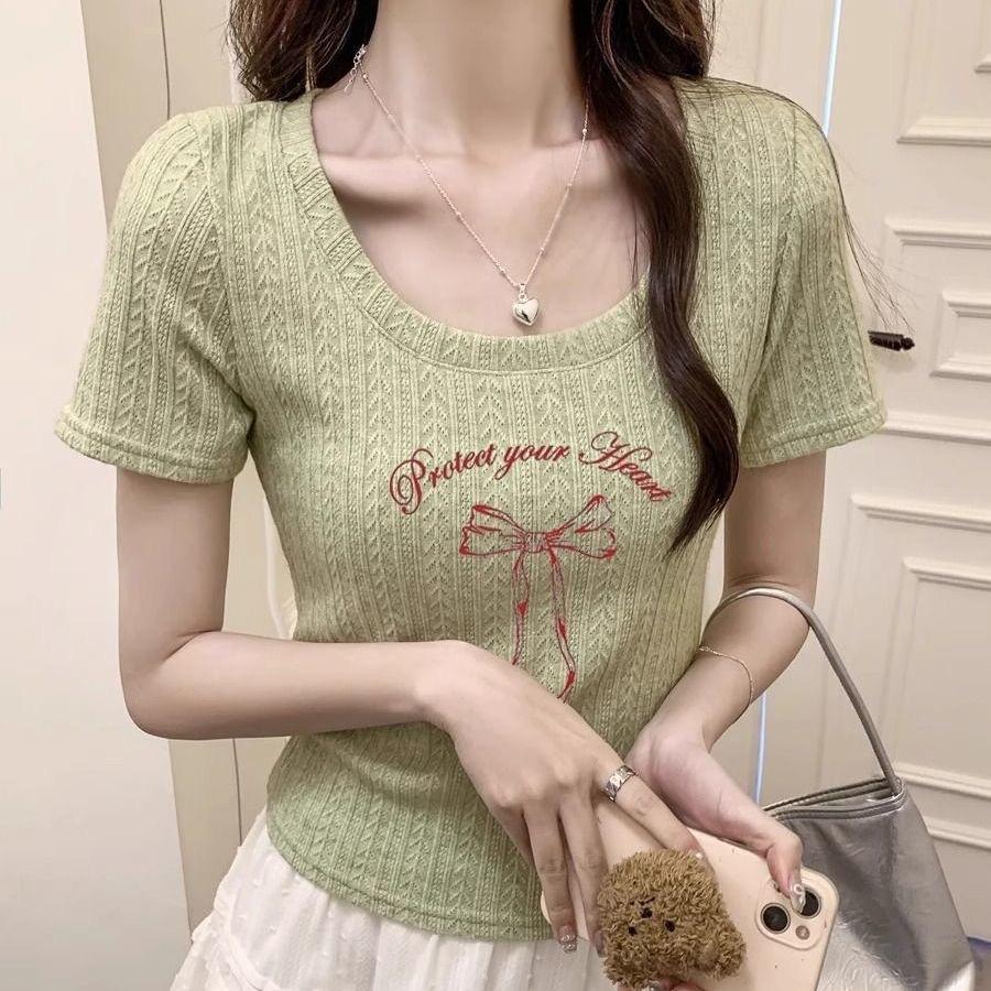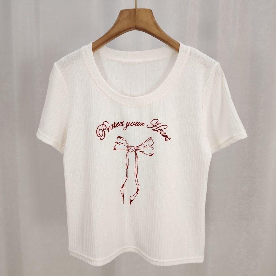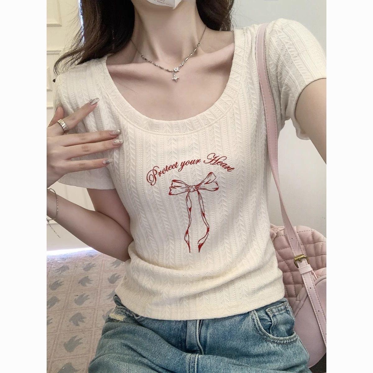 Americano Retro Manga Corta Tejido de Punto para Mujer Verano Nuevo Diseño con Estampado de Lazo Cuello U Nicho Estilo Corto Deseo Puro Top