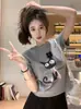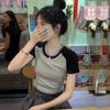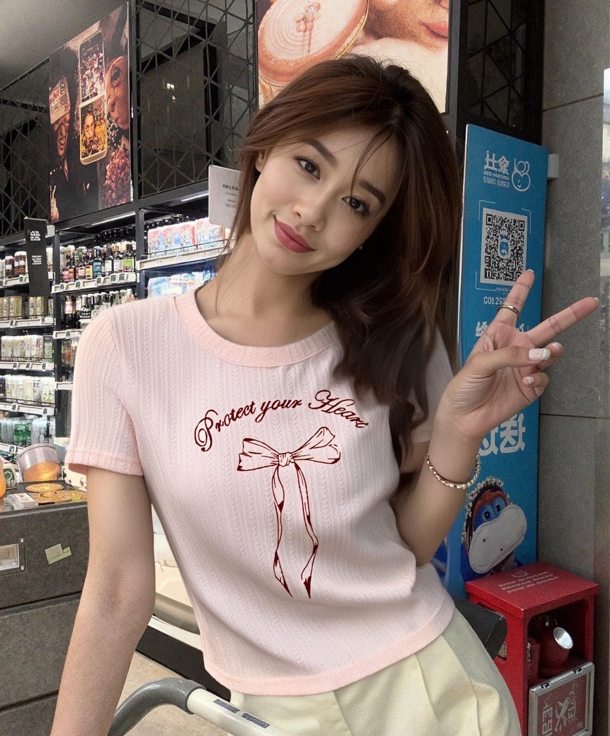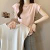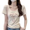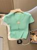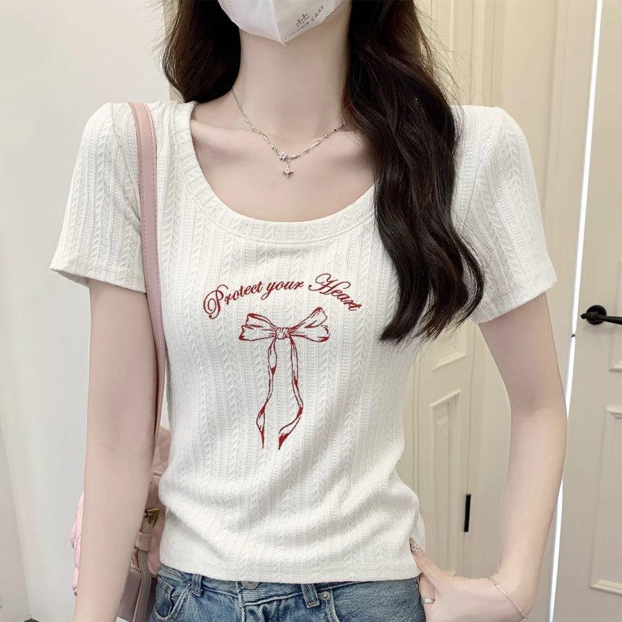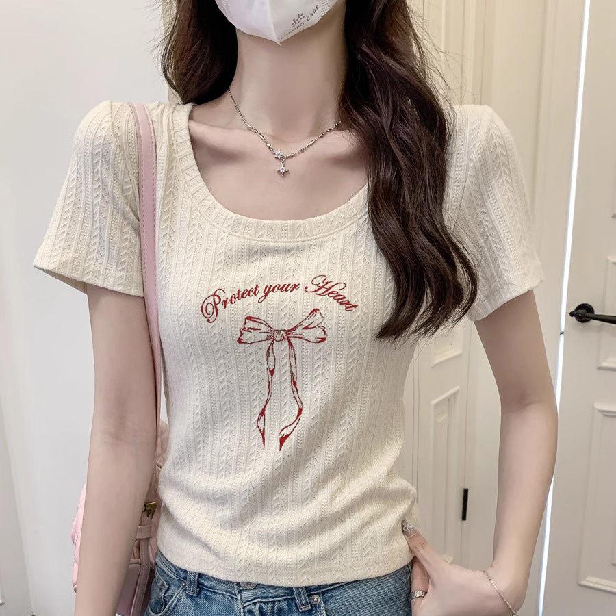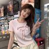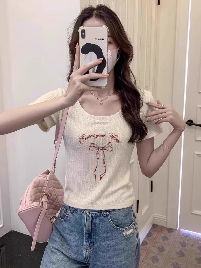 Americano Retro Manga Corta Tejido de Punto para Mujer Verano Nuevo Diseño con Estampado de Lazo Cuello U Nicho Estilo Corto Deseo Puro Top