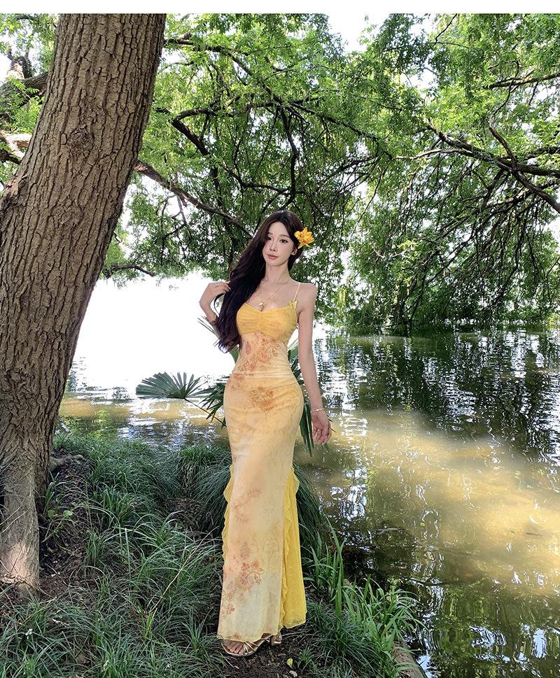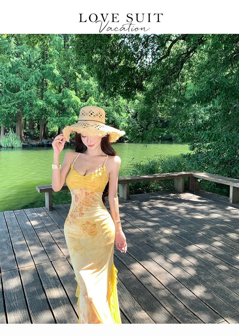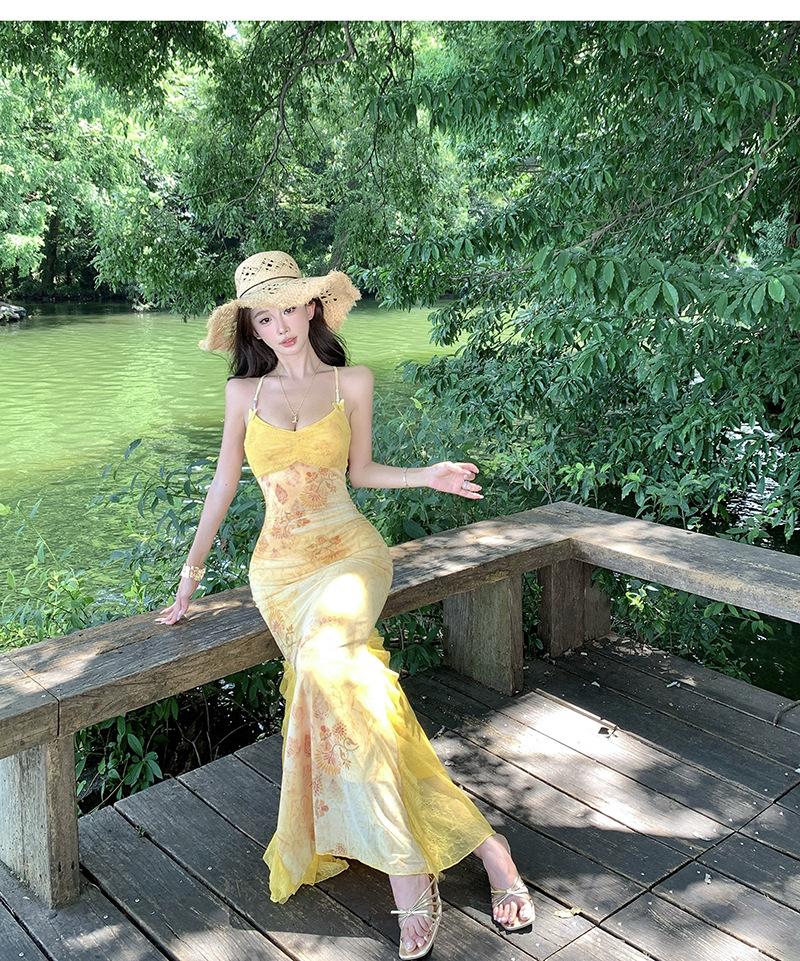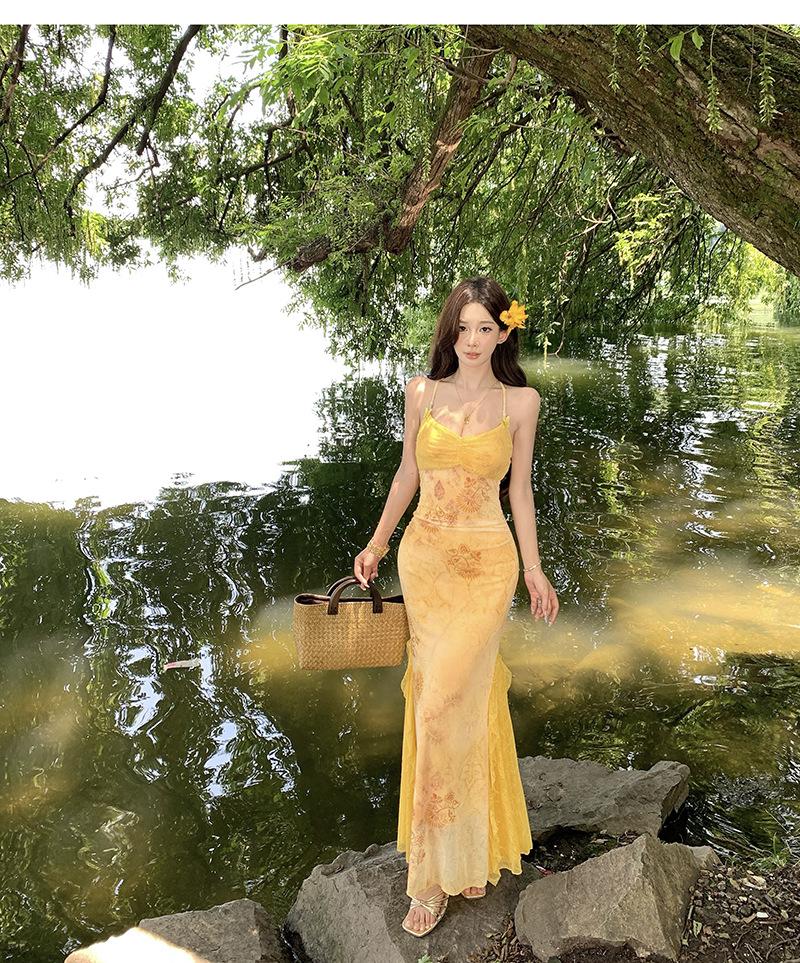 Deseo Puro Vestido Amarillo de Malla Estampada con Tirantes para Chica Caliente Vestido Largo de Verano para Mujer Ajustado Sexy Cubre Caderas Vacaciones Junto al Mar