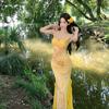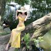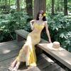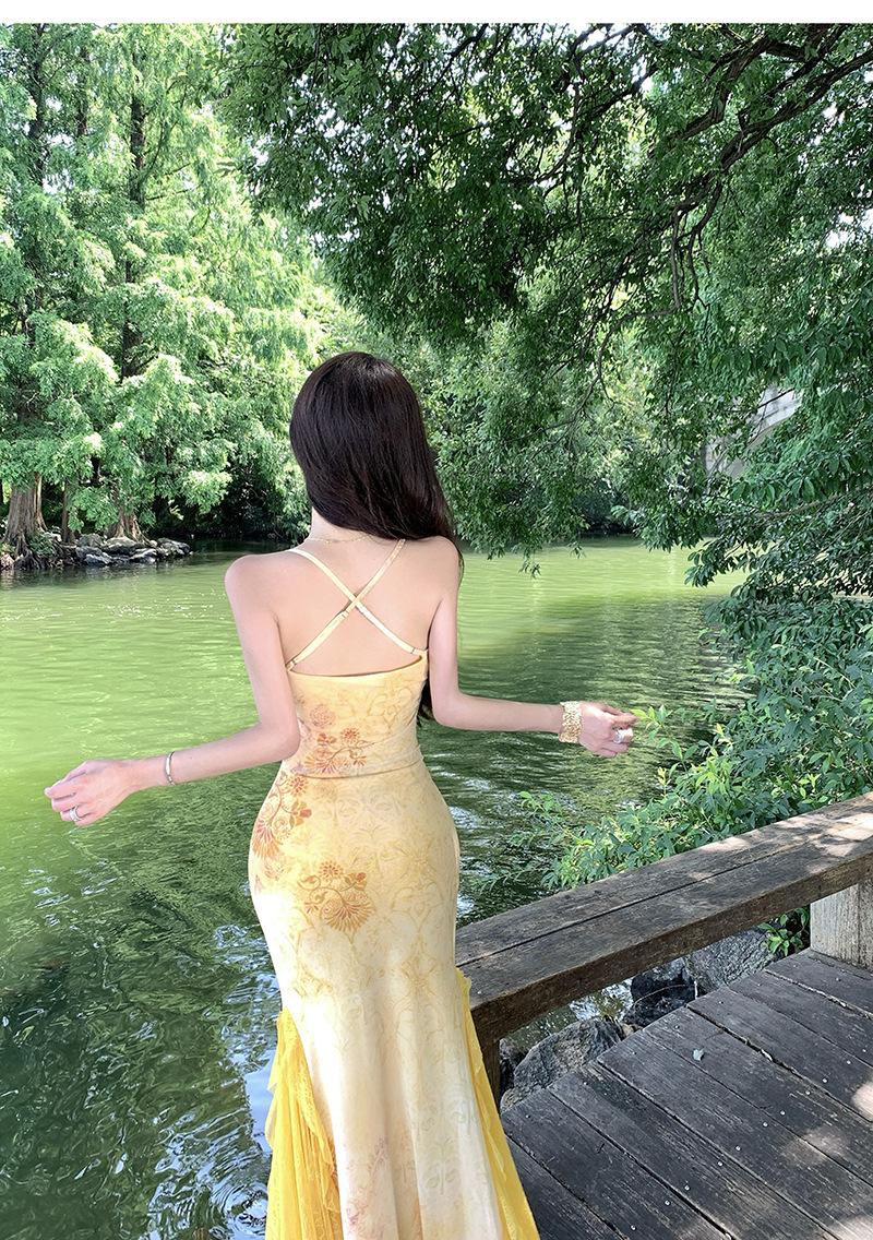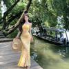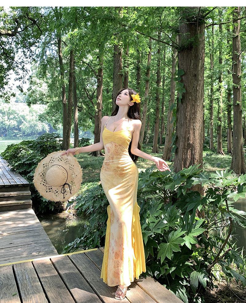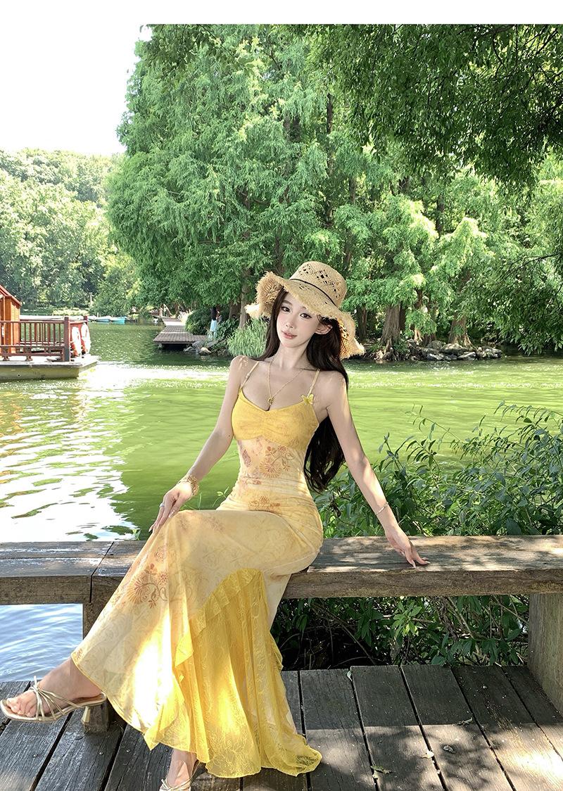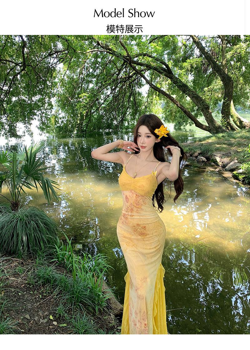 Deseo Puro Vestido Amarillo de Malla Estampada con Tirantes para Chica Caliente Vestido Largo de Verano para Mujer Ajustado Sexy Cubre Caderas Vacaciones Junto al Mar