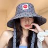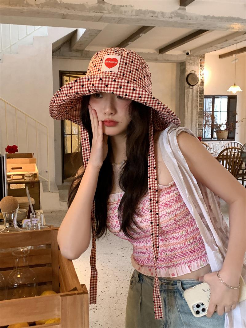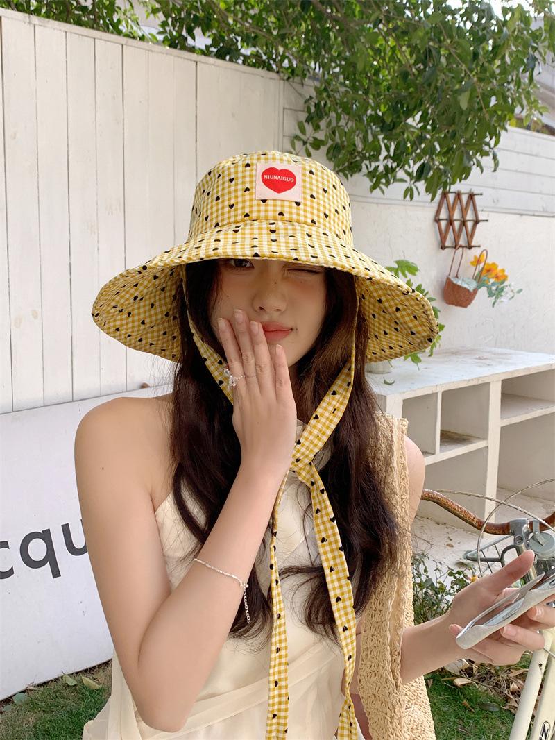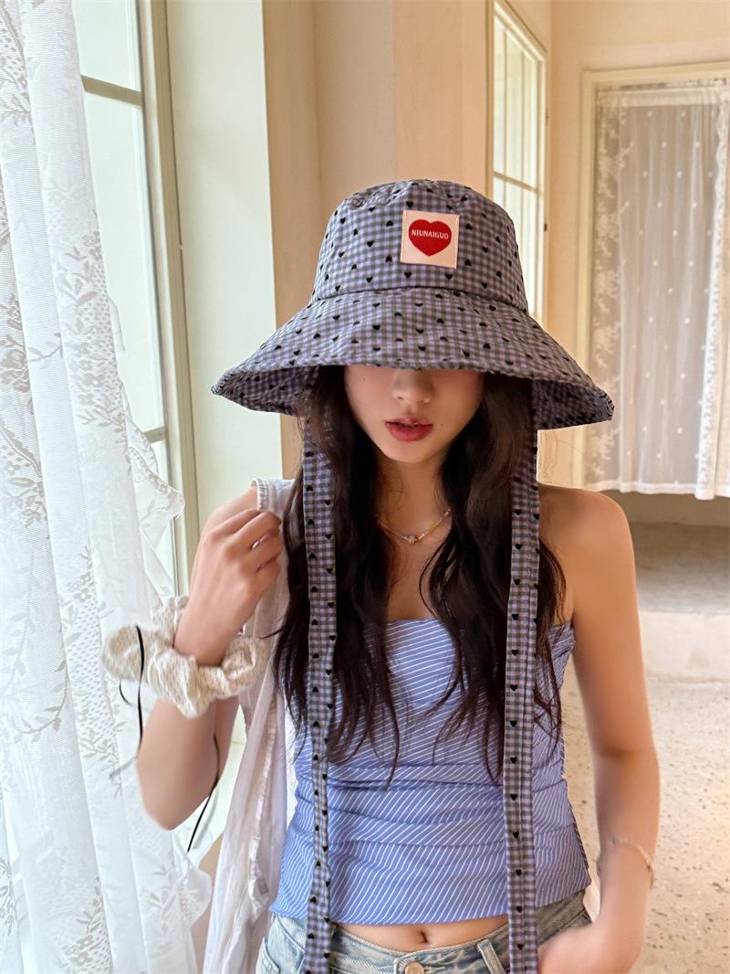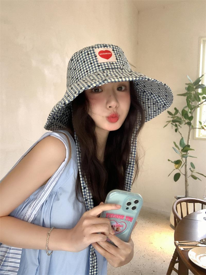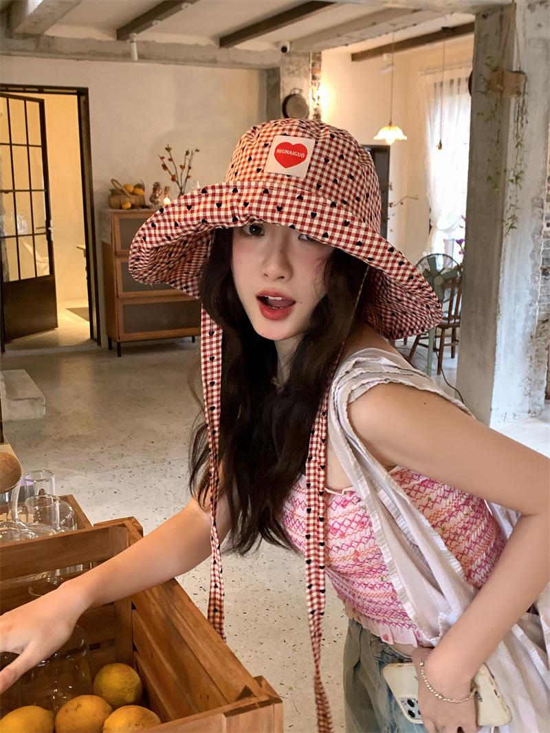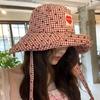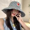 Sombrero de Pescador a Cuadros Dulce Corazón Estilo Japonés para Mujer, Primavera y Verano, Plegable, Ala Ancha, Parasol, Sombrero de Cubo Adelgazante de Rostro