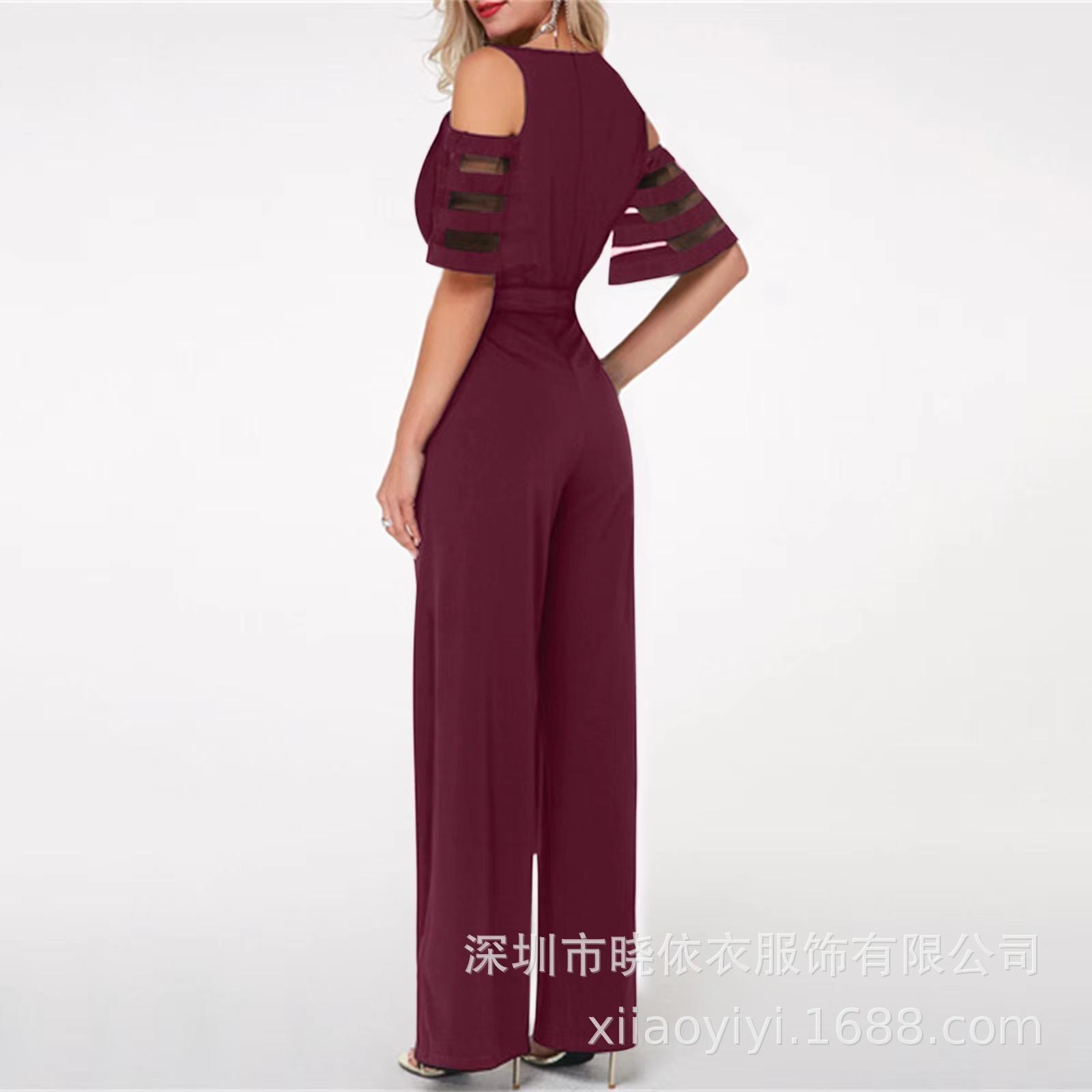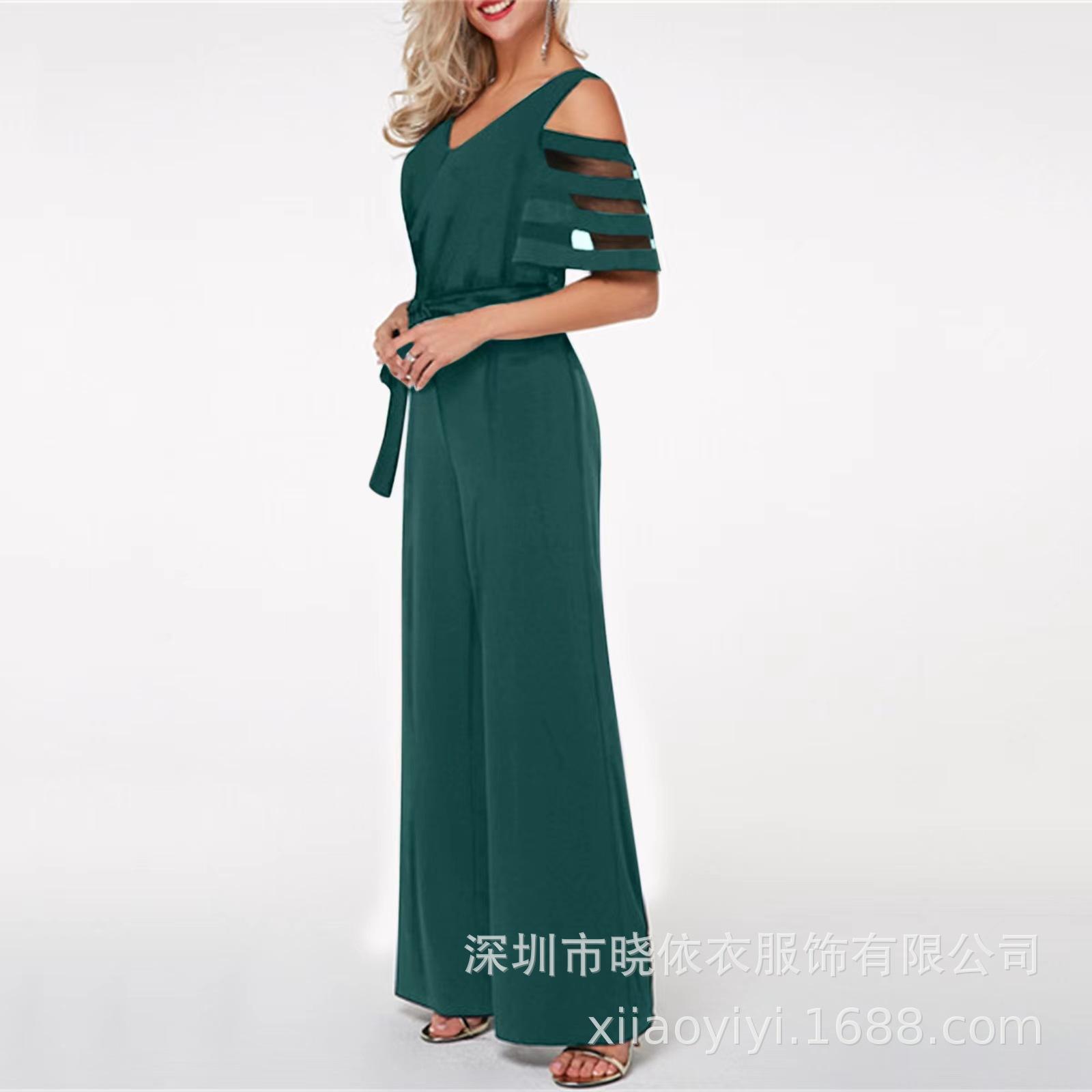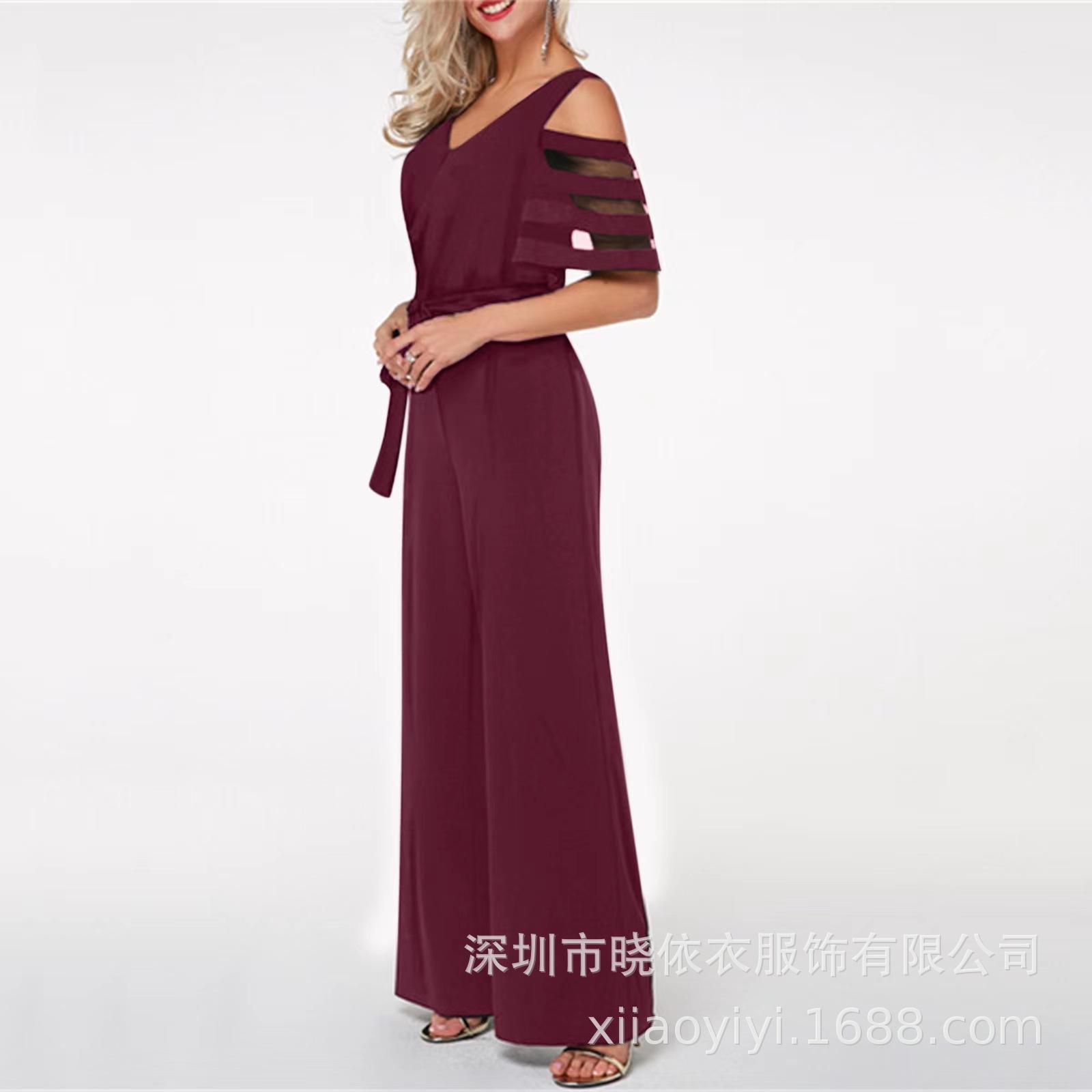Amazon Transfronterizo Europeo y Americano Cuello en V Hombro Color Sólido Cintura Alta Pantalones de Fiesta Cinturón Pantalones de Pierna Ancha para Mujer