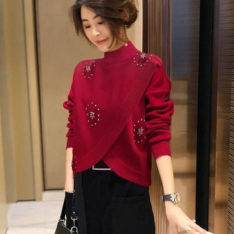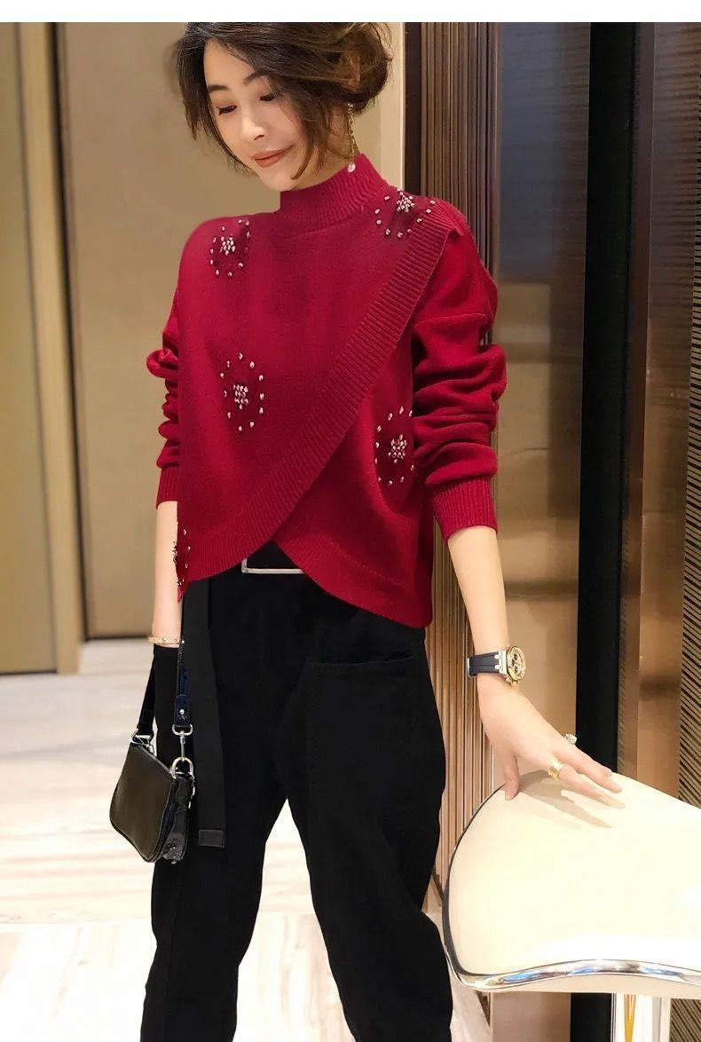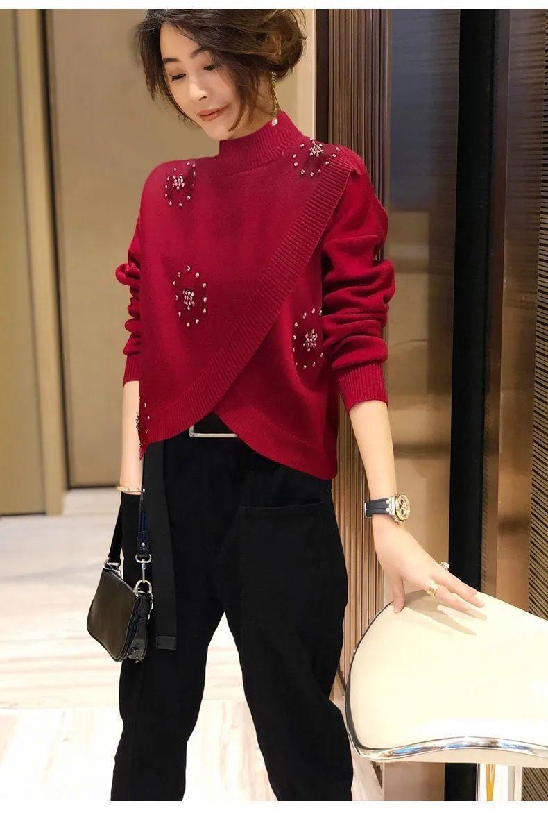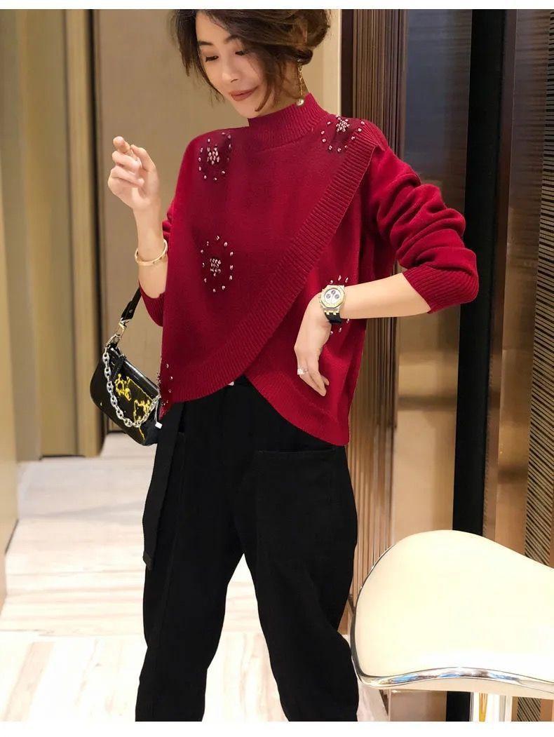 Estación Europea 2023 Nuevo Otoño y Primavera Suéter de Punto Suelto de Cuello Alto Estilo Extranjero Moda Versátil Suéter Rojo Tendencia para Mujer ins