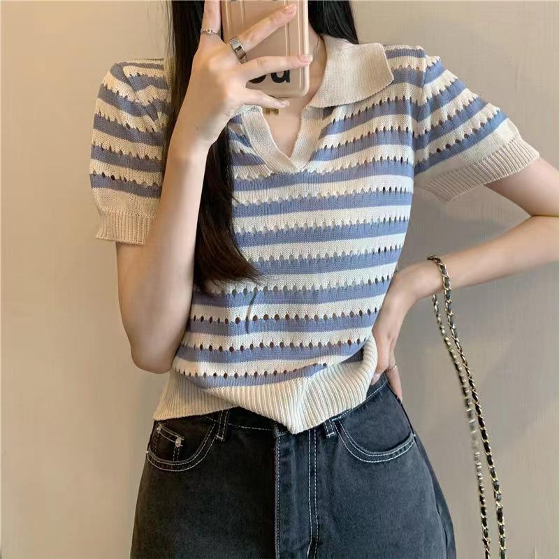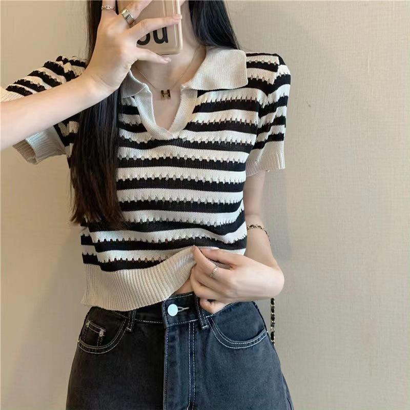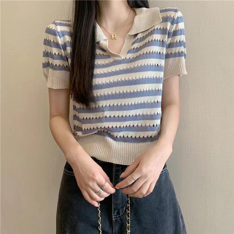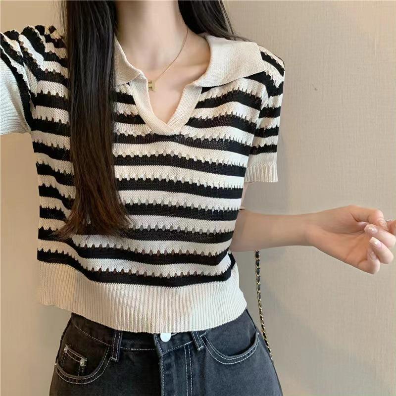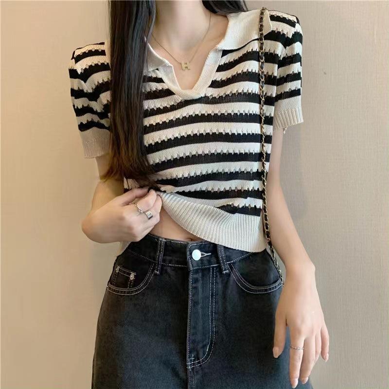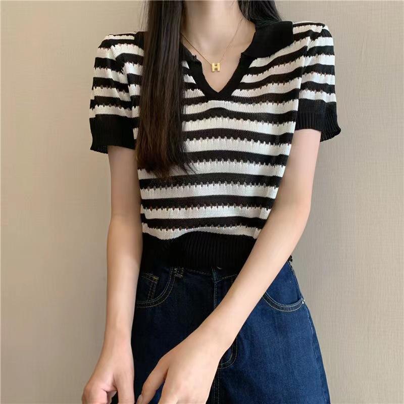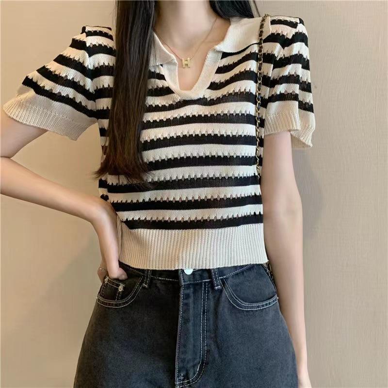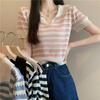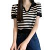 Diseño Sentido Nicho polo Cuello Rayado Hombro Tejido Manga Corta Camiseta de Mujer Verano Chic Corto Calado Top ins