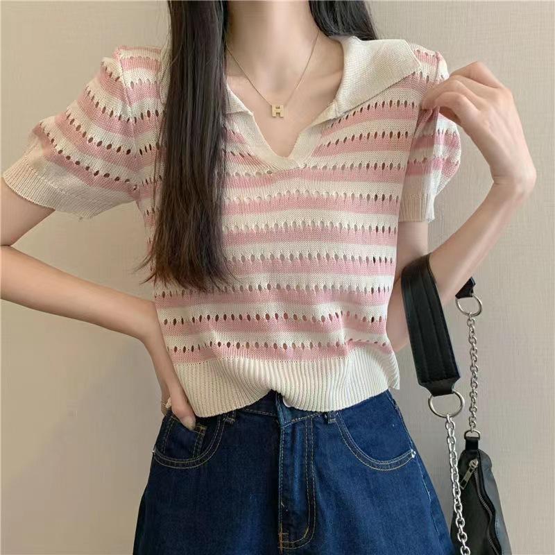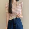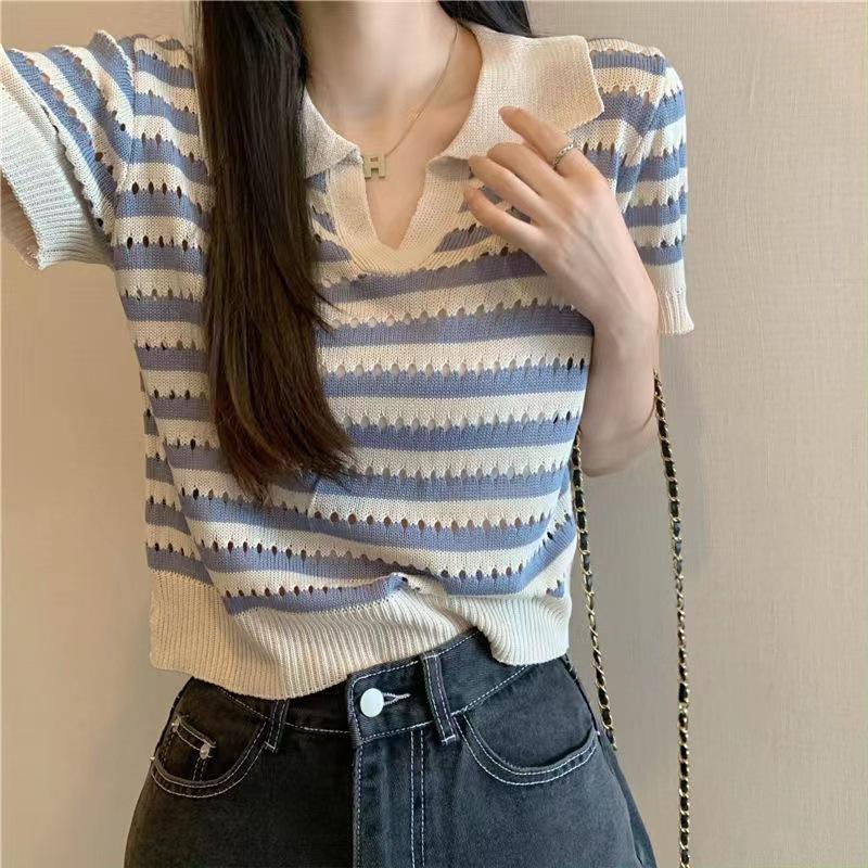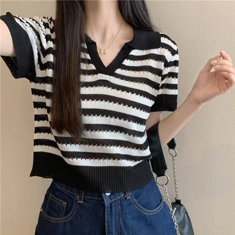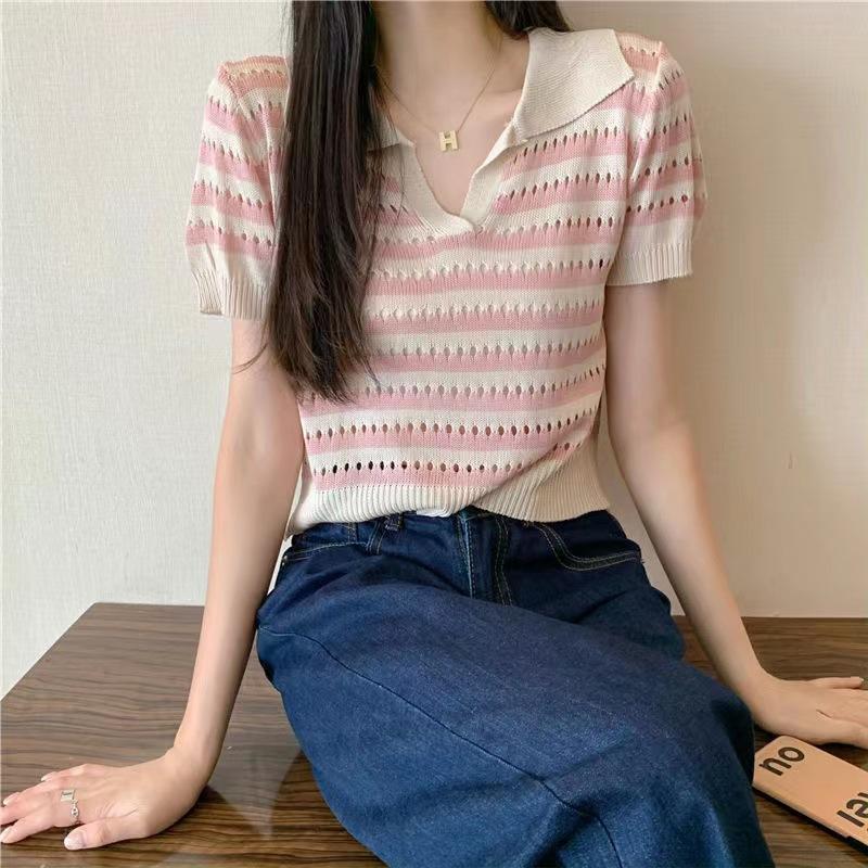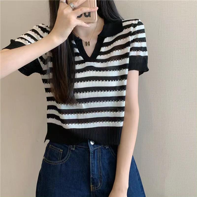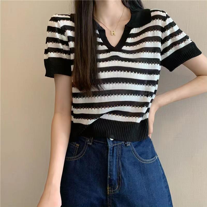 Diseño Sentido Nicho polo Cuello Rayado Hombro Tejido Manga Corta Camiseta de Mujer Verano Chic Corto Calado Top ins