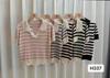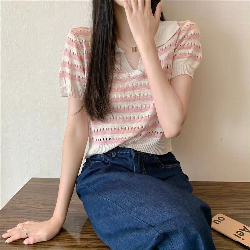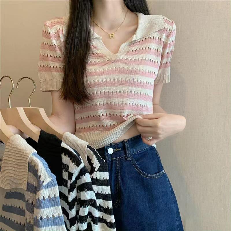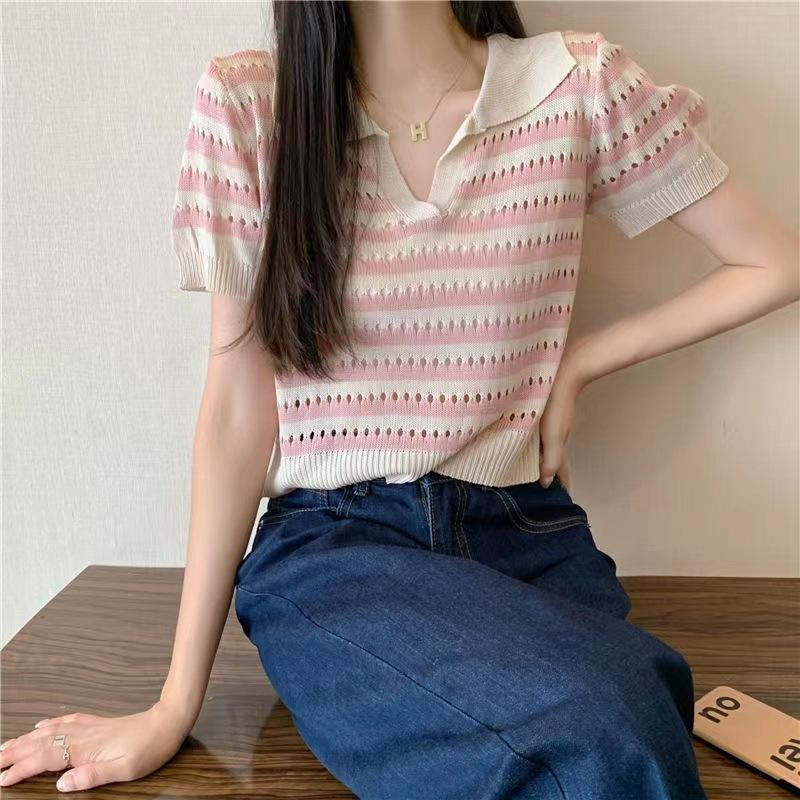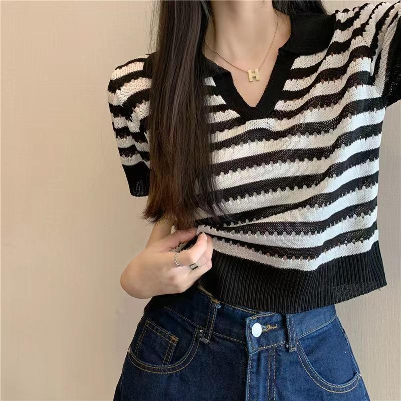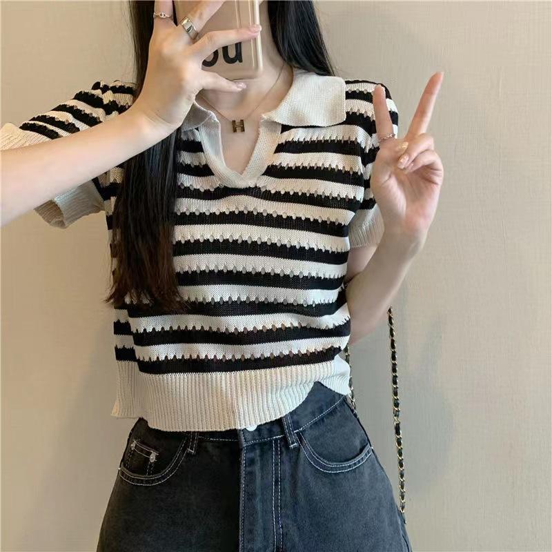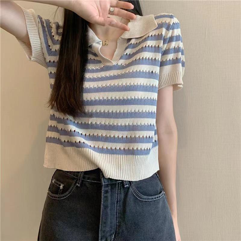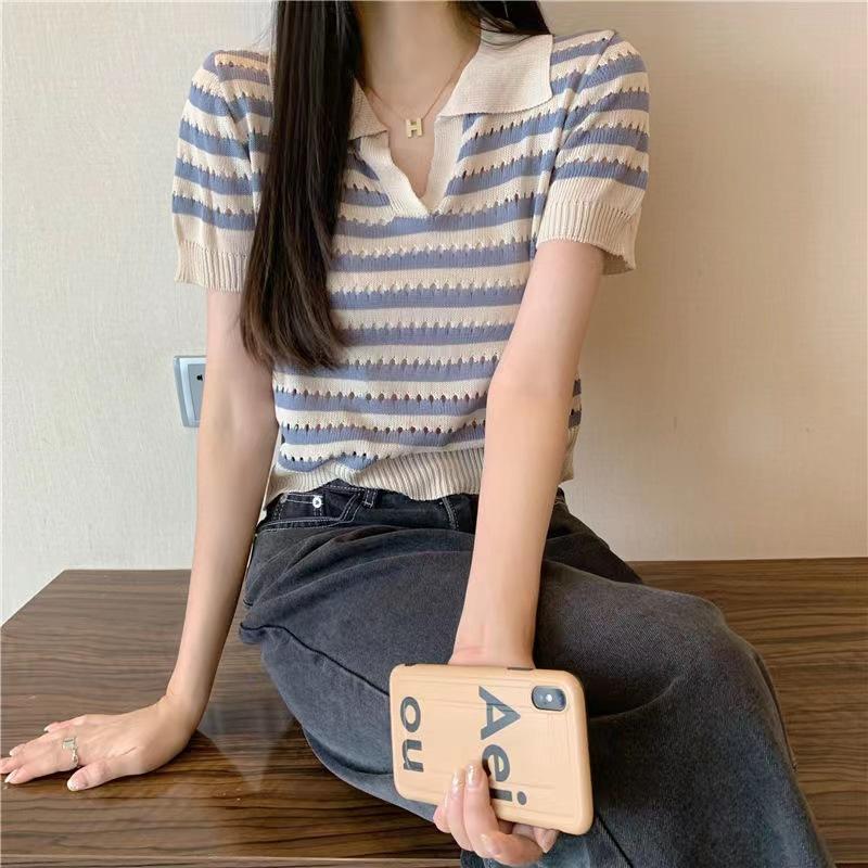 Diseño Sentido Nicho polo Cuello Rayado Hombro Tejido Manga Corta Camiseta de Mujer Verano Chic Corto Calado Top ins