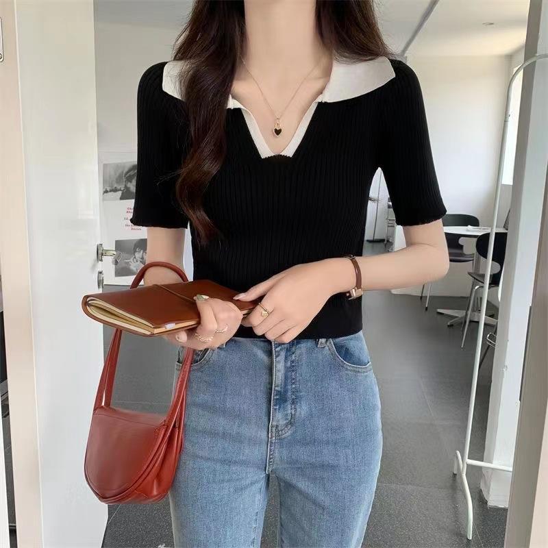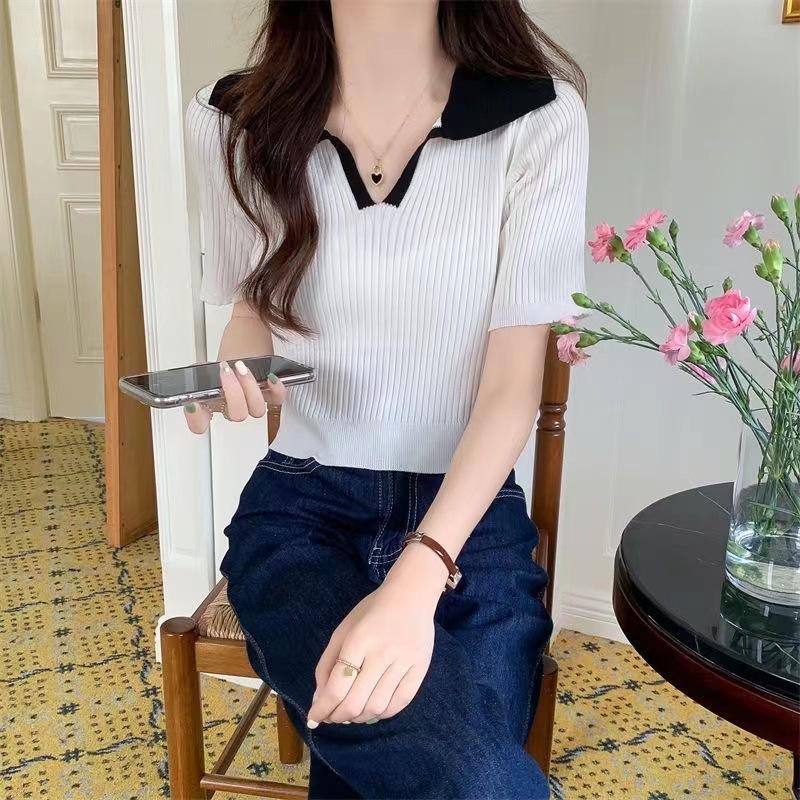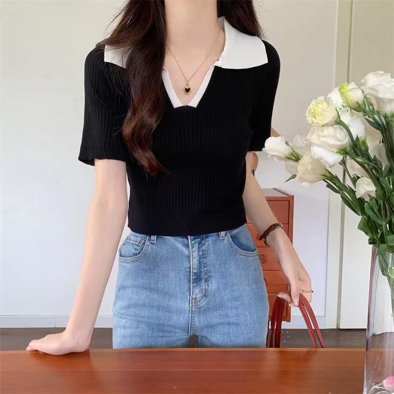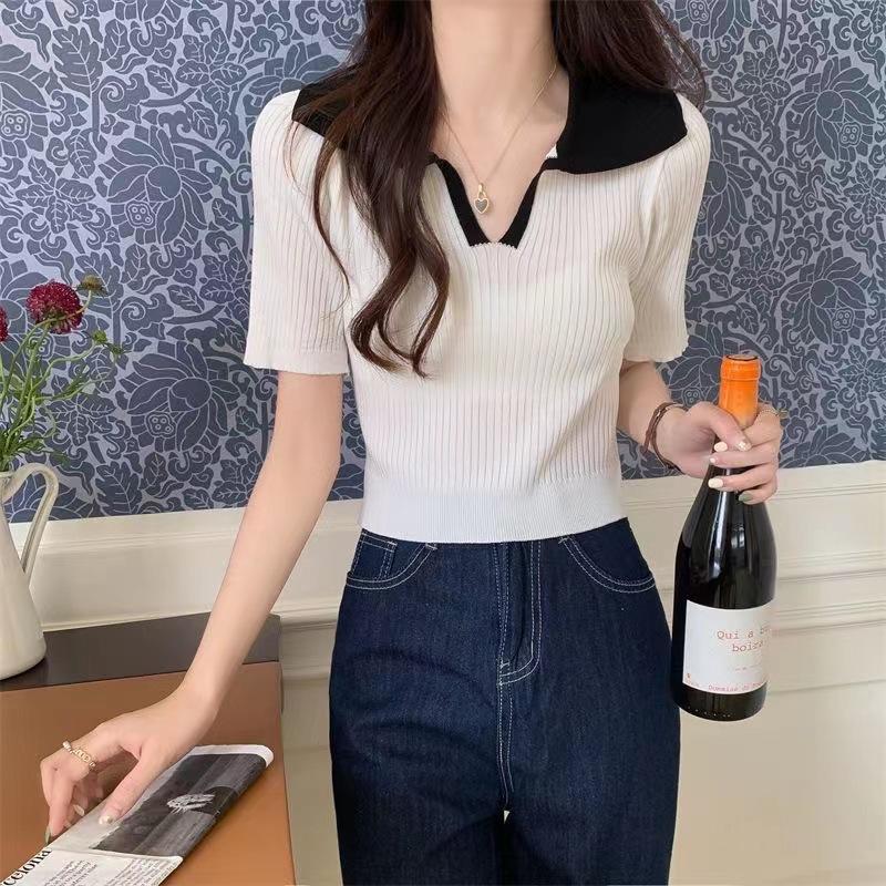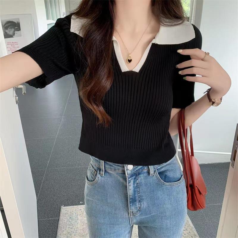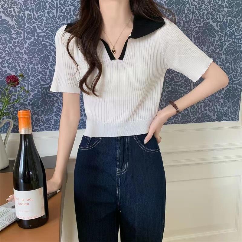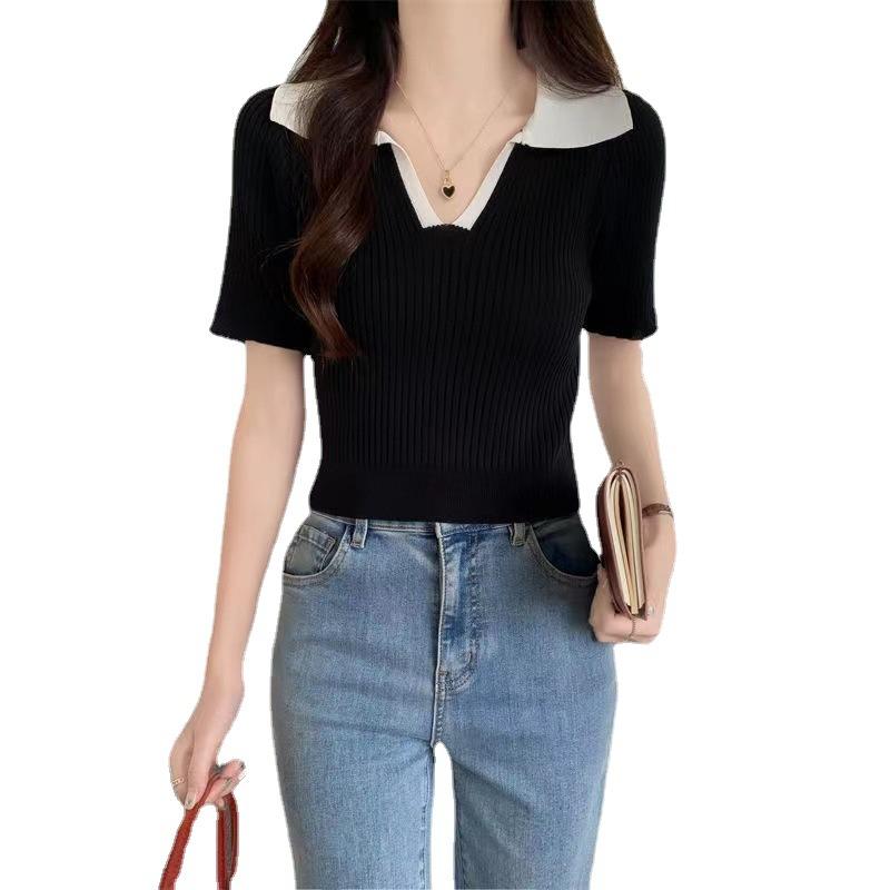 Cárdigan Corto de Punto de Manga Corta con Solapa a Contraste para Mujer Verano 2023 Nuevo Versátil Delgado Top Ajustado Camisa Pequeña de Moda para Mujer