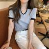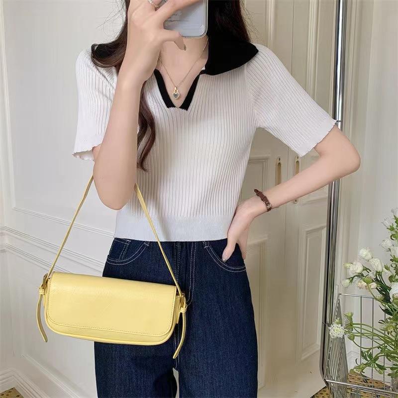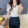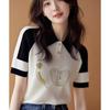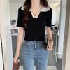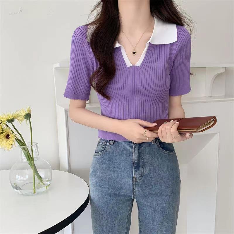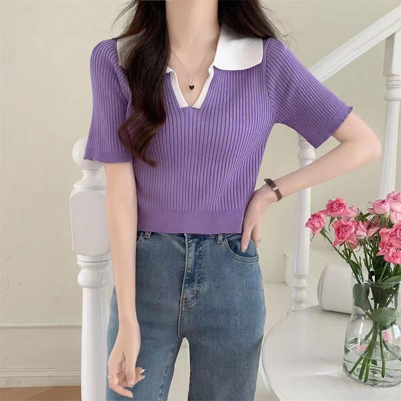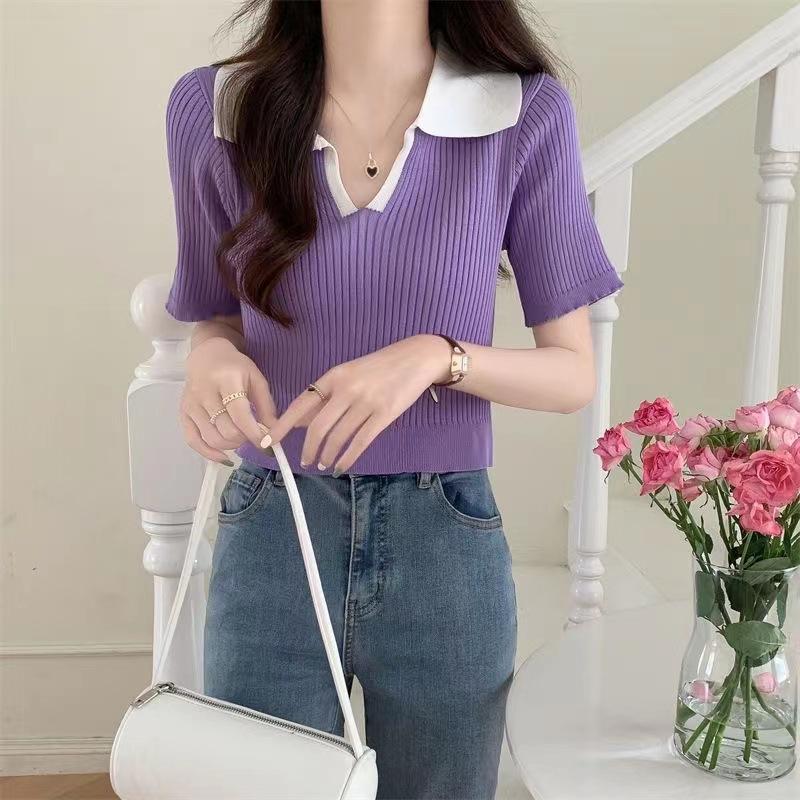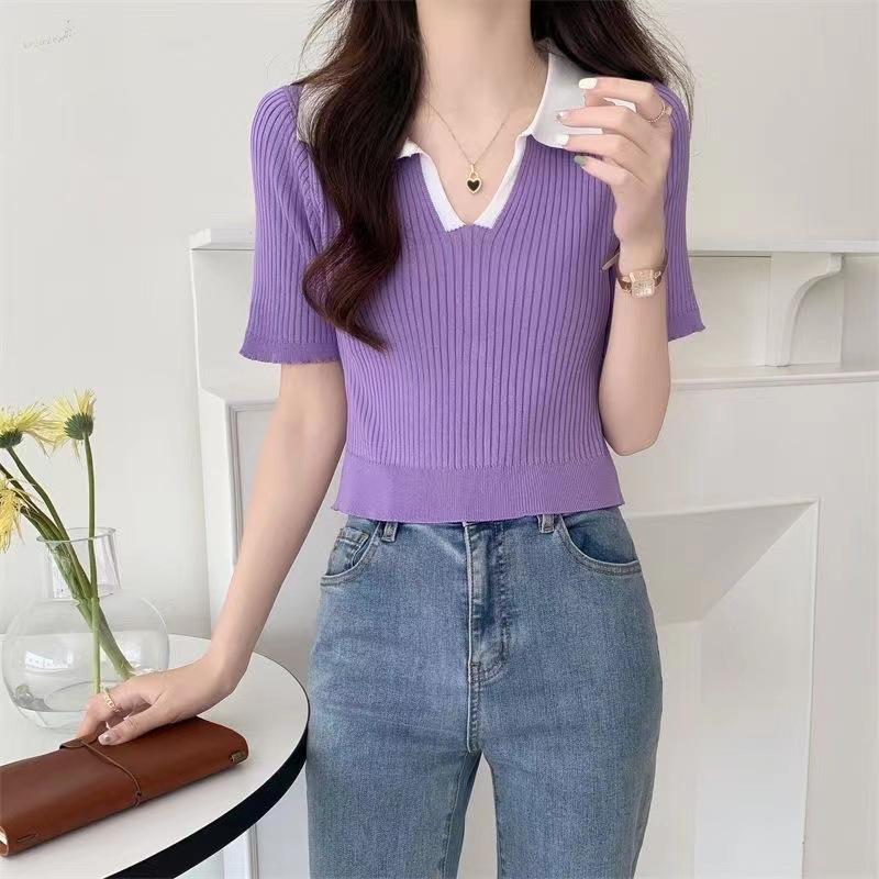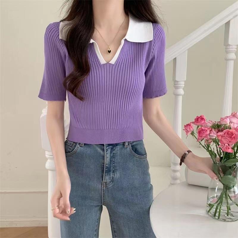 Cárdigan Corto de Punto de Manga Corta con Solapa a Contraste para Mujer Verano 2023 Nuevo Versátil Delgado Top Ajustado Camisa Pequeña de Moda para Mujer