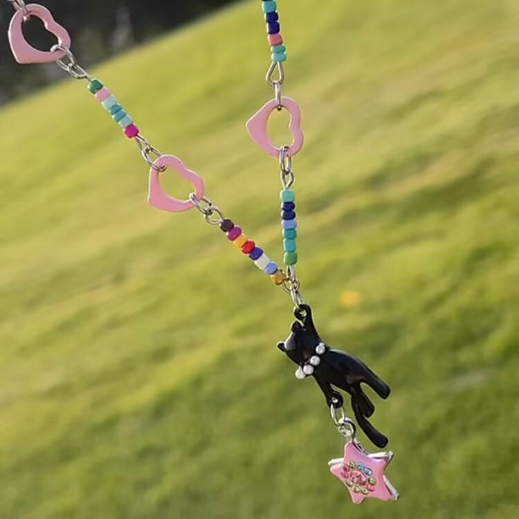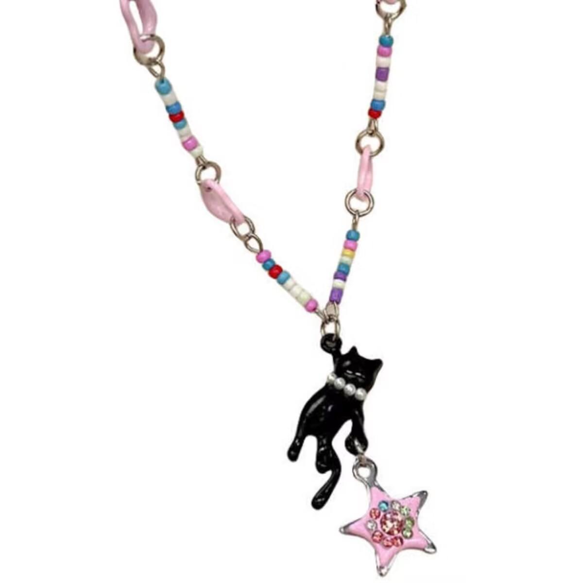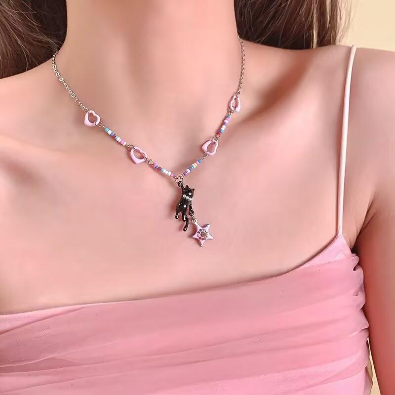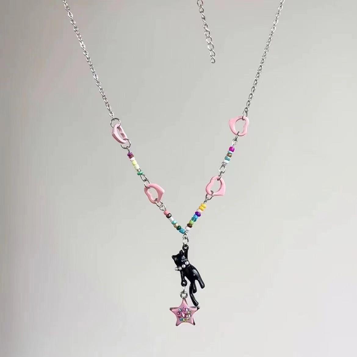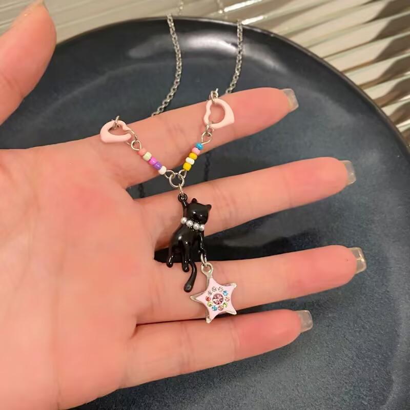 Robando Gatito Estrella ~ Colgante de Estrella Rosa Collar de Gato Negro Diseño Exquisito y Único Verano 2024 Cadena Clavicular para Fiesta de Estudiantes