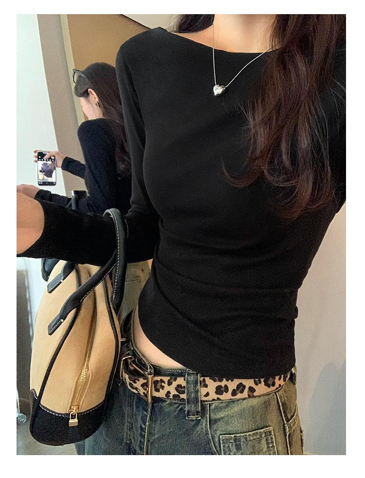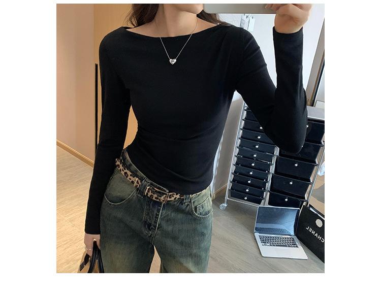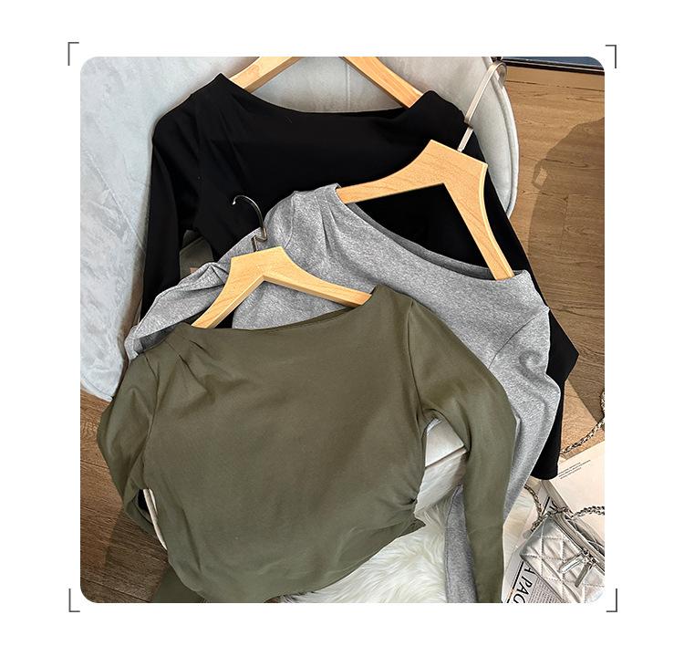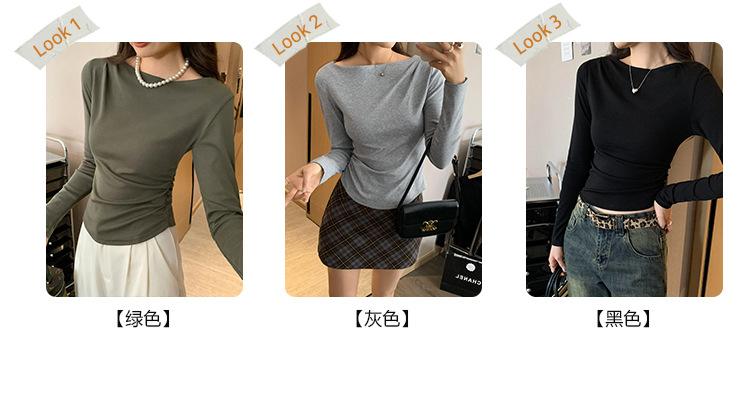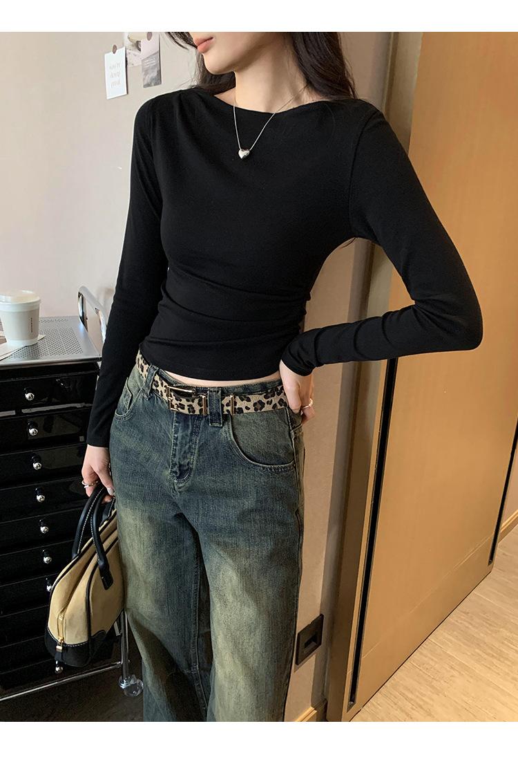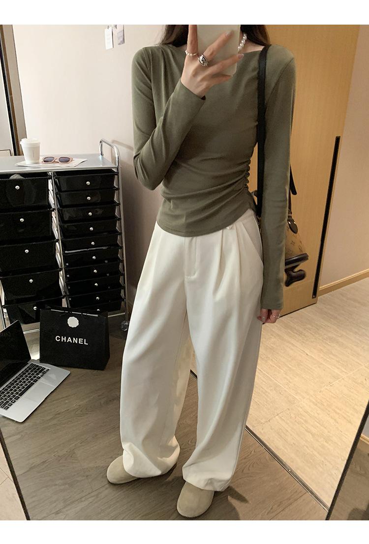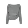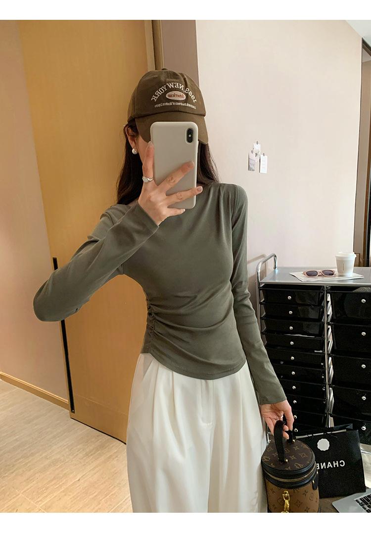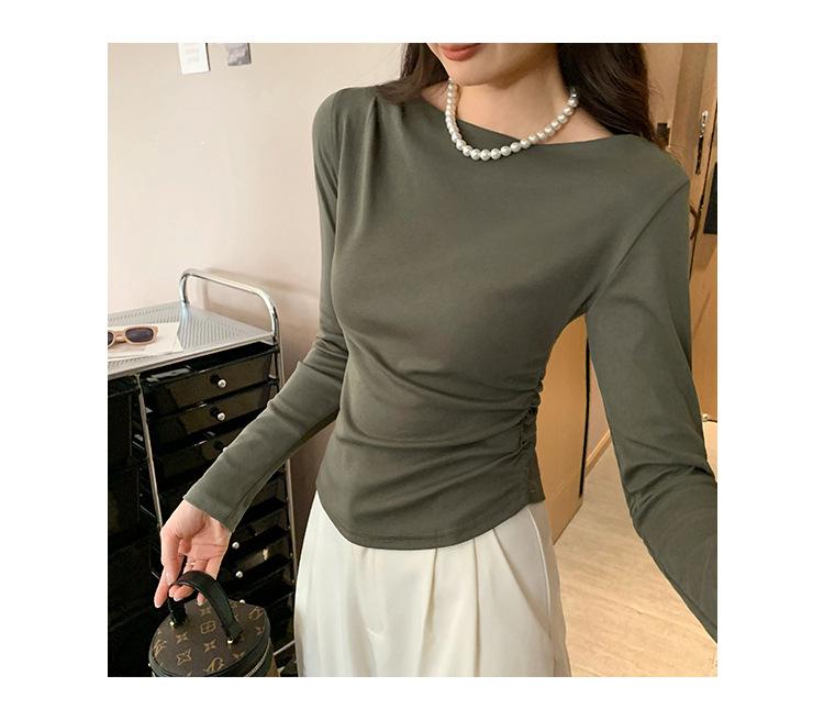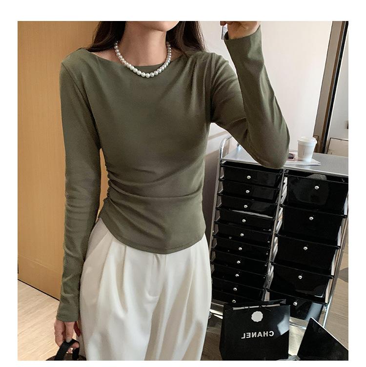 Imagen real de una hermosa y única camiseta de manga larga plisada con cintura ceñida para mujer, estilo Pure Desire, primavera 2025.