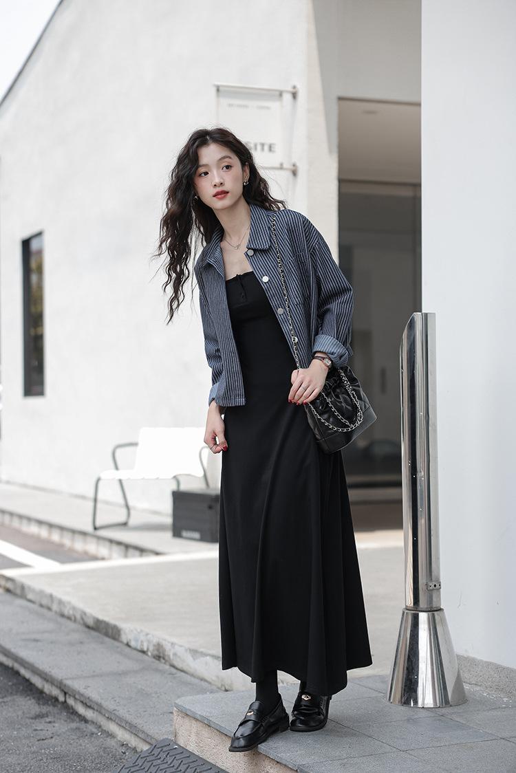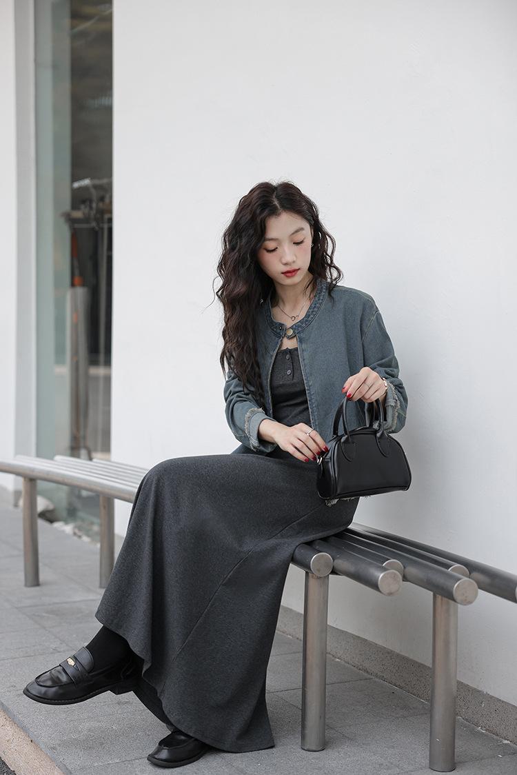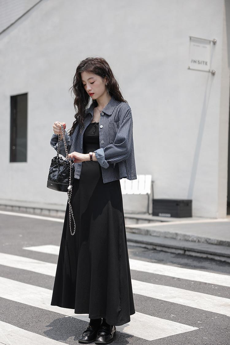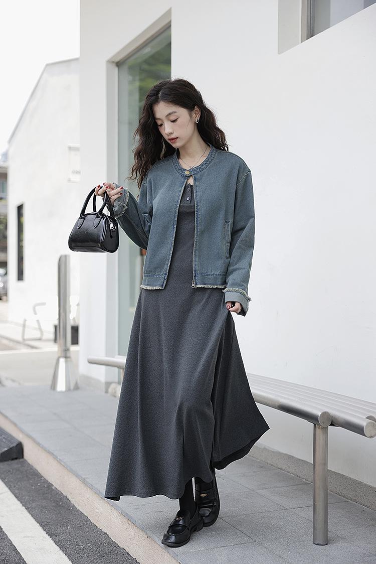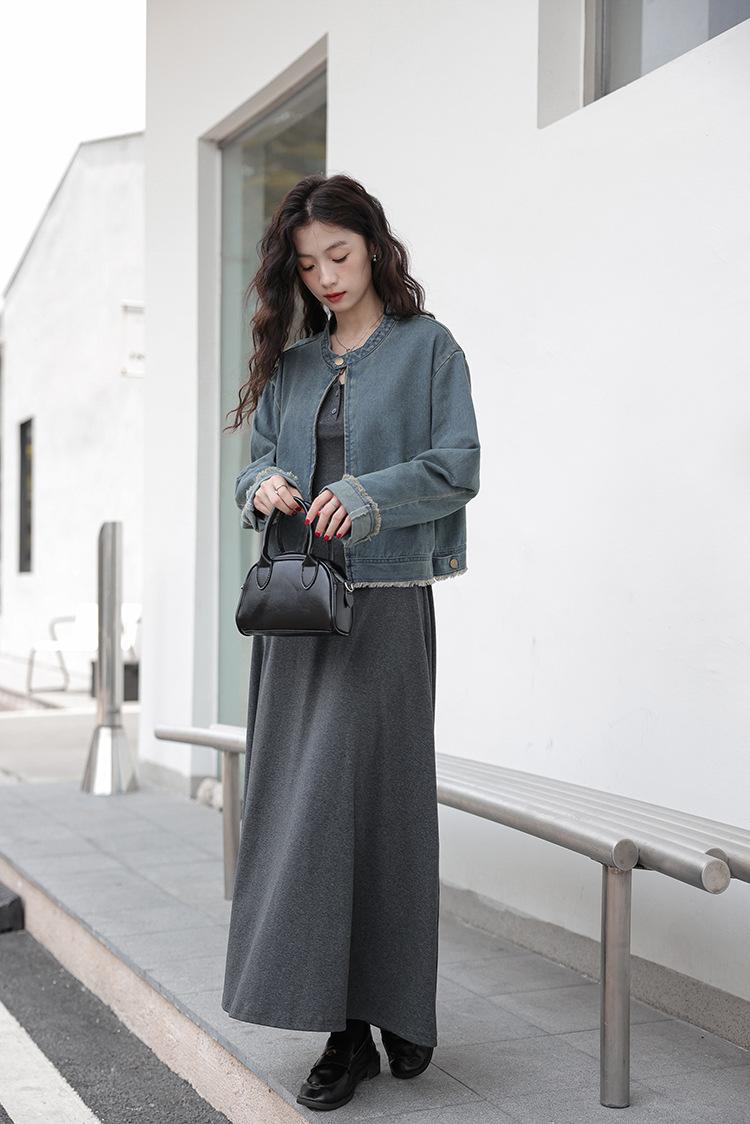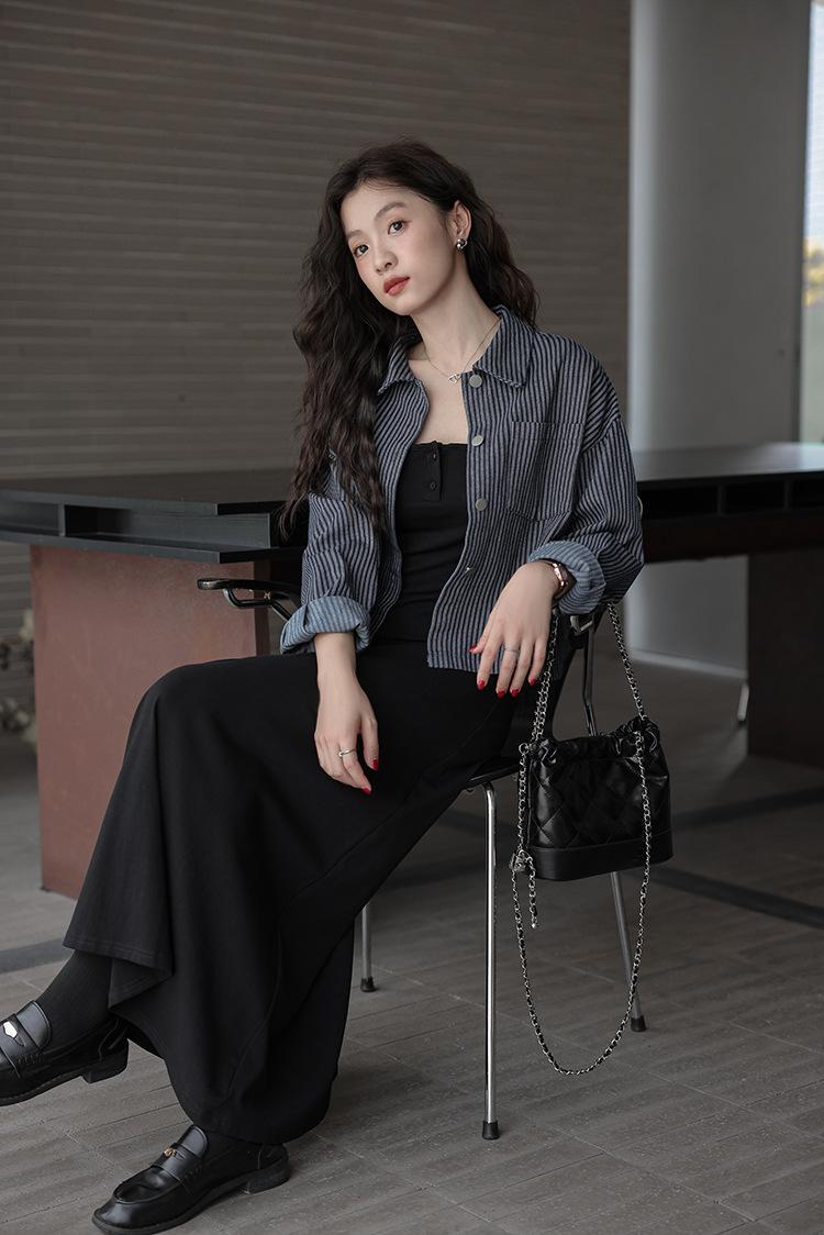 2024 otoño e invierno nuevo estilo coreano retro azul a rayas cuello POLO Joker delgado abrigo corto de mezclilla moda femenina
