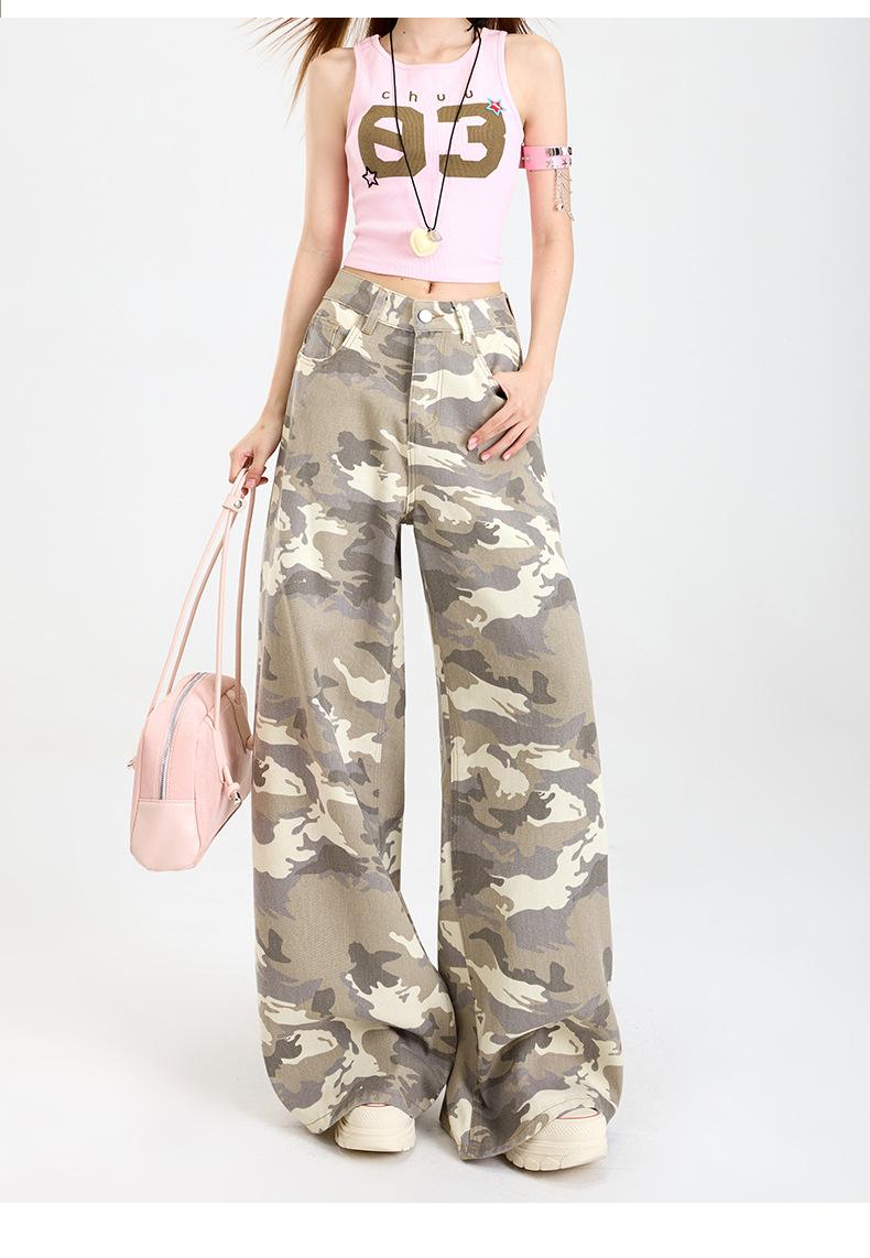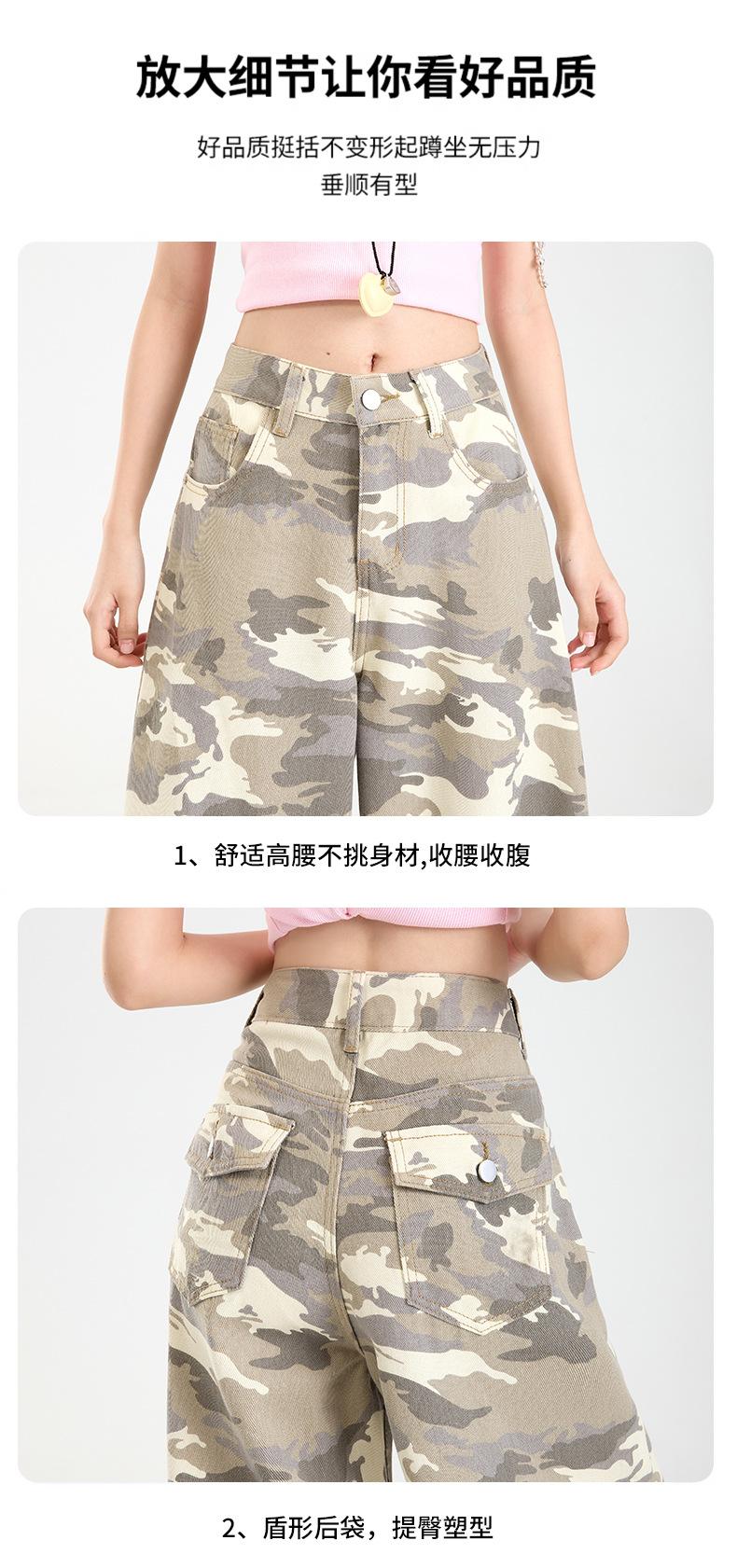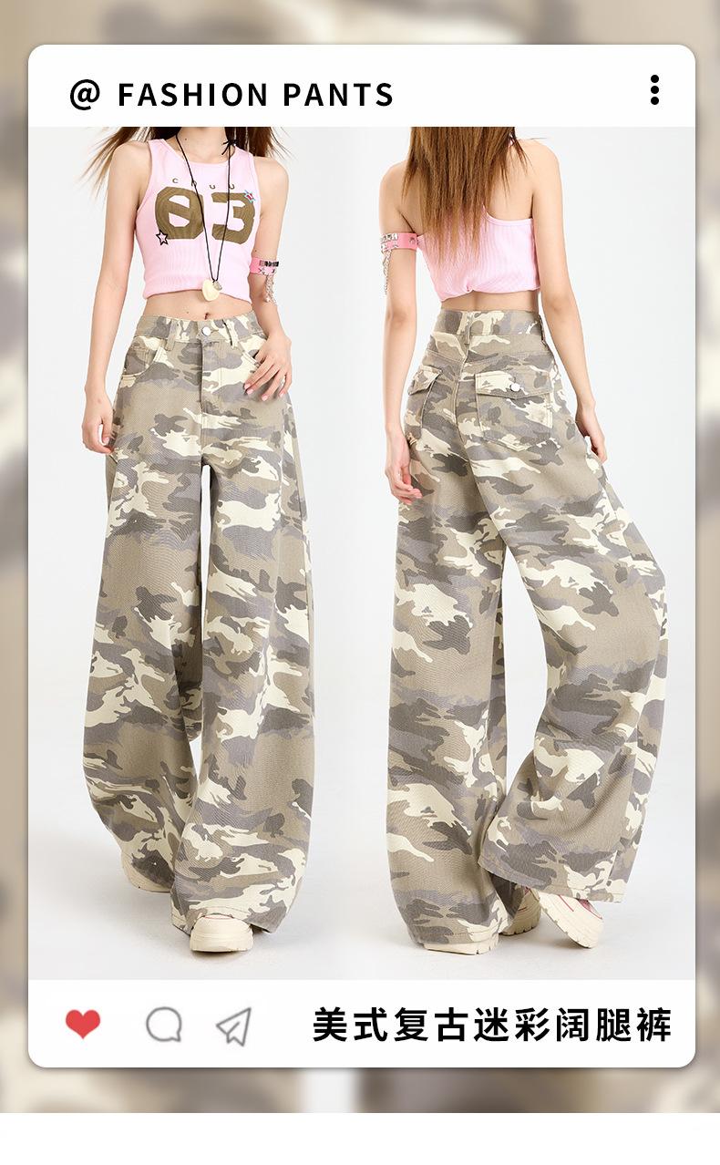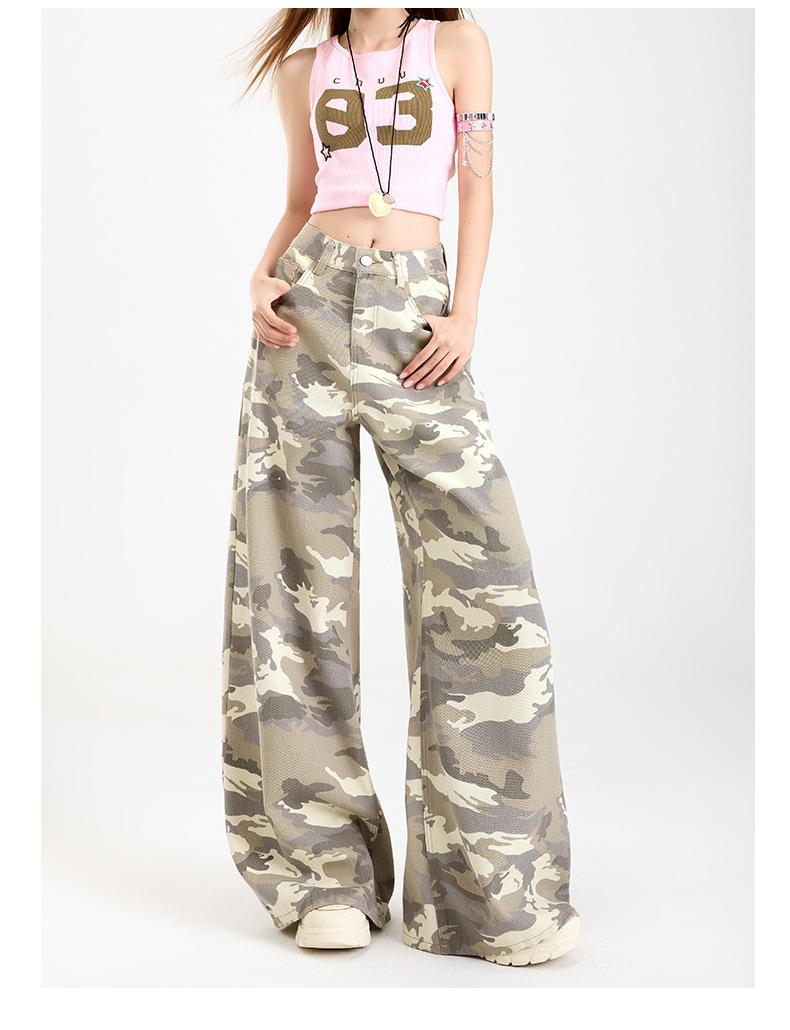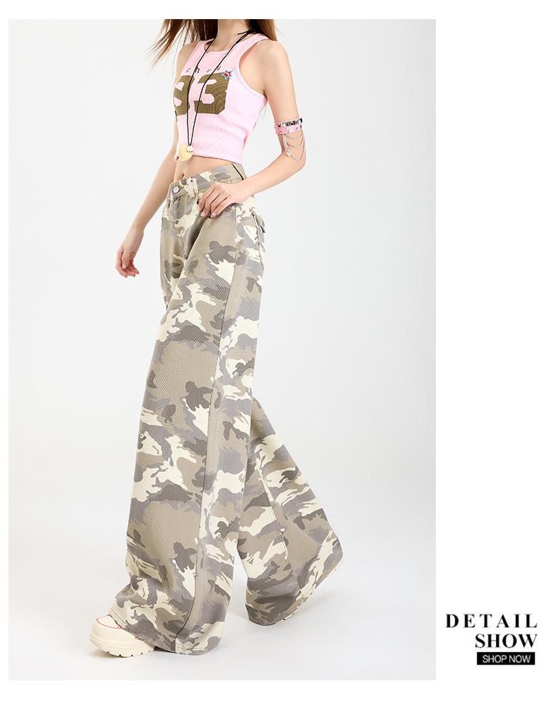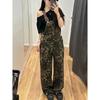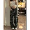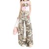 Overol de Camuflaje Europeo y Americano Transfronterizo Moda caqui Serie de Camuflaje Primavera y Verano Cintura Alta Americano Suelto Pierna Ancha Denim