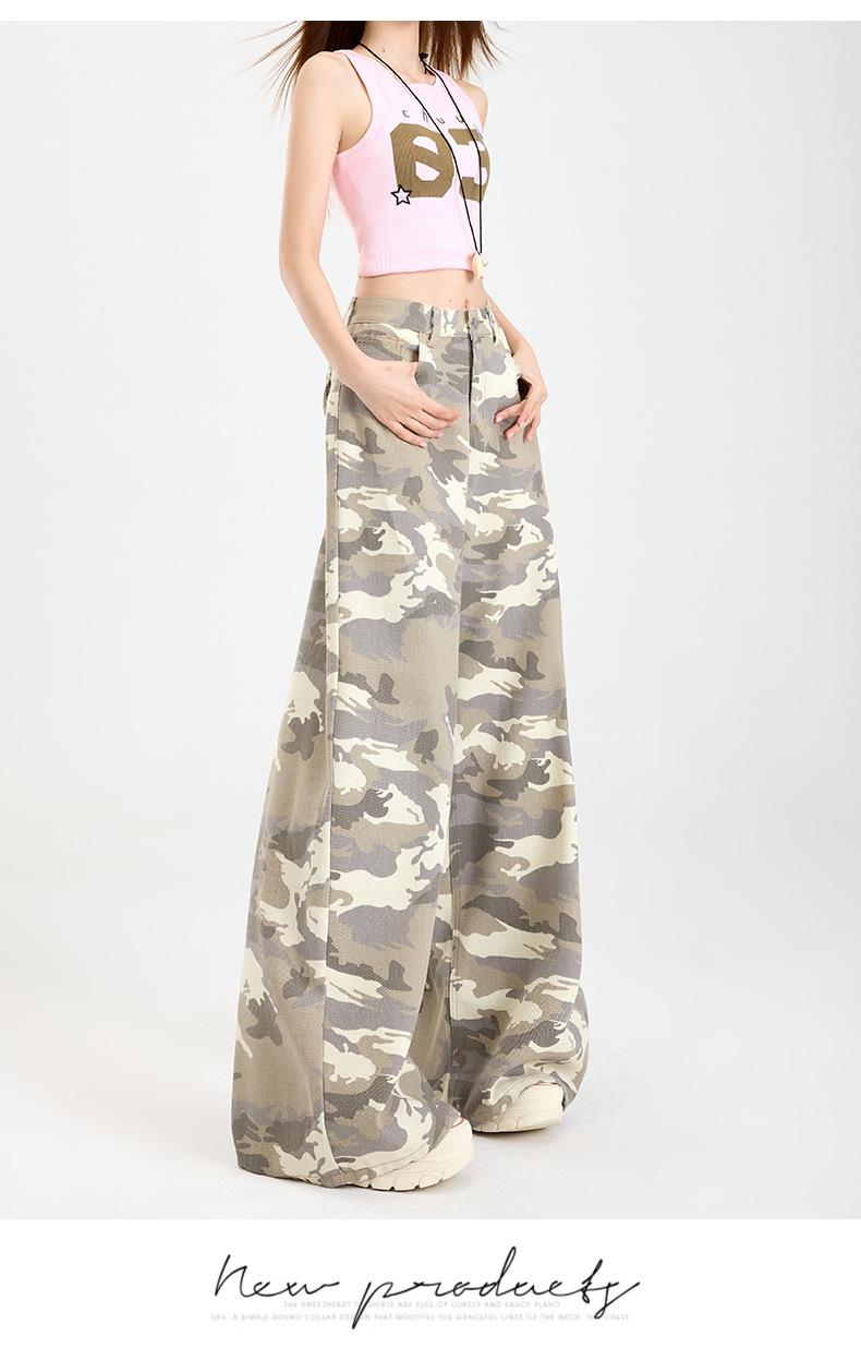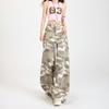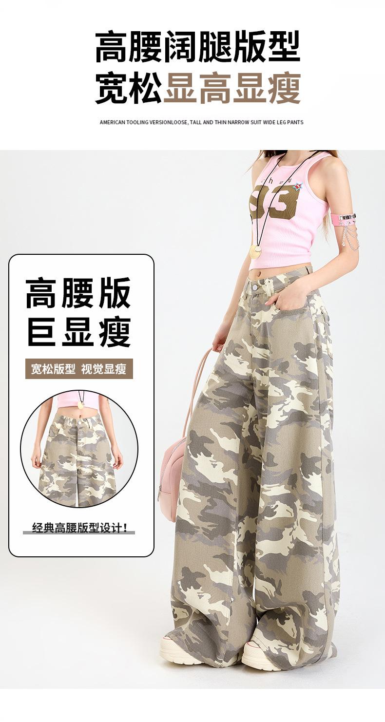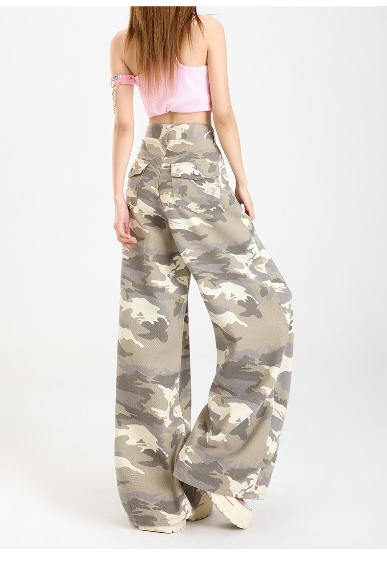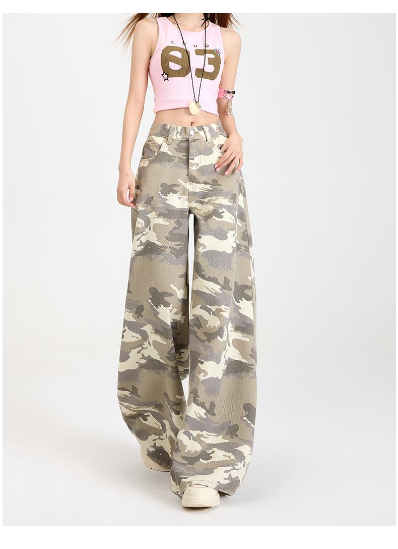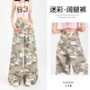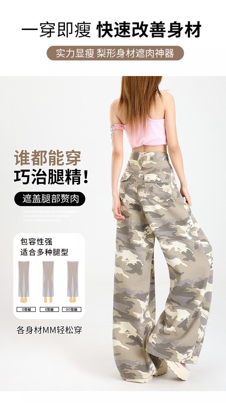 Overol de Camuflaje Europeo y Americano Transfronterizo Moda caqui Serie de Camuflaje Primavera y Verano Cintura Alta Americano Suelto Pierna Ancha Denim