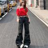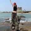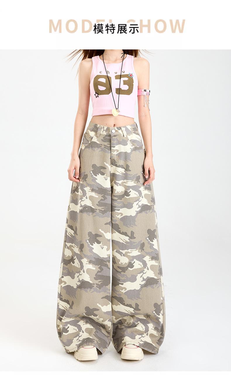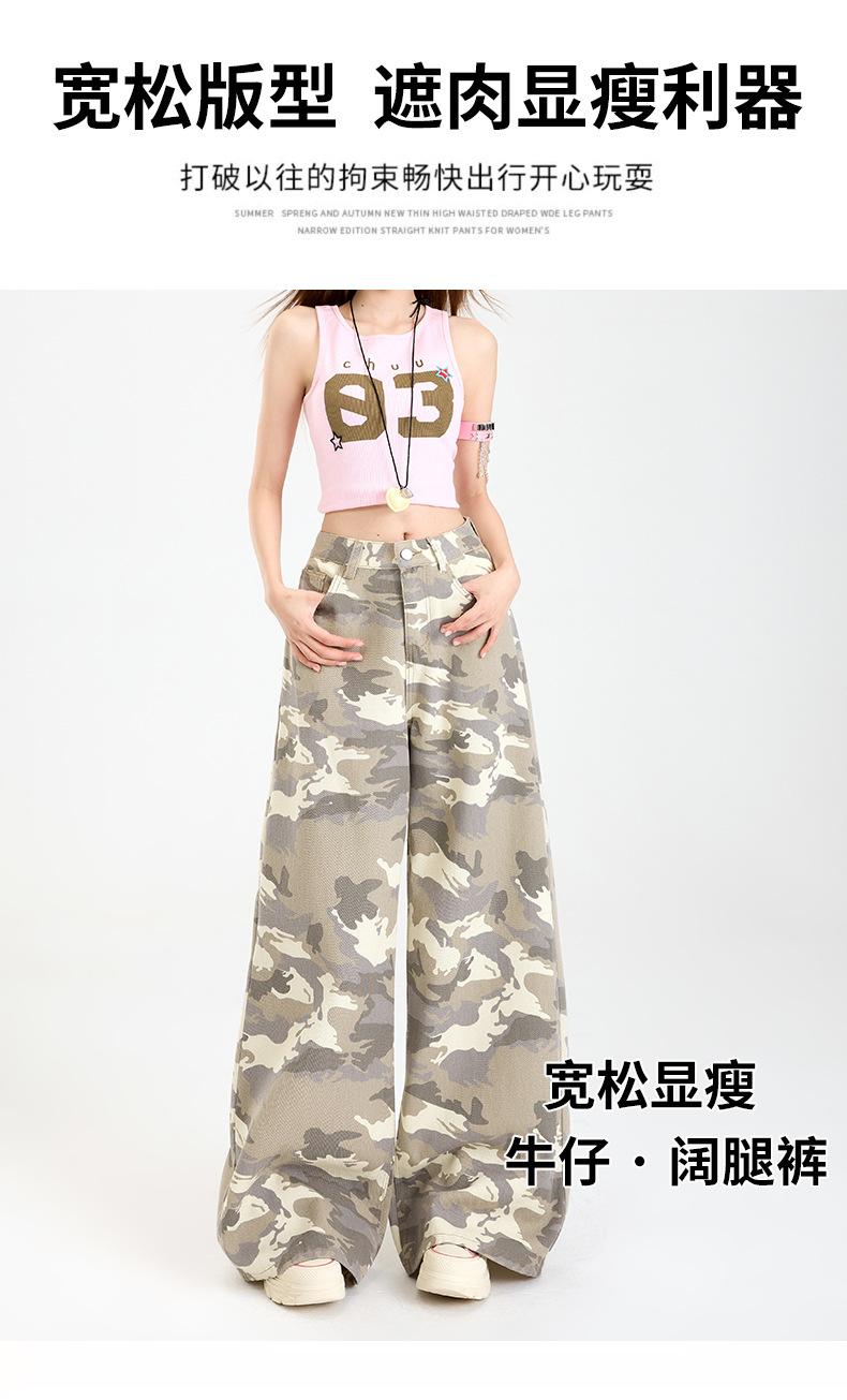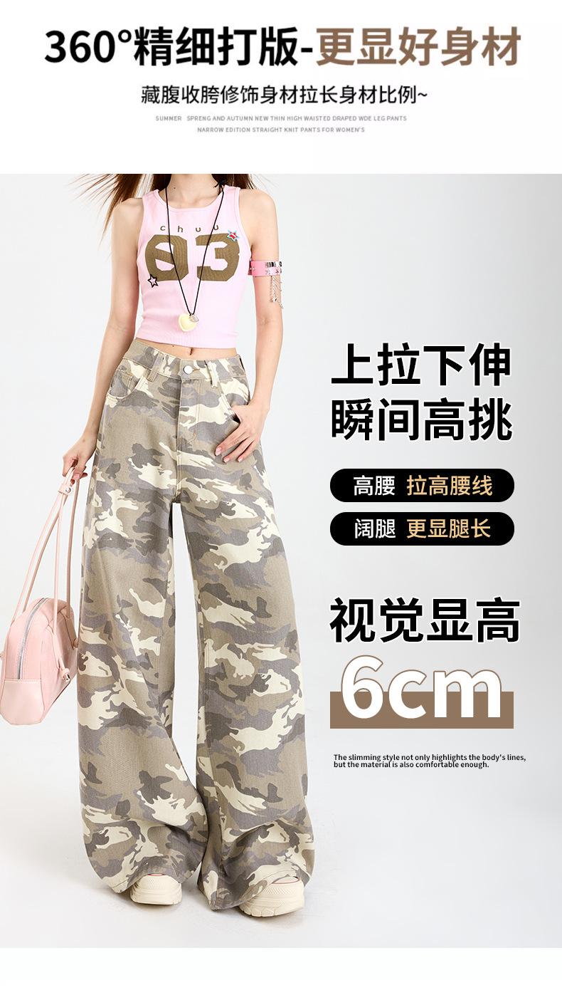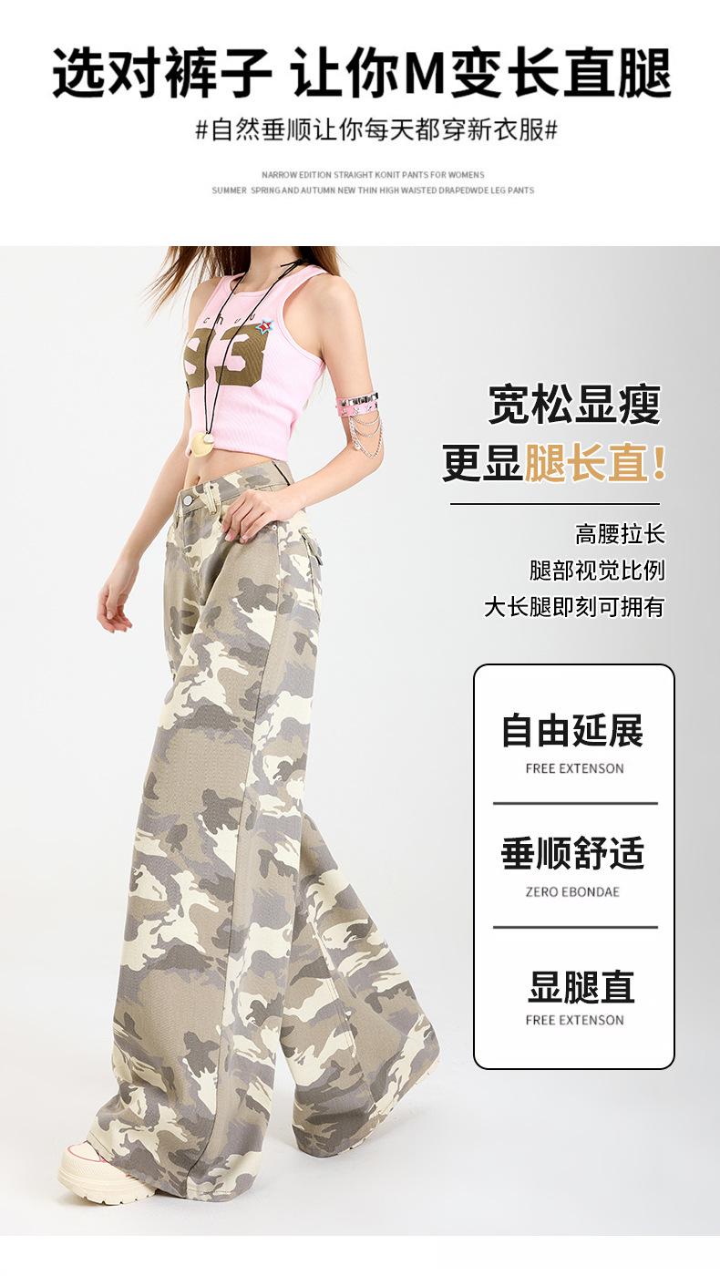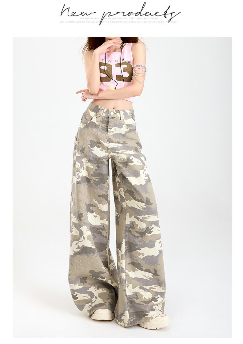Overol de Camuflaje Europeo y Americano Transfronterizo Moda caqui Serie de Camuflaje Primavera y Verano Cintura Alta Americano Suelto Pierna Ancha Denim