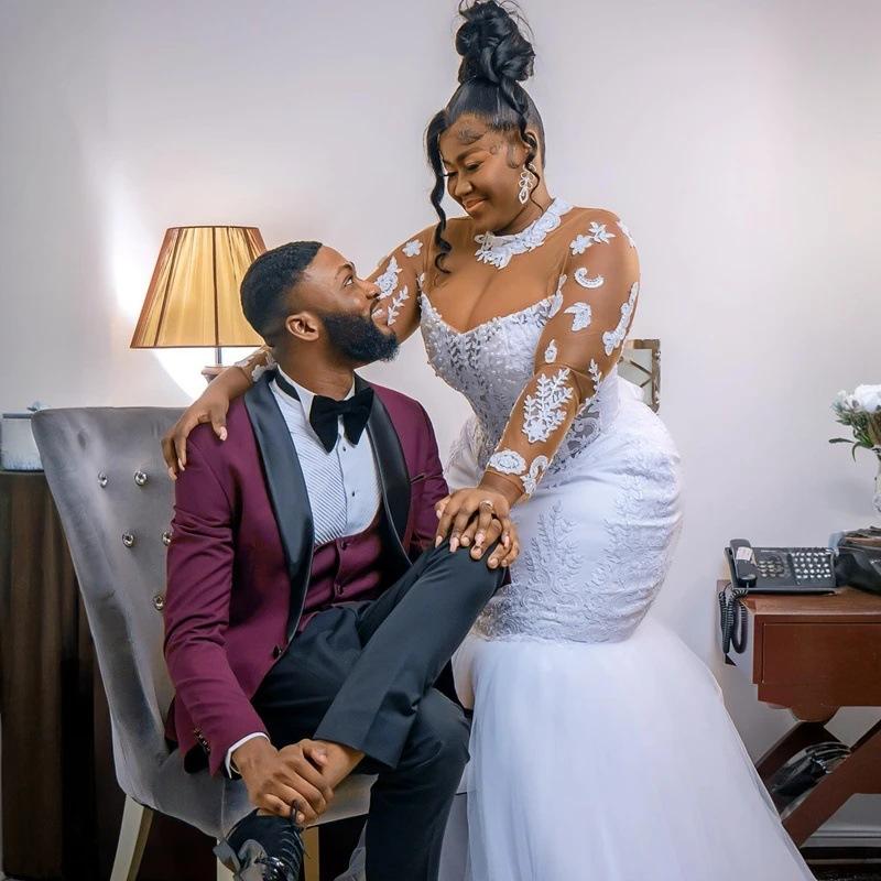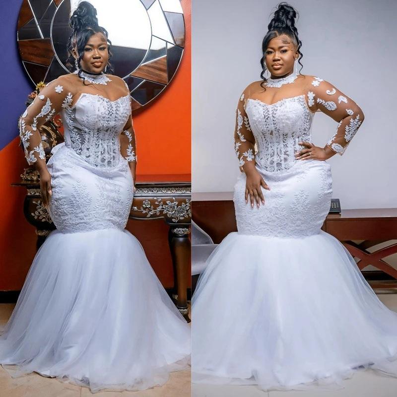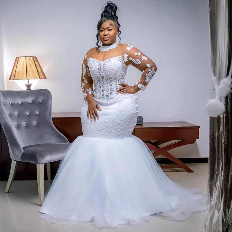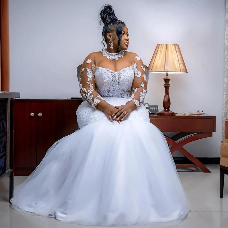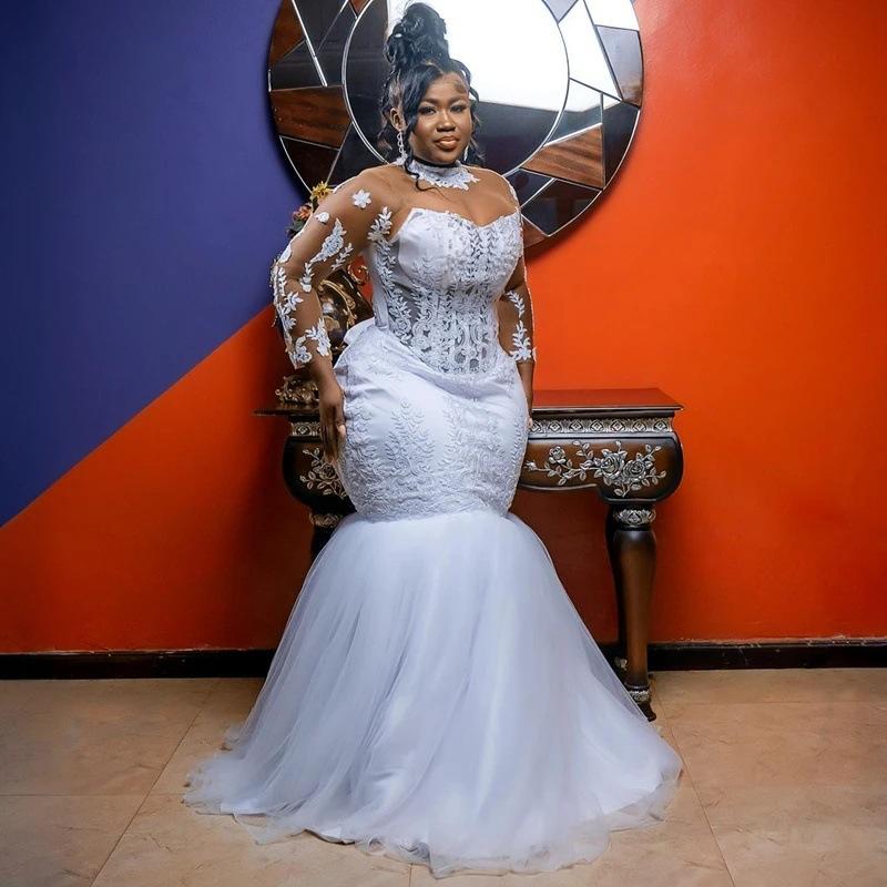 Vestidos de Novia Sirena Africana Cuello Alto Aplicaciones de Encaje Mangas Largas Vestidos de Novia Mujer Vestidos Formales de Fiesta