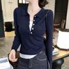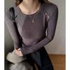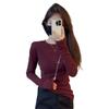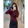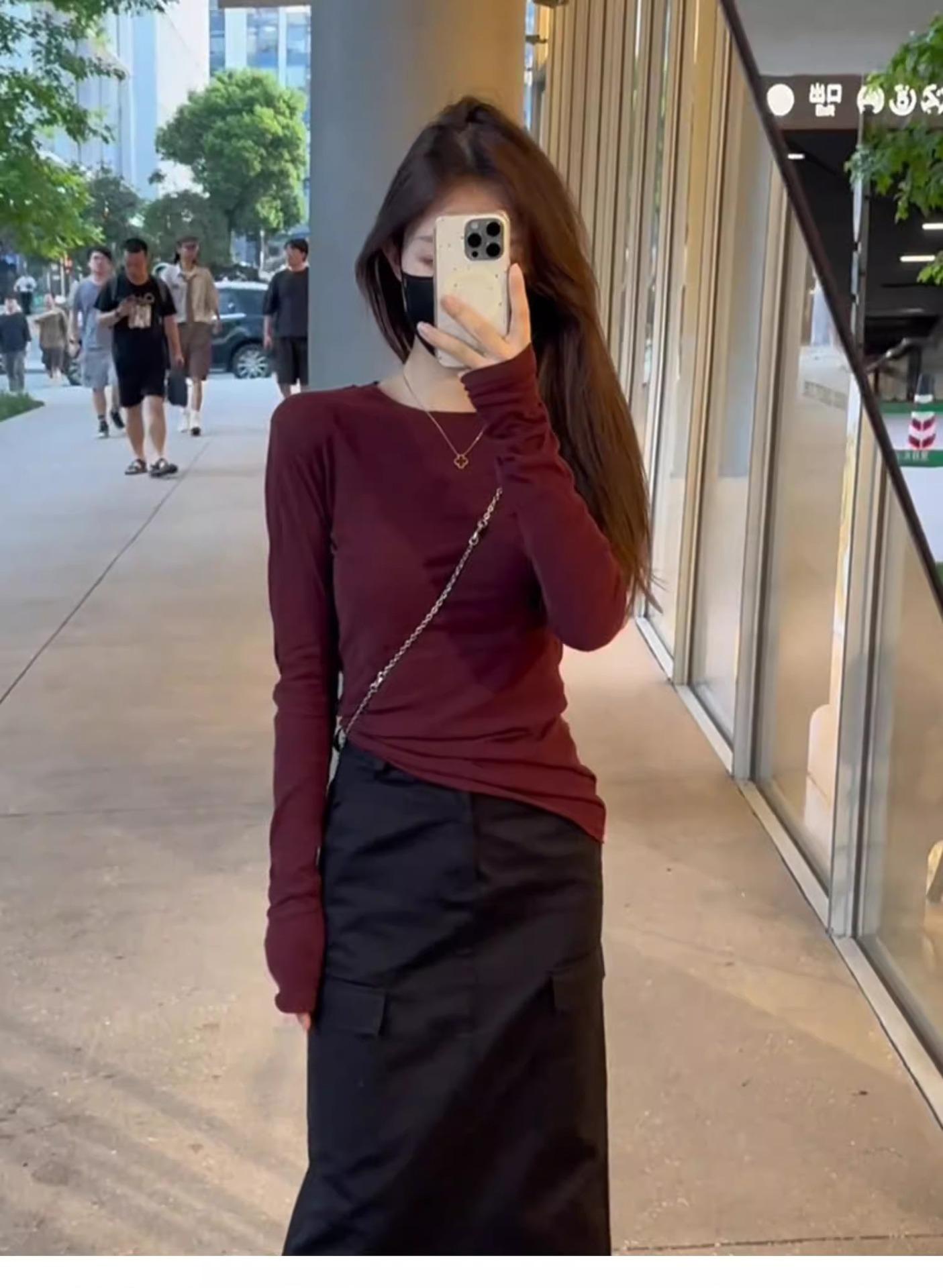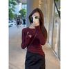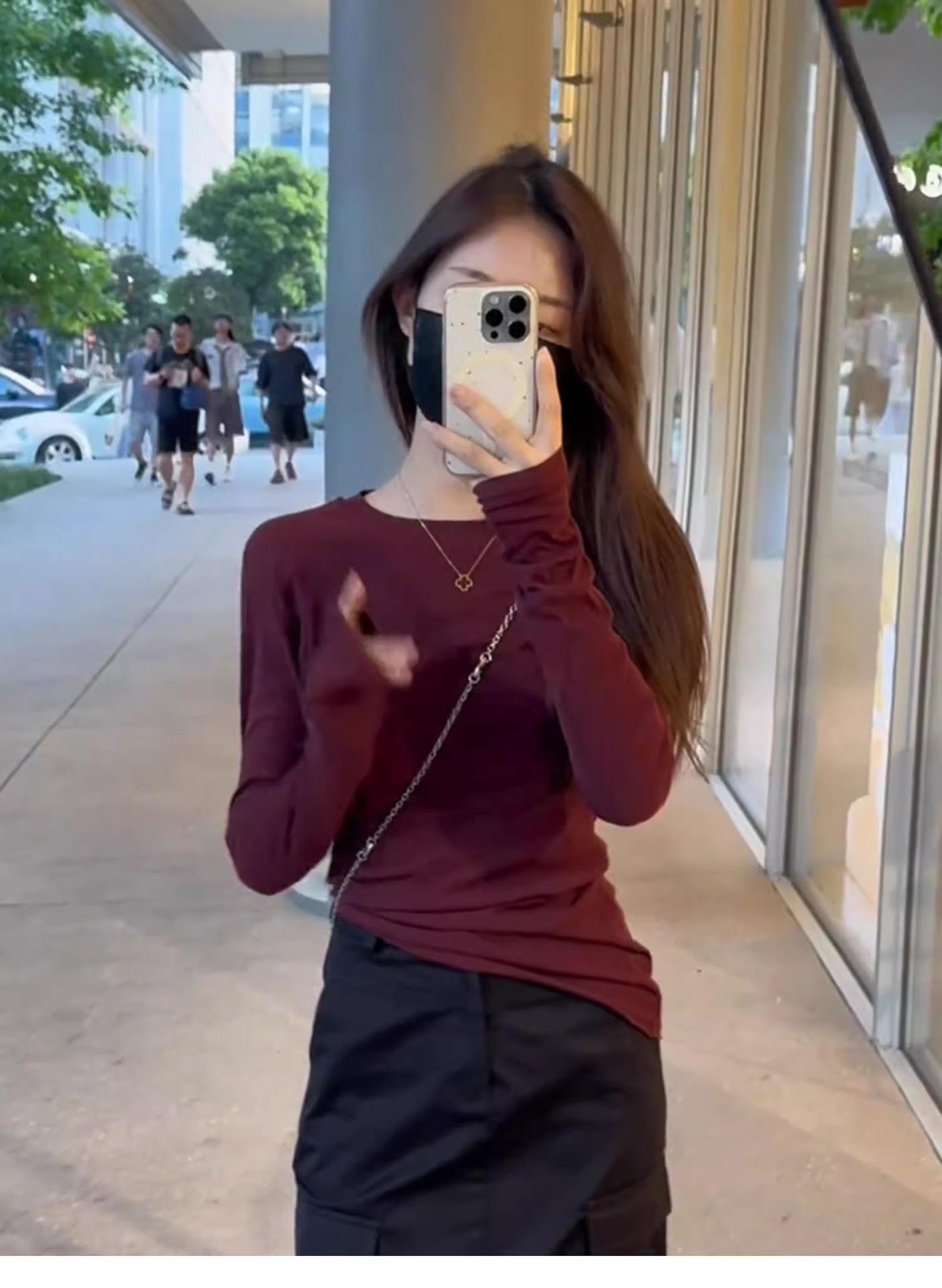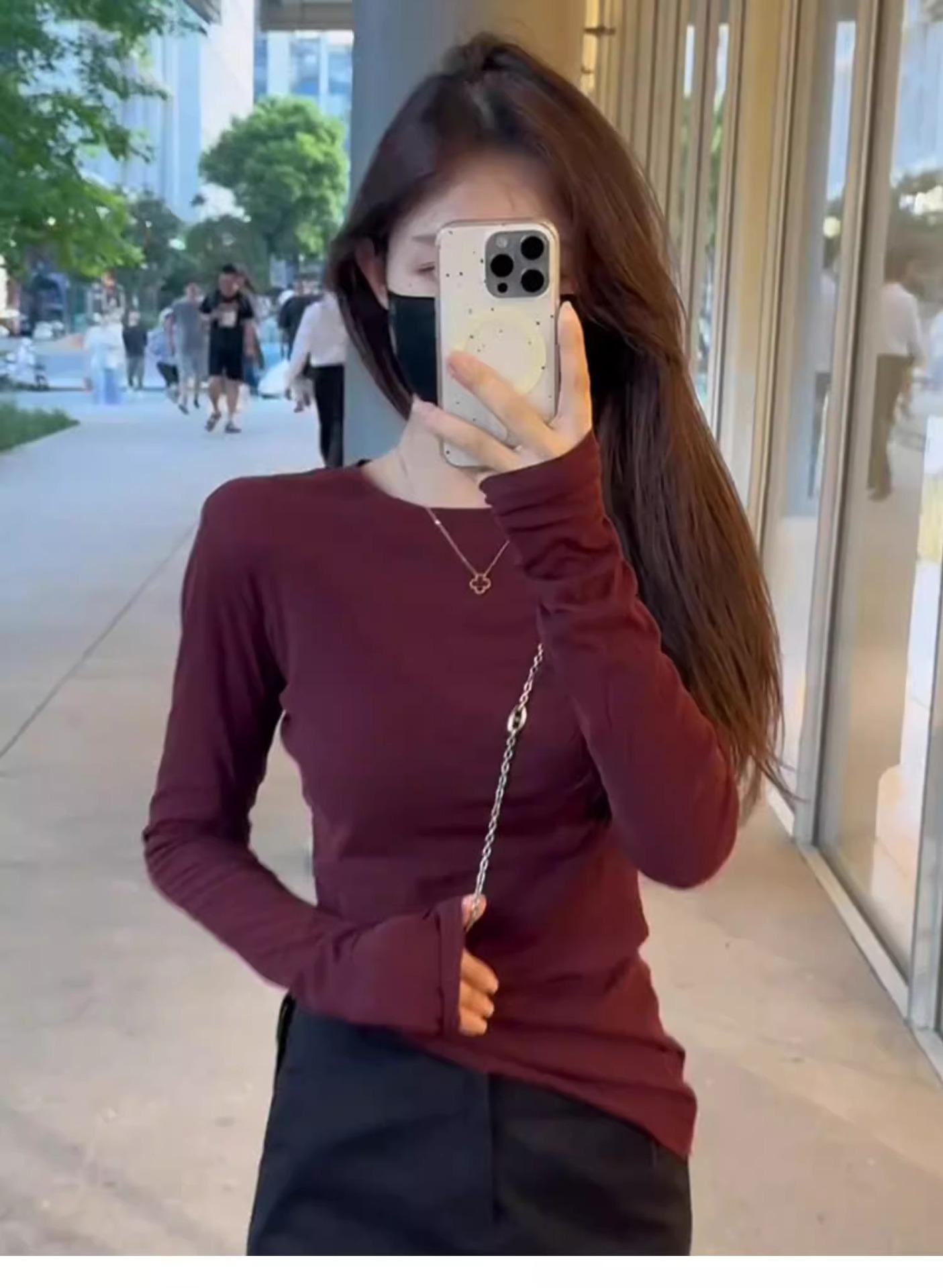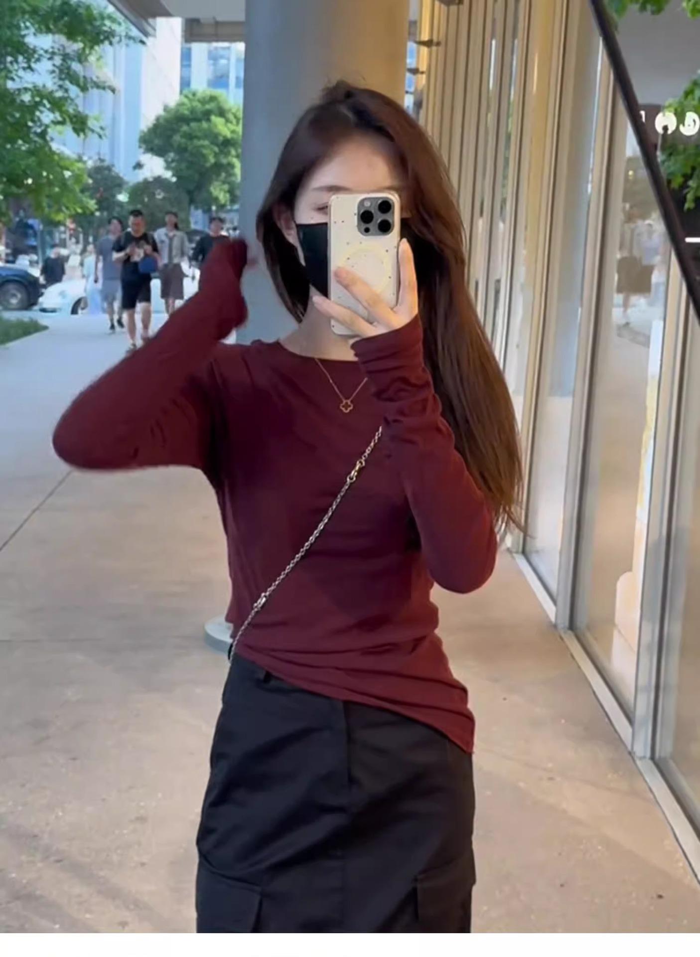 Camiseta de Manga Larga con Hombro Descubierto Estilo Coreano Rojo Vino para Mujer Primavera y Otoño Ajustada Corta Interior Base Dulce y Picante Chic Top