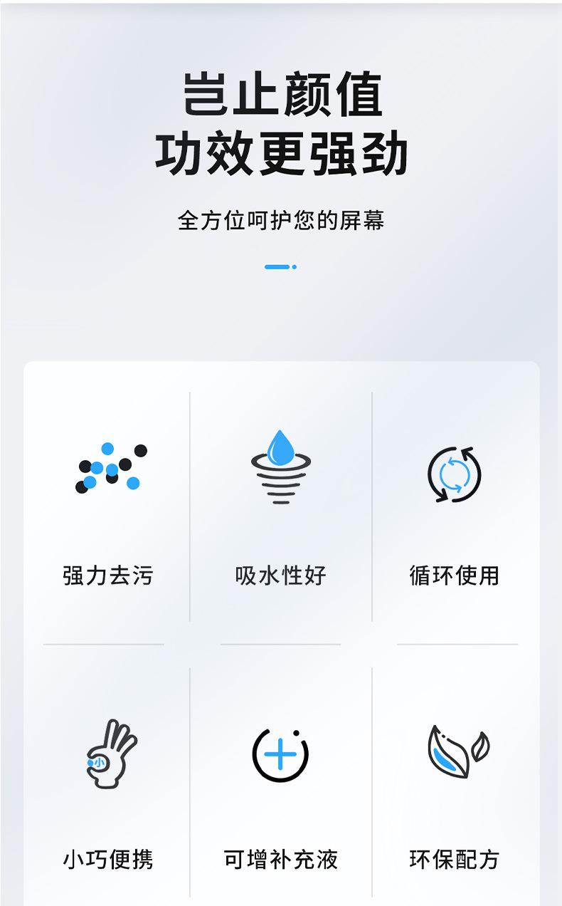 material del producto:Paño de fibra de alta adsorción+ABS+solución limpiadora;(Surfactante+agua desionizada+agente antibacteriano)