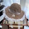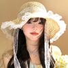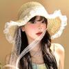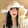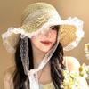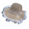 Sombrero de Paja con Cinta de Encaje para Mujer Verano Vacaciones en la Playa Junto al Mar Parasol y Protección Solar Sombrero de Sol Plegable