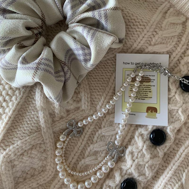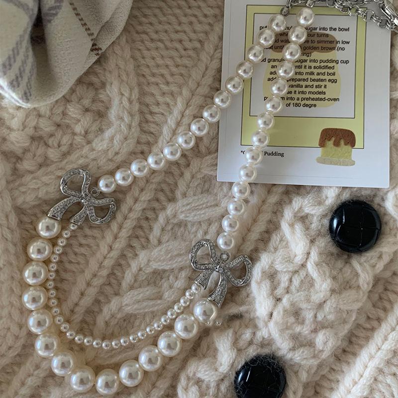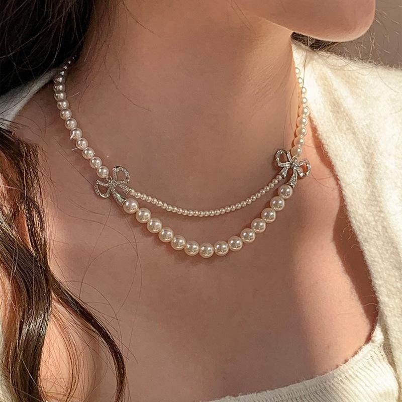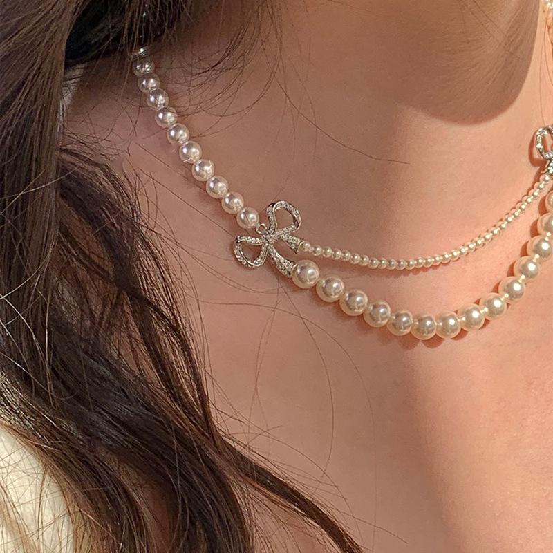 Collar de Perlas con Lazo de Doble Capa Incrustado de Diamantes para Mujer, Diseño de Nicho Personalizado, Cadena para Clavícula, Collar Simple de Alta Gama