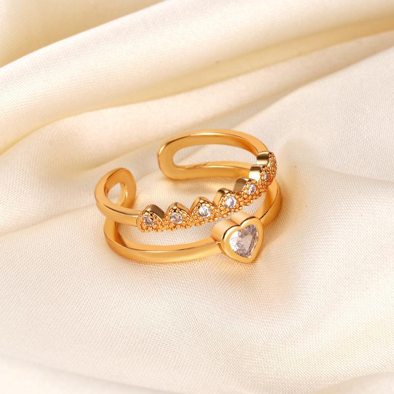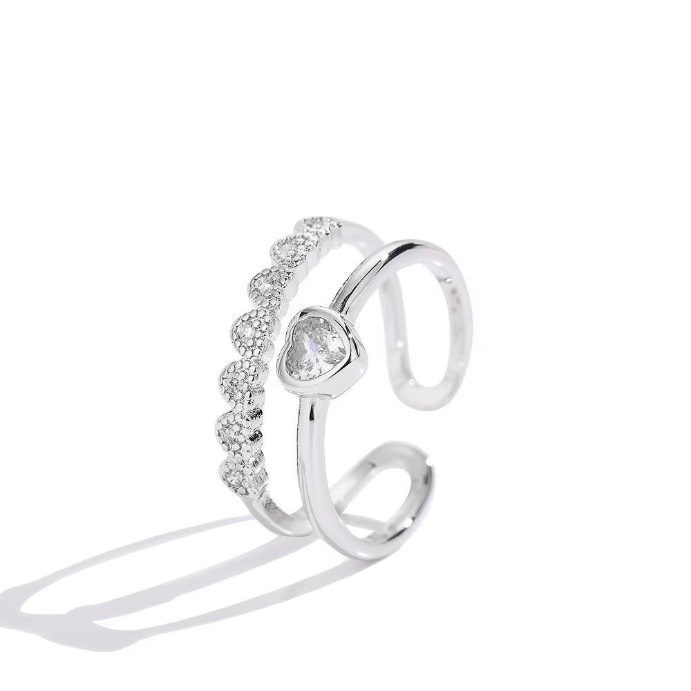 Versión Coreana de Nuevo Anillo Plateado Estrella Medio Corazón con Circonita Incrustada Anillo Abierto Creativo de Doble Capa Corazón Anillo de Diamantes