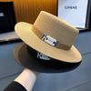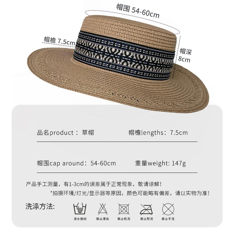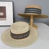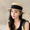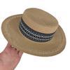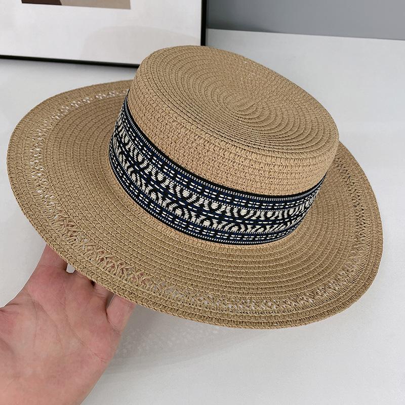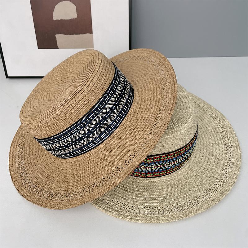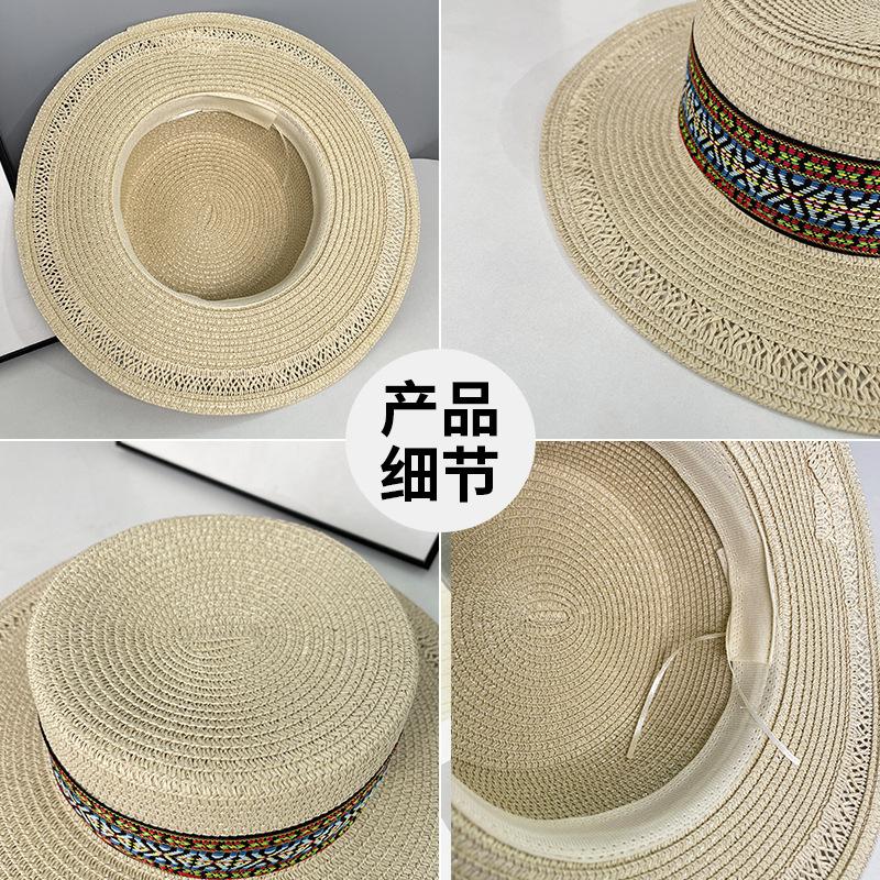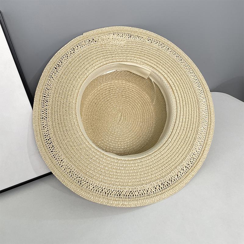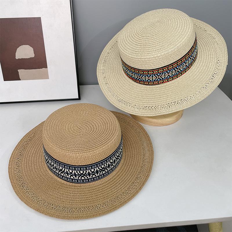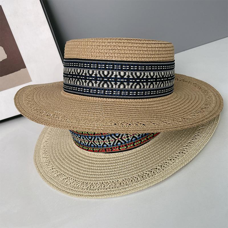 Sombrero de Paja de Copa Plana Estilo Bohemio para Mujer para Vacaciones de Verano, Playa Costera, Sombrero de Protección Solar, Versátil Sombrero Francés
