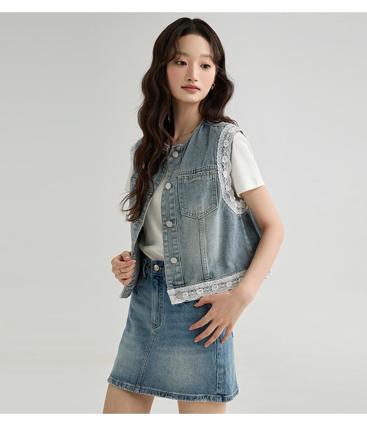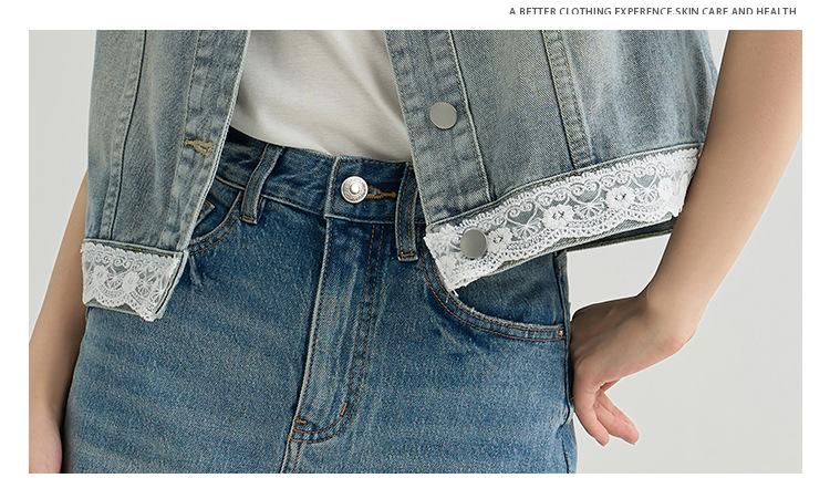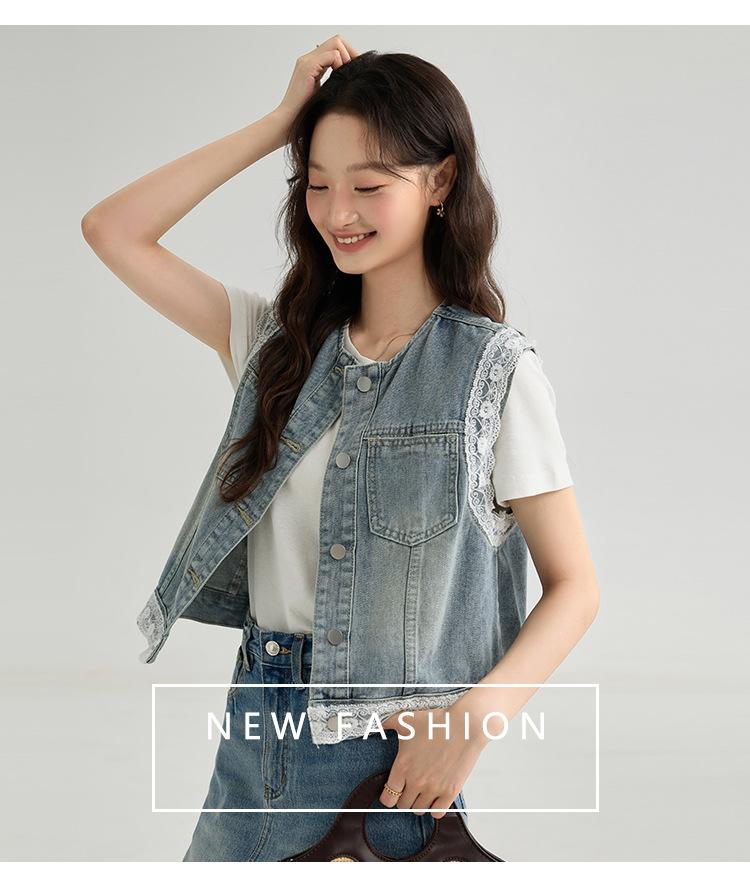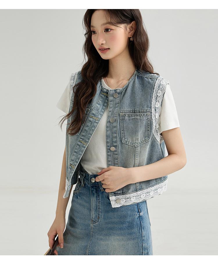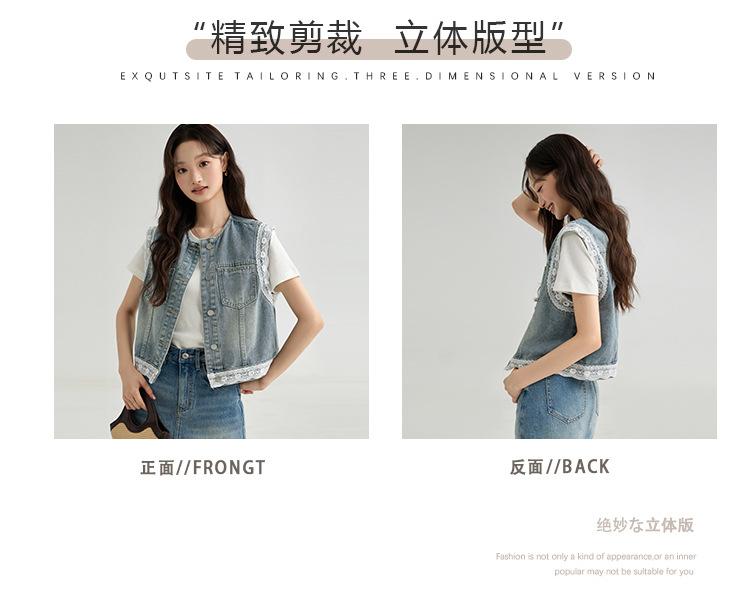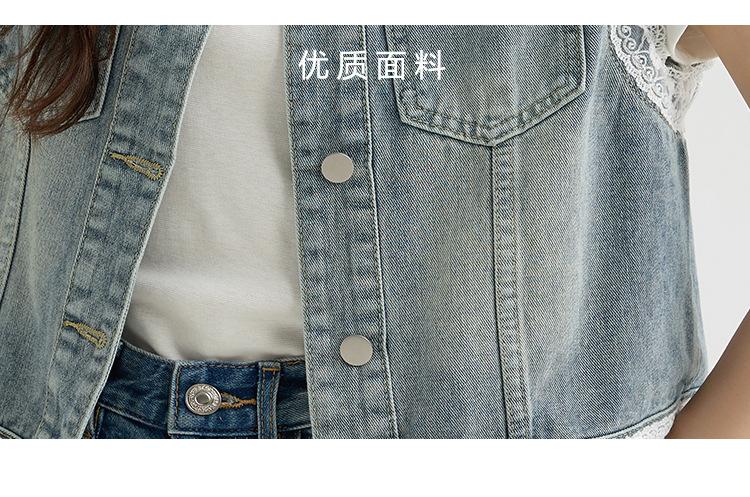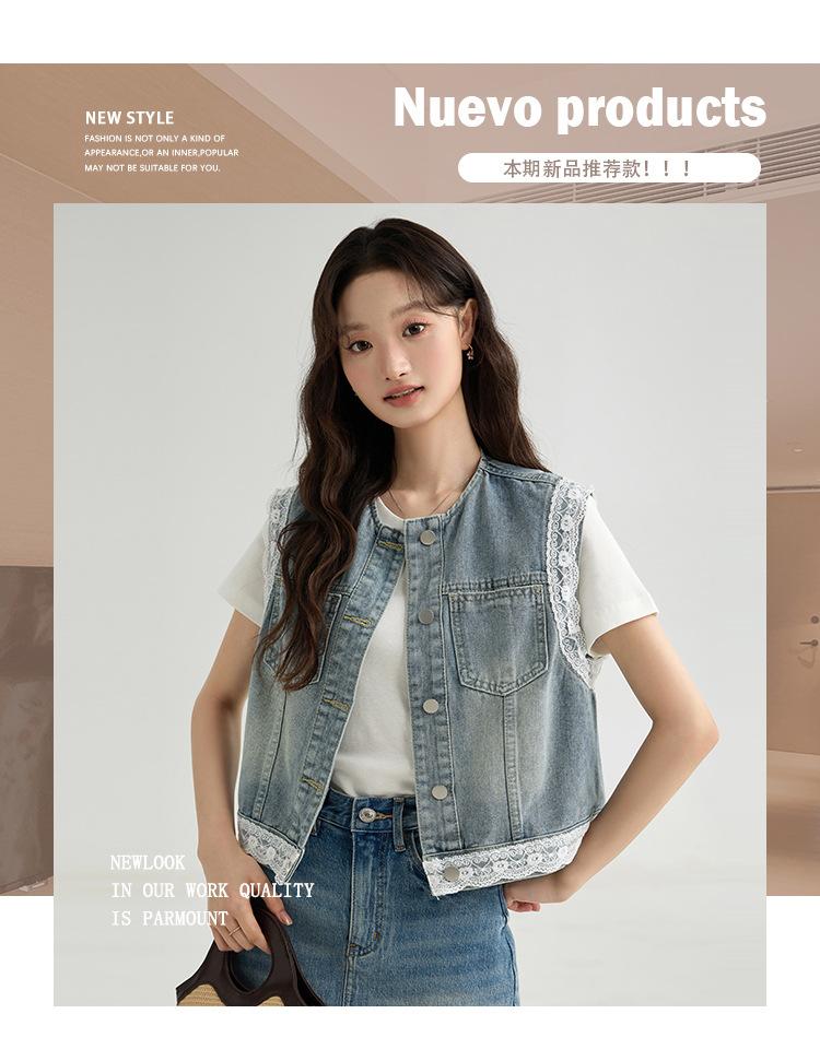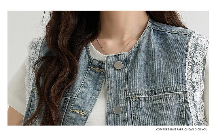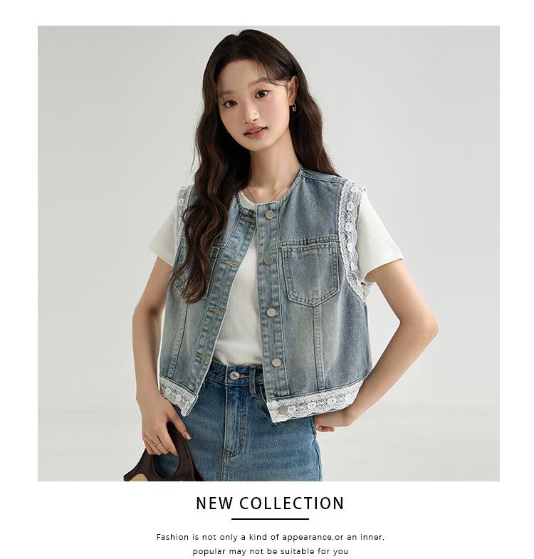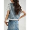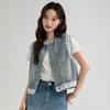 Chaqueta de mezclilla con encaje para mujer 2025 Verano Nuevo Moda Coreana Top Chaleco Corto de Cuello Redondo para Mujer