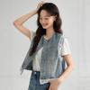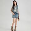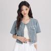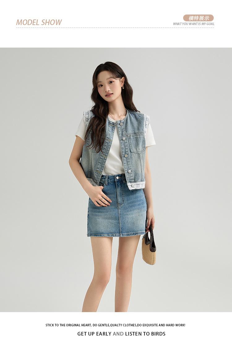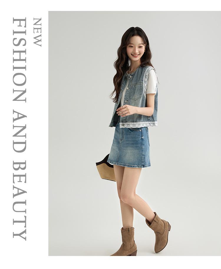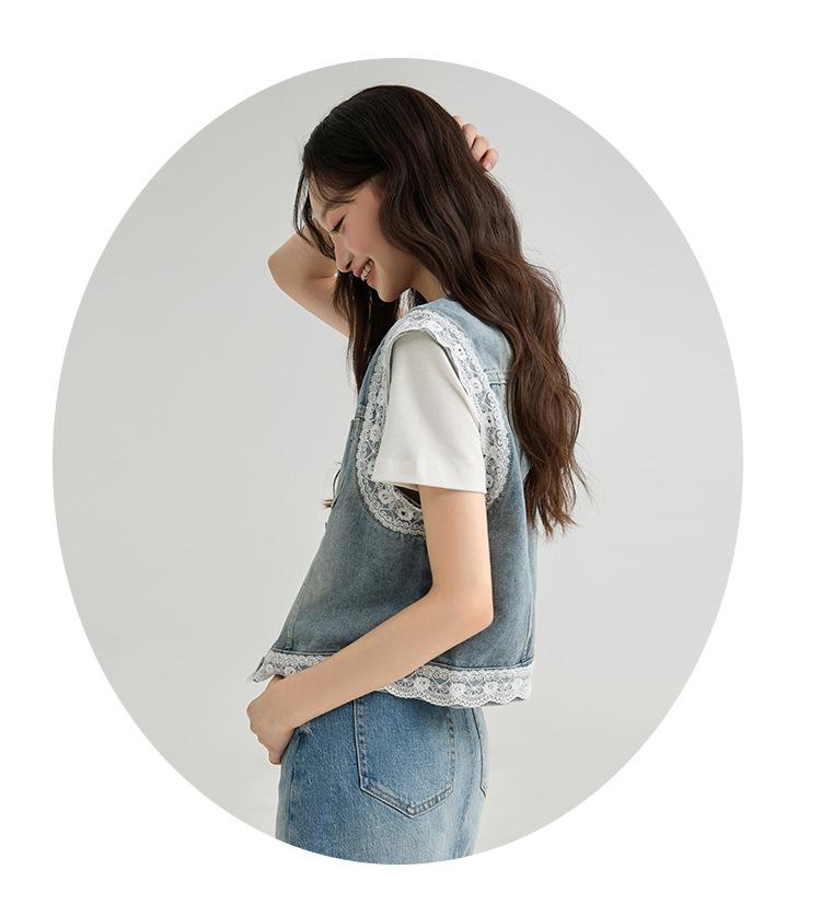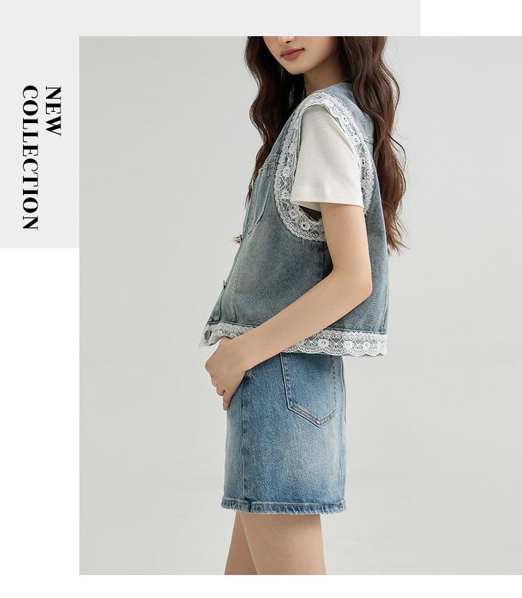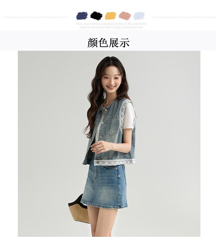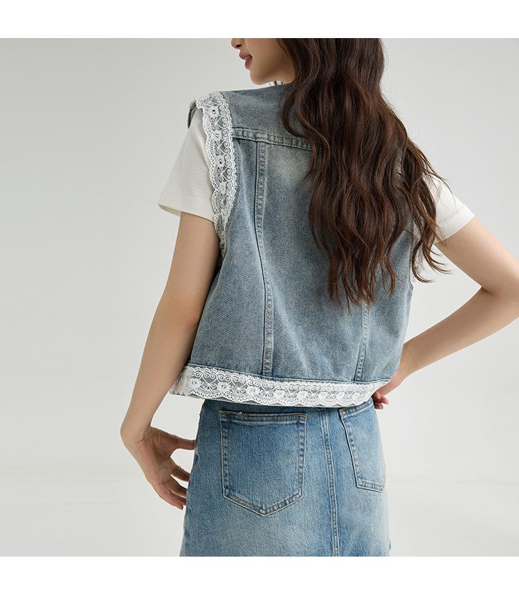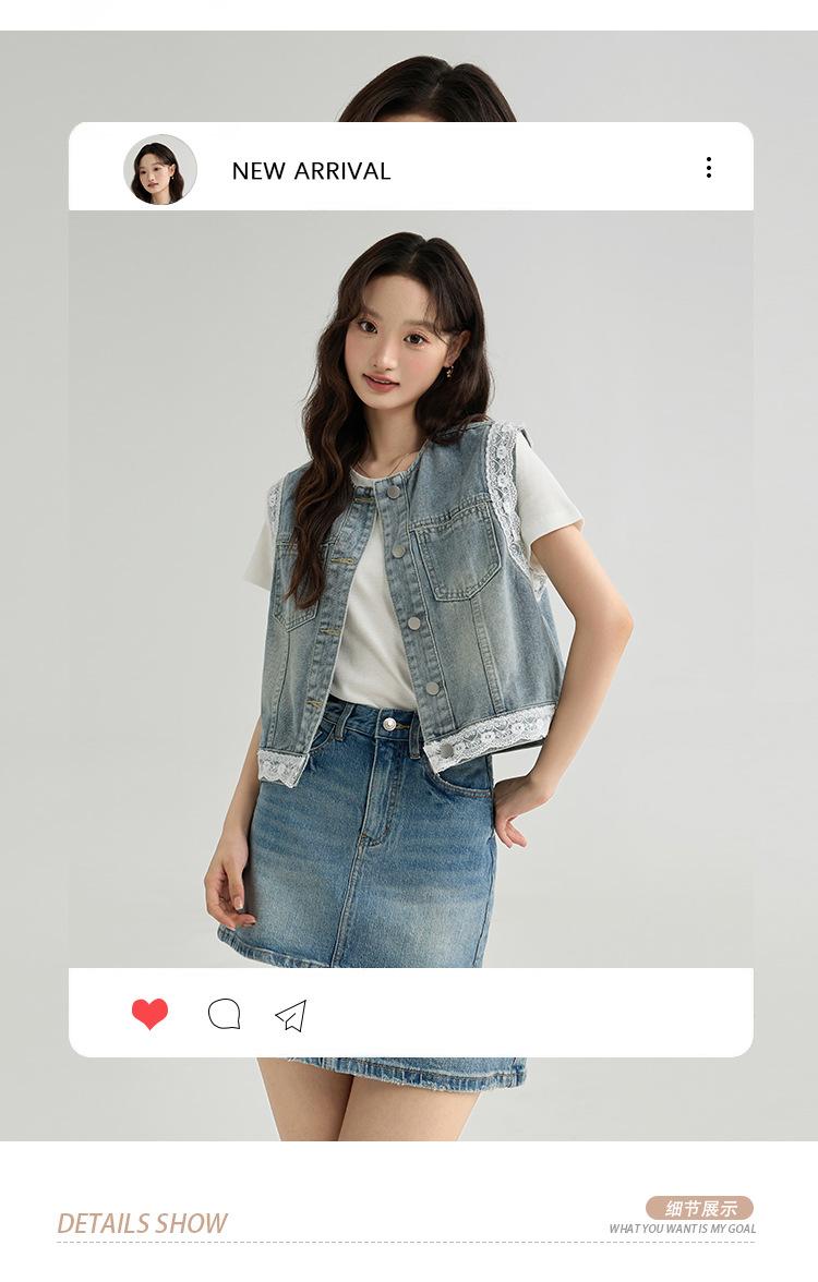 Chaqueta de mezclilla con encaje para mujer 2025 Verano Nuevo Moda Coreana Top Chaleco Corto de Cuello Redondo para Mujer
