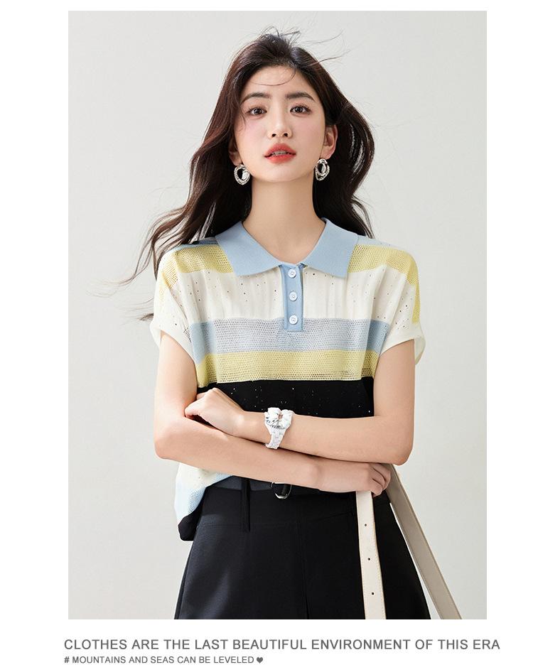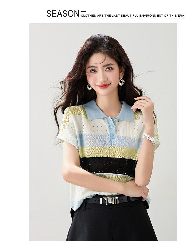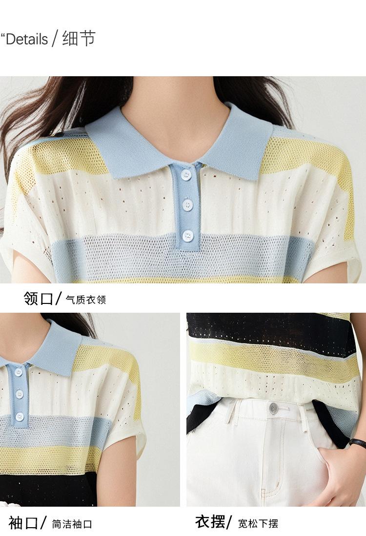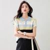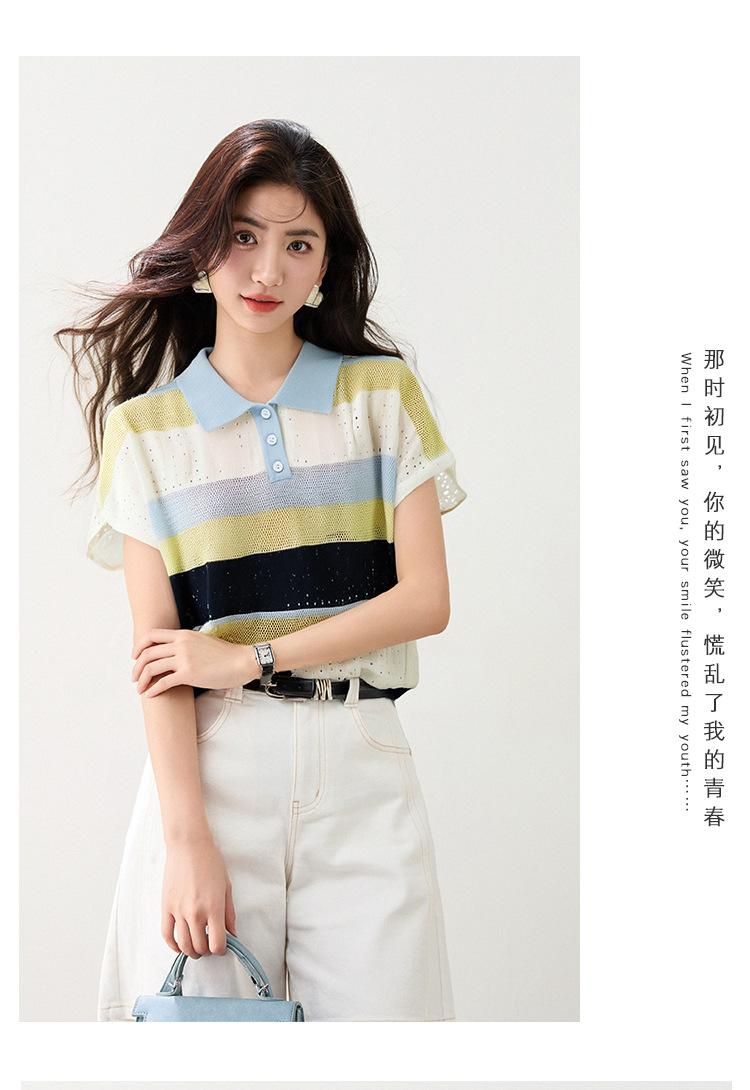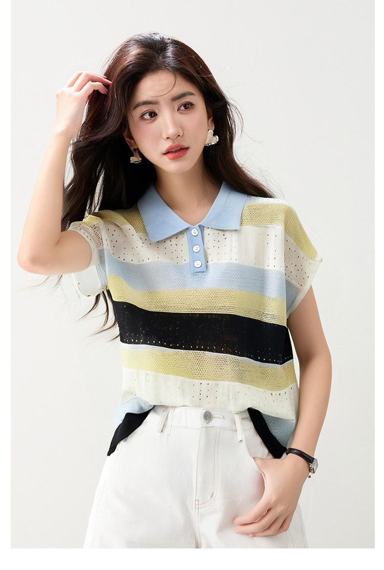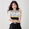 2025 Nuevo Verano Diseño de Moda Coreana Rayas Contrastantes Estilo Relajado Cuello Polo Manga Corta Top de Punto para Mujer