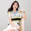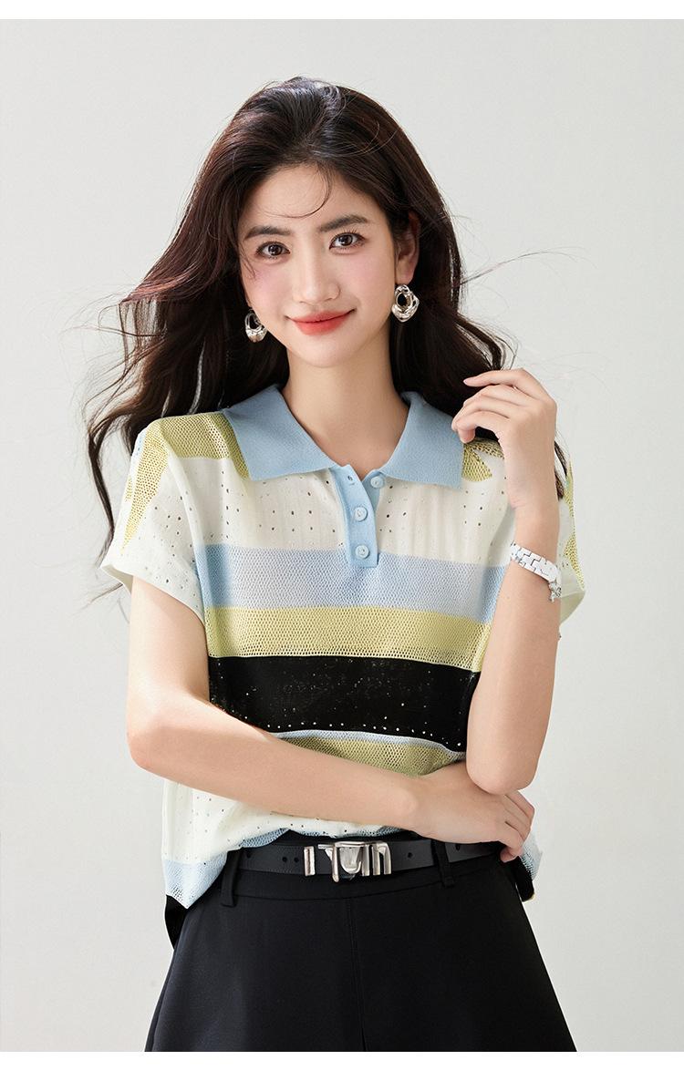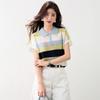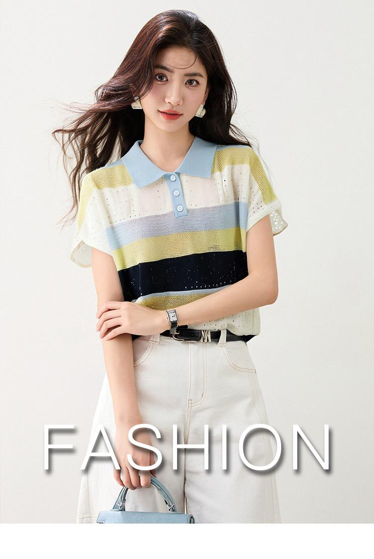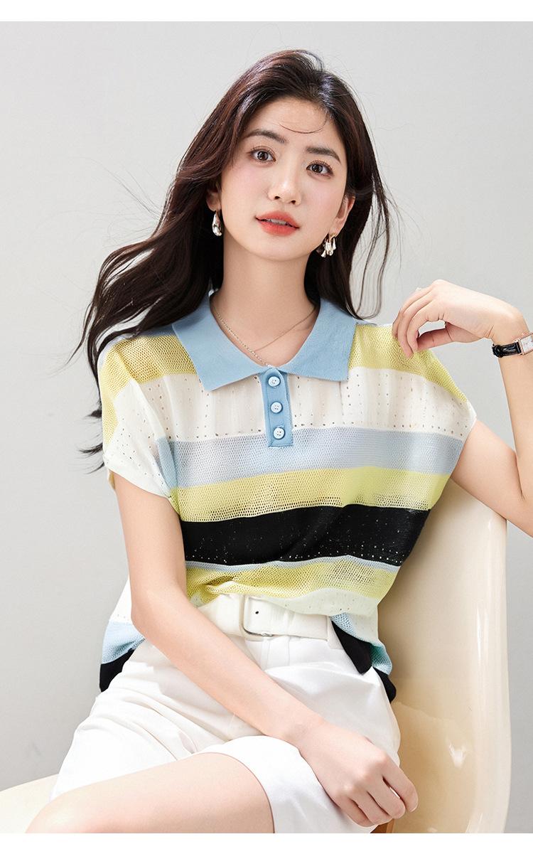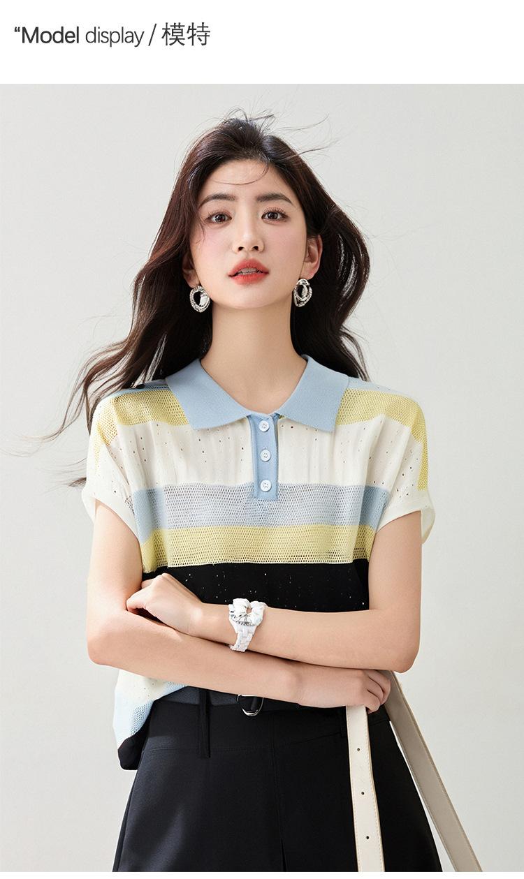 2025 Nuevo Verano Diseño de Moda Coreana Rayas Contrastantes Estilo Relajado Cuello Polo Manga Corta Top de Punto para Mujer