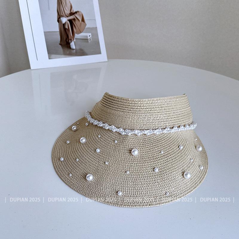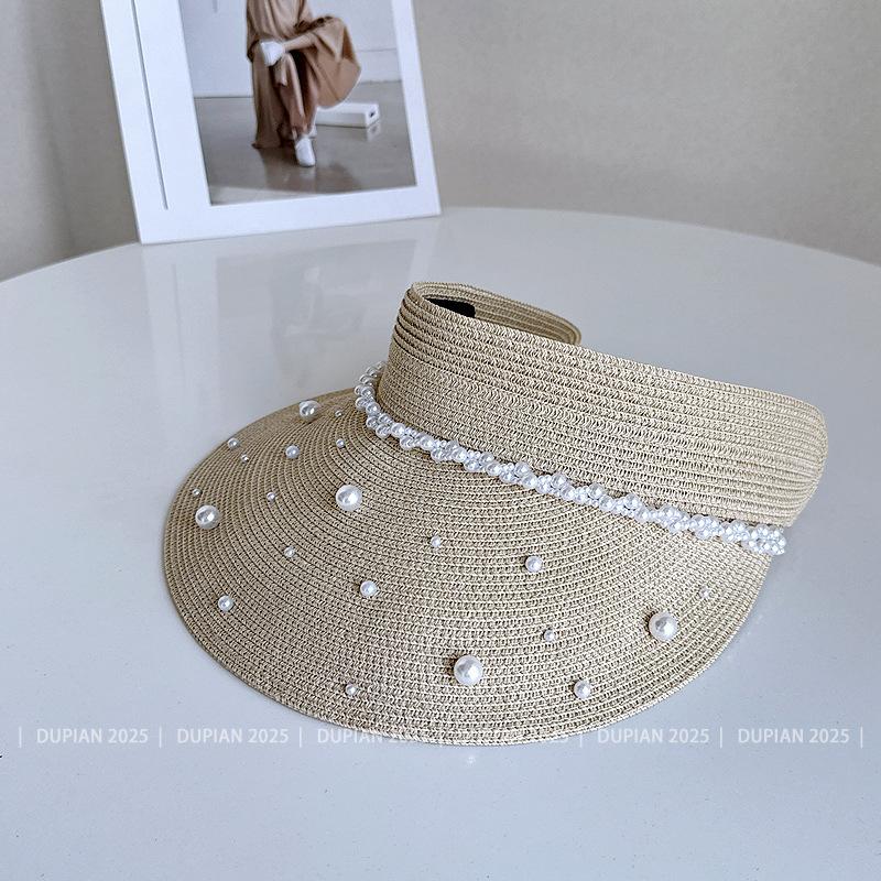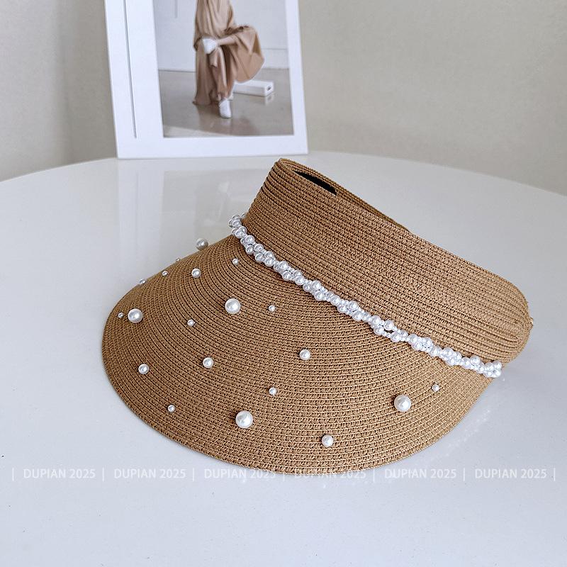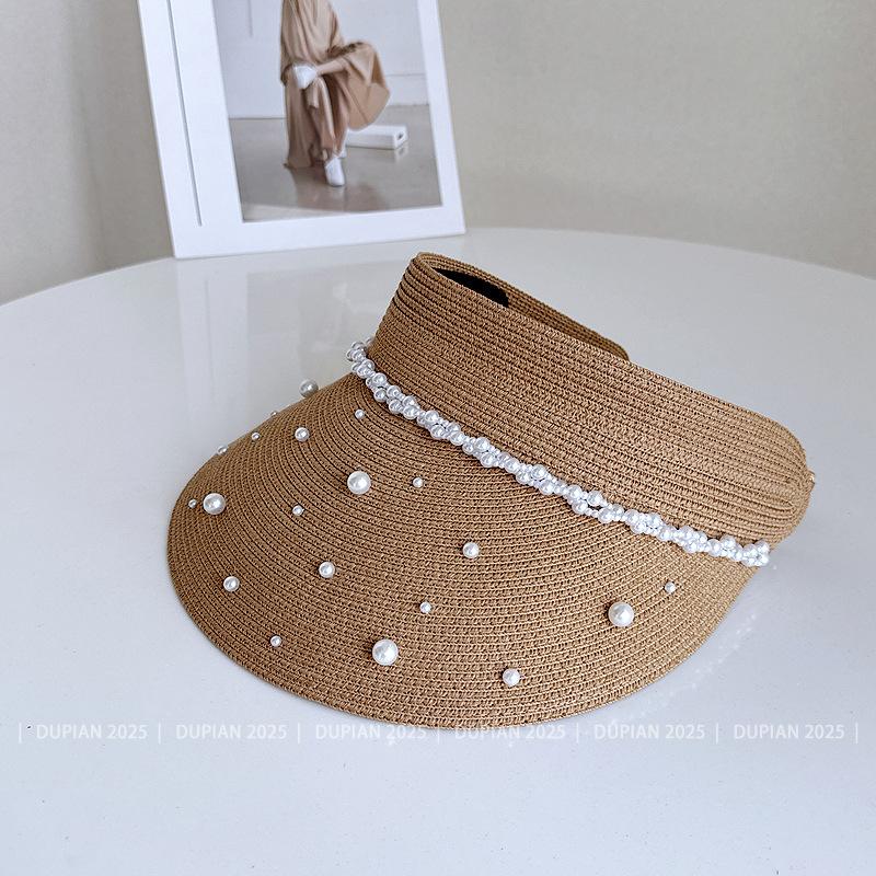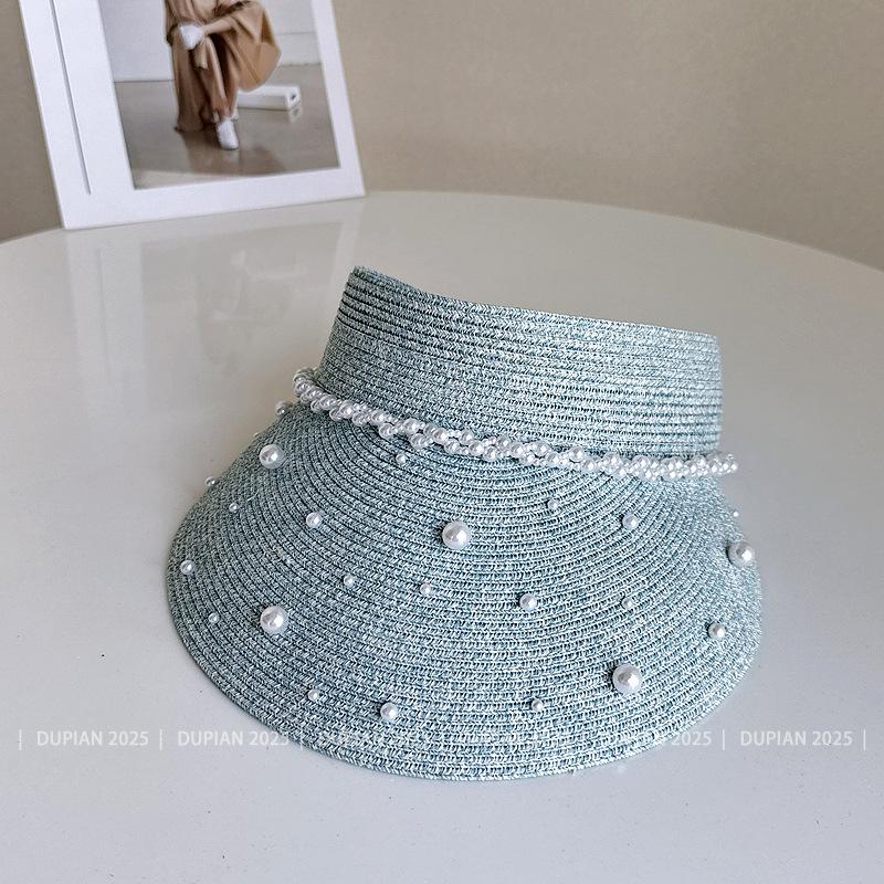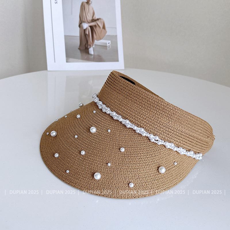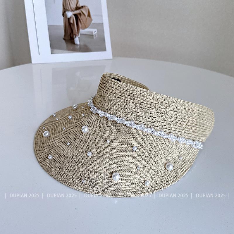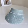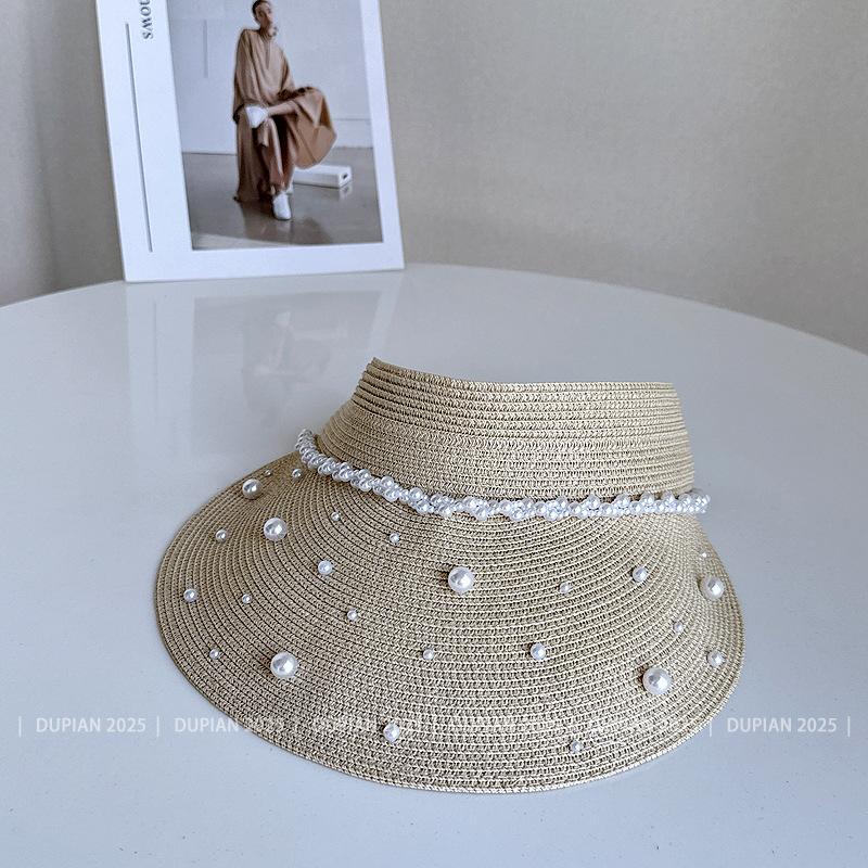 Sombrero de copa vacío decorativo de cadena de perlas de lujo ligero para mujer, sombrero de sol transpirable de verano con protección solar, sombrero de sol versátil para viajes de vacaciones