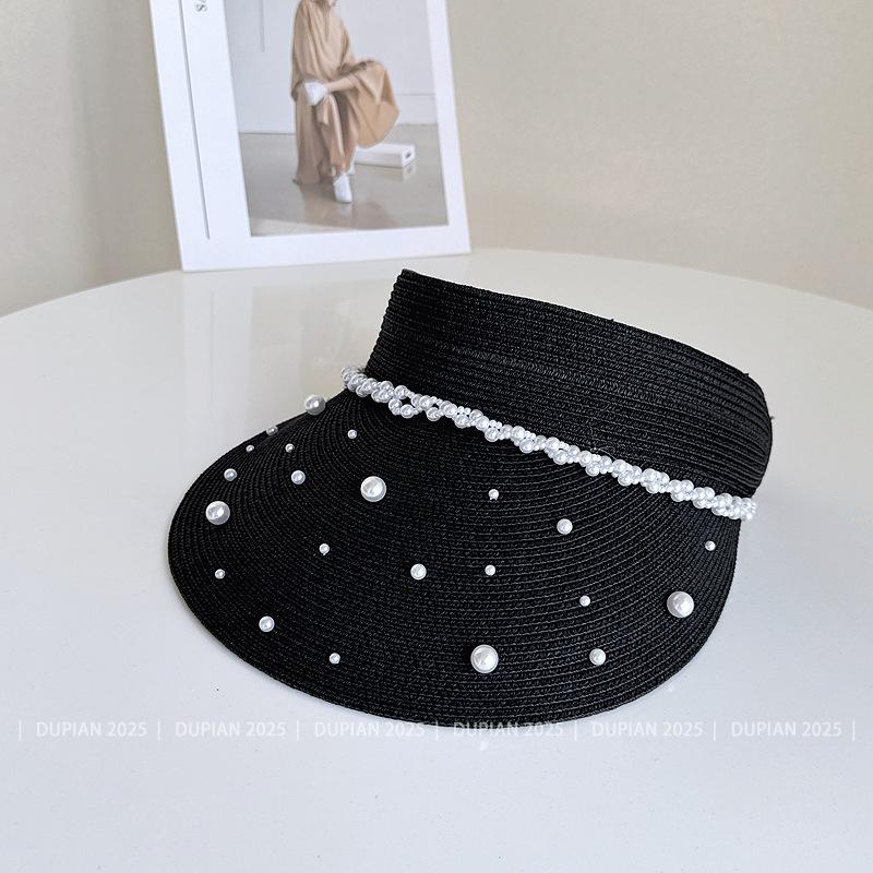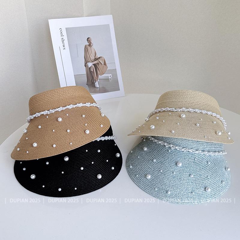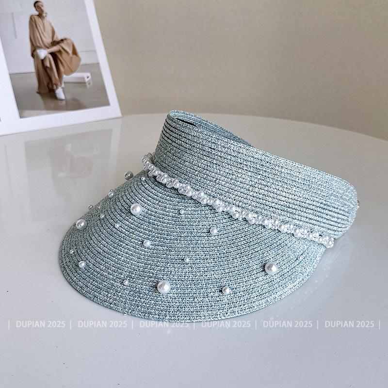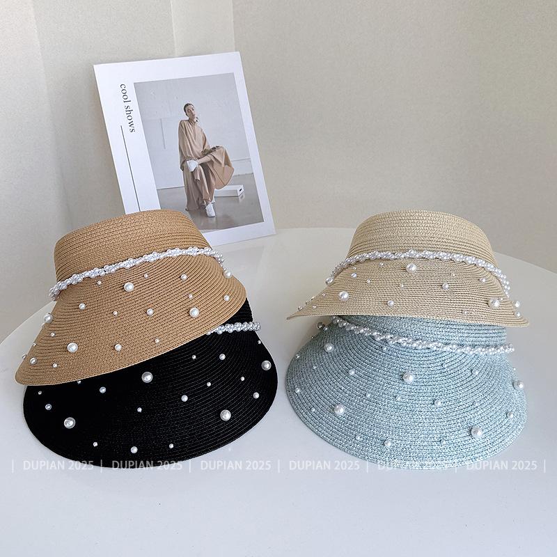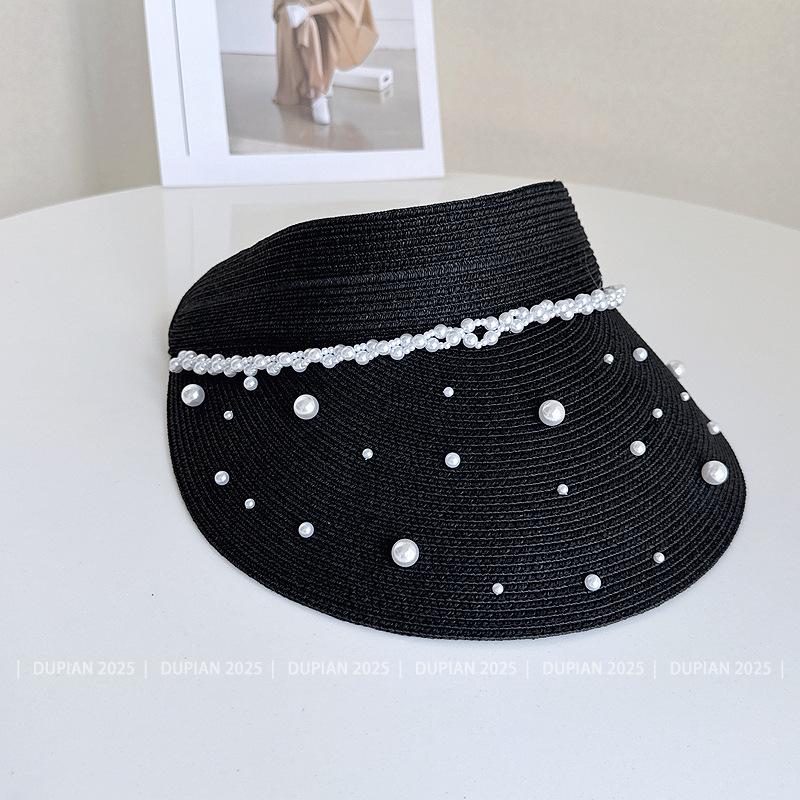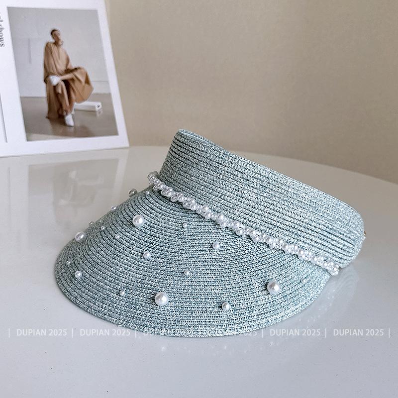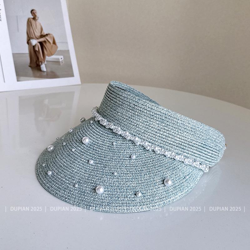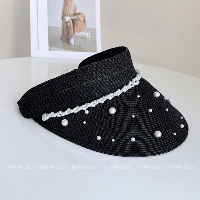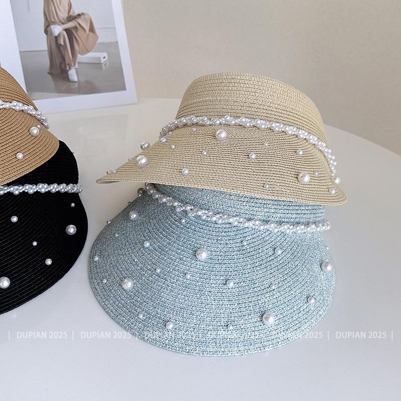 Sombrero de copa vacío decorativo de cadena de perlas de lujo ligero para mujer, sombrero de sol transpirable de verano con protección solar, sombrero de sol versátil para viajes de vacaciones
