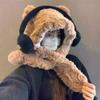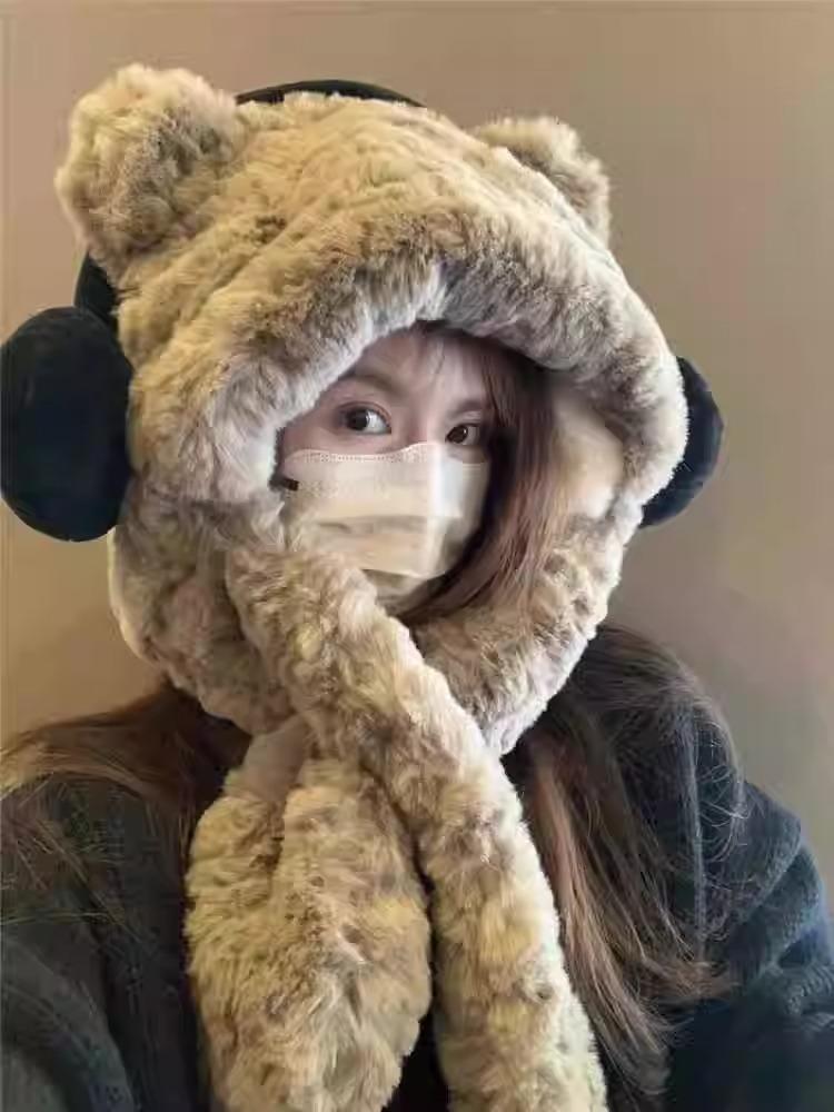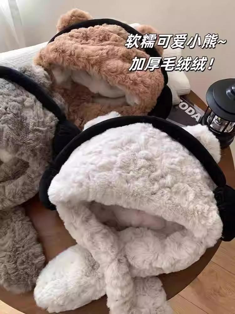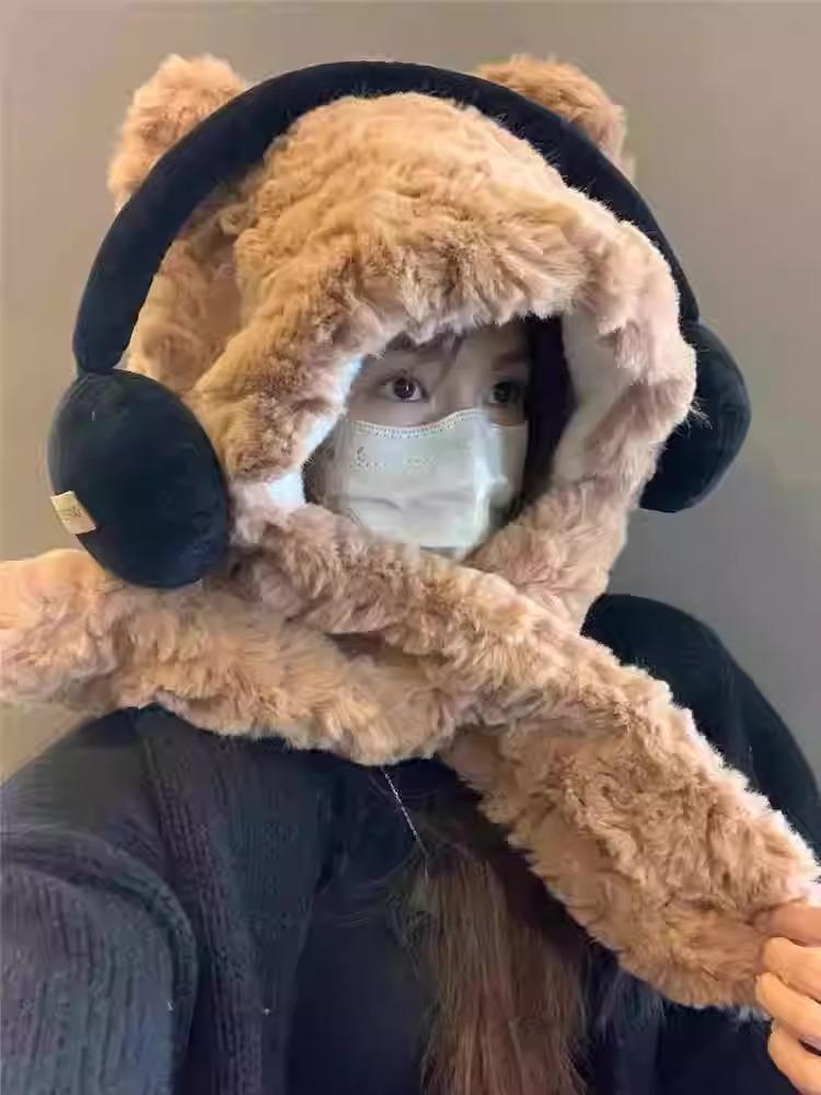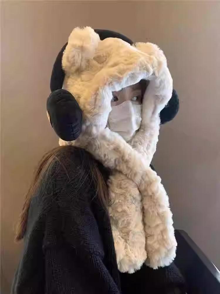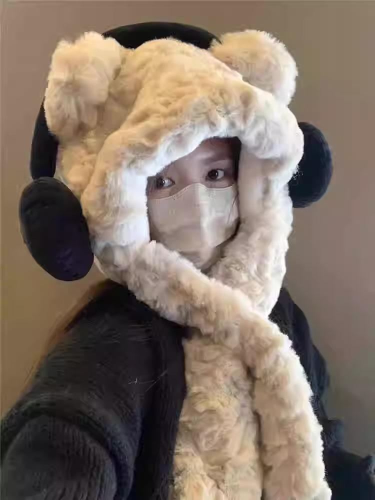 Nuevo Lindo Sombrero de Invierno Grueso para Mujer Felpa Cuello Integrado Protección para las Orejas Oso Cálido a Prueba de Frío Bufanda Sombrero Lei Feng