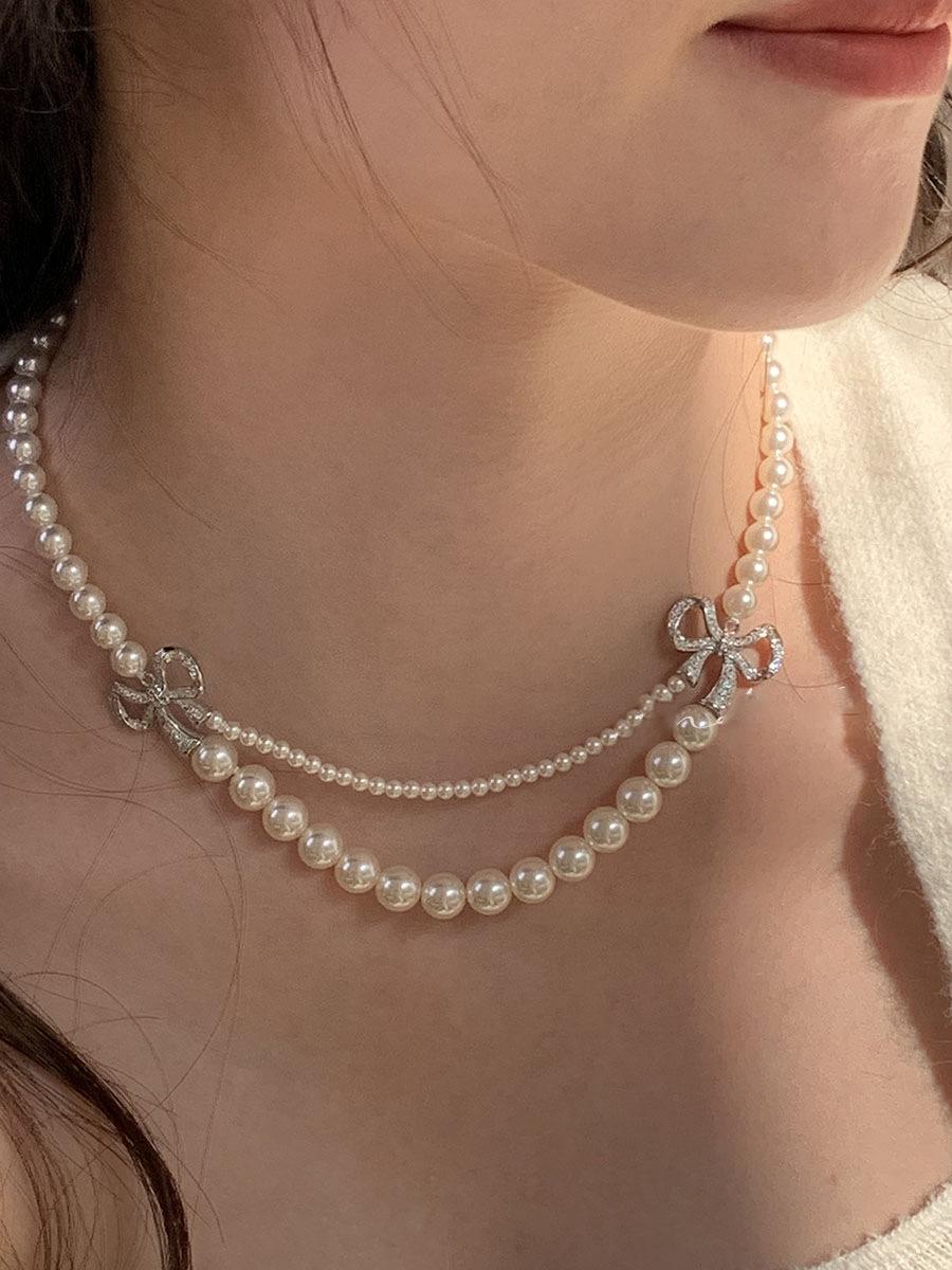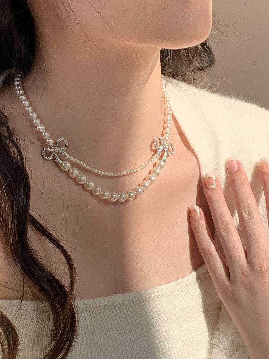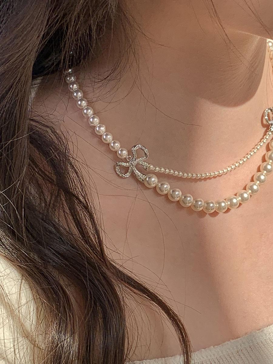 Plata diamante Lazo Doble capa Perla Cadena clavícula Moda Collar Exquisito Entrada Lujo Accesorios Collar de Alta Gama Mujeres